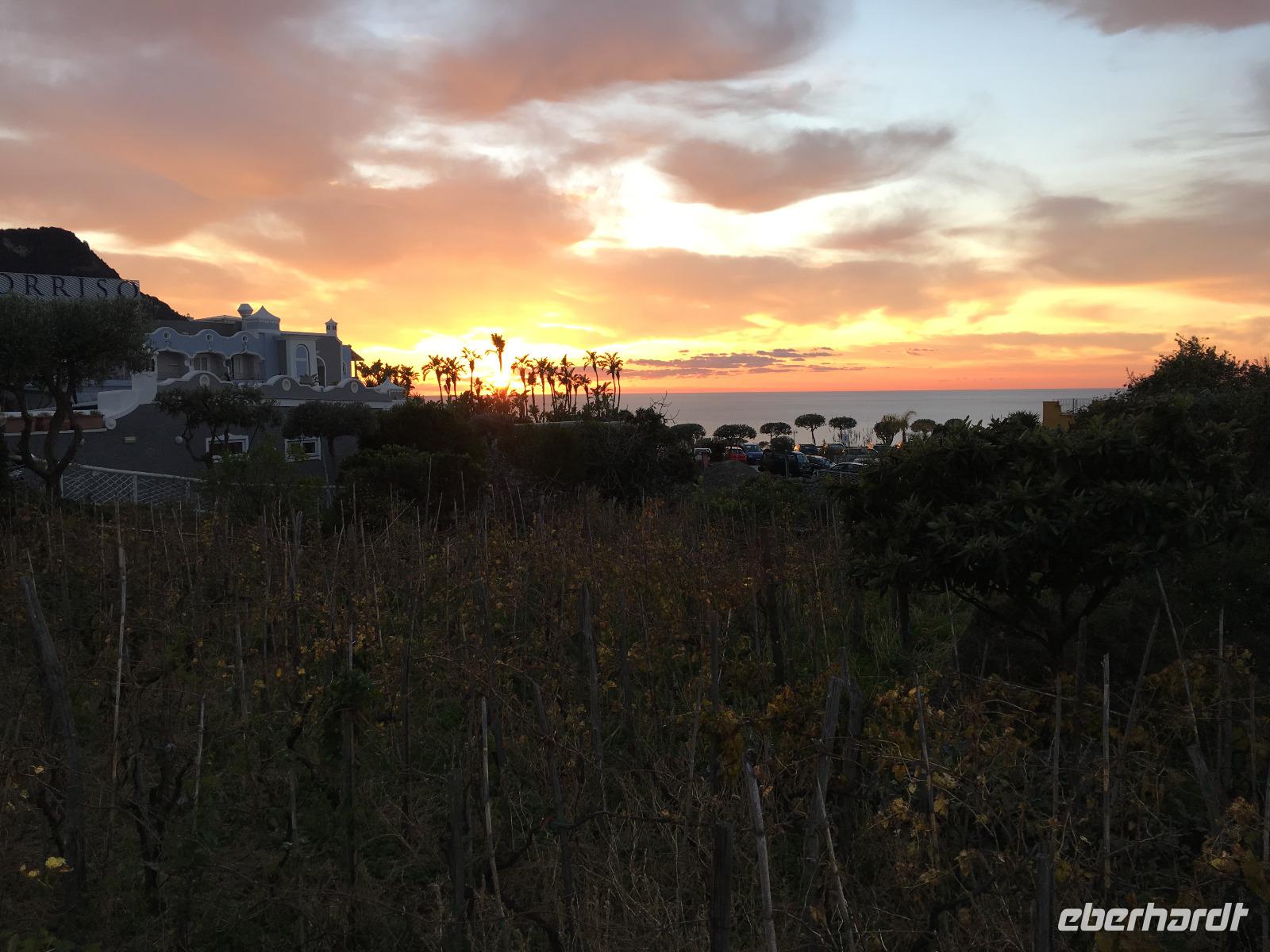 Am letzten Tag des Jahres unternehmen wir eine Wanderung durch die Weinberge der Insel. Am Aquädukt Pilastri erwartet uns Biagio und wir fahren gemeinsam nach Vatoliere. Zunächst geht es gemächlich durch Obst- und Gemüsegärten, dann aber sehr steil Richtung Monte di Vezzi auf circa 395 Meter hoch. Unterwegs ergeben sich wieder traumhafte Ausblicke auf die umliegende Landschaft und die vor uns steil abfallende Küste. Im Anschluss wandern wir durch die Weinberge von Piano Liguori. Am Ende des Panoramaweges erwartet uns das Agriturismo Pigniatello. Hier verbringen wir unsere Mittagspause. Der kleine Bauernhof - idyllisch in den Weinbergen gelegen - bietet uns einen faszinierenden Blick auf Capri, Sorrent sowie den Golf von Neapel und den Vesuv. Bei schönstem Wetter genießen wir abermals schmackhafte Bruschetta, Spaghetti Aioli, Schinken, Käse sowie Vino de Casa - alles liebevoll vom Hausherrn Giuseppe sowie Hausfrau Maria zubereitet! Der Abschied fällt hier wirklich schwer aber nach knapp 2 Stunden brechen wir wieder auf nach Campagnano. Bevor wir zurück zum Bus laufen, lassen wir die Wanderung bei einem kleinen Umtrunk ausklingen. Mit Limoncello und Rucolino - eine ischitanische Spezialität aus Rucola-Blättern - stimmen wir uns auf den heutigen Silvesterabend ein. Im Hotel wieder angekommen, ruhen wir uns noch ein wenig aus, um für den bevorstehenden Abend fit zu sein. Um 19:30 Uhr eröffnet der Hoteldirektor auf seine enthusiastische Art und Weise mit einem Aperitif den Abend. Ab 20:00 Uhr werden wir pausenlos mit feinstem Essen verwöhnt. Wir lassen das Jahr bei Live-Tanzmusik und viel zu viel Essen ausklingen :-) Um Mitternacht bestaunen wir das Feuerwerk in unserer Hotelanlage...