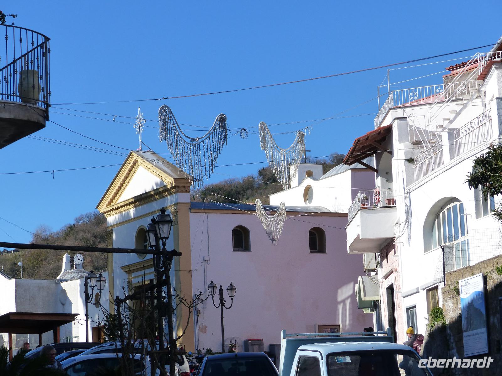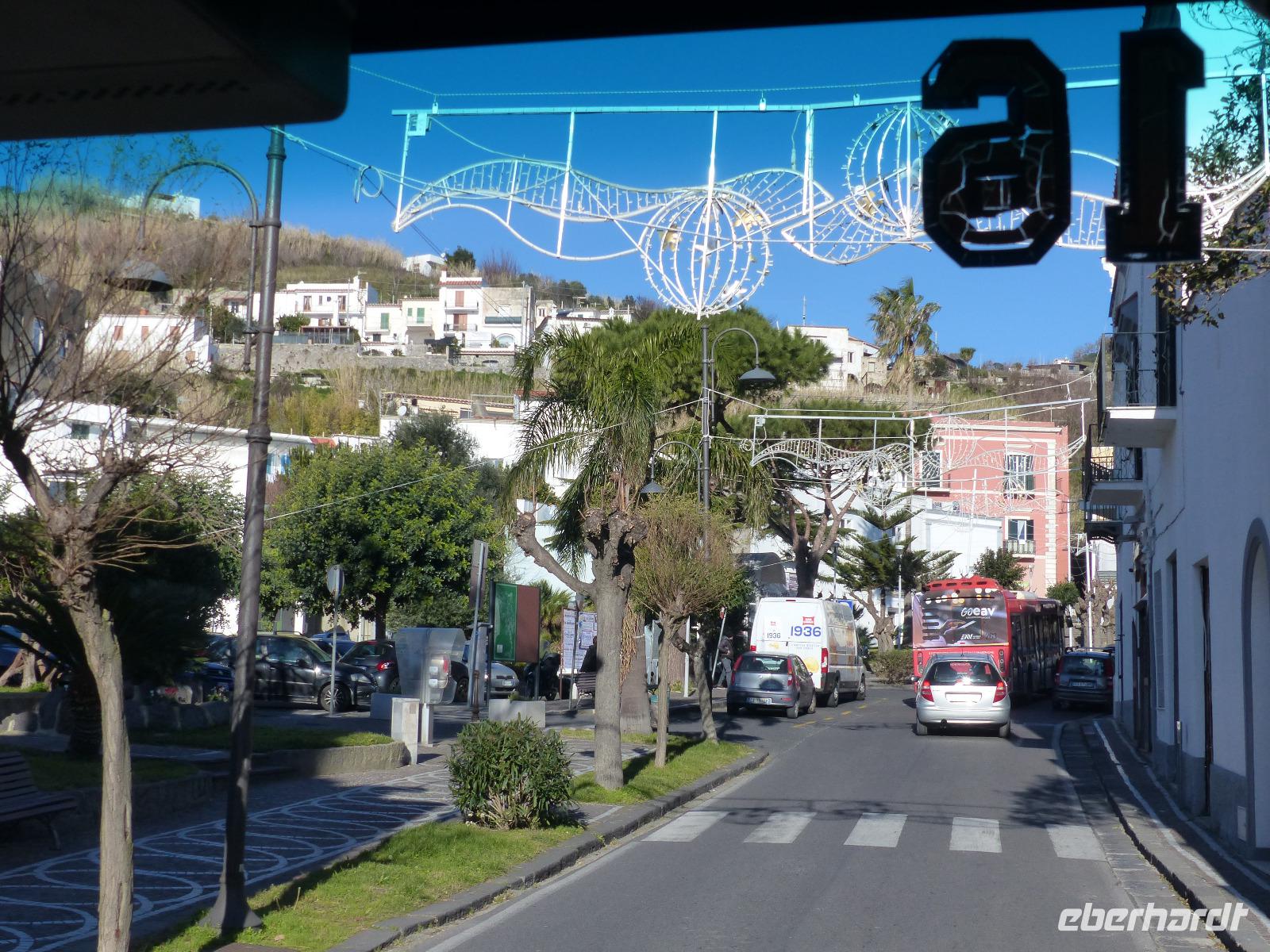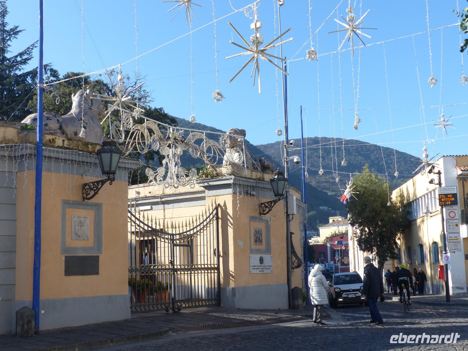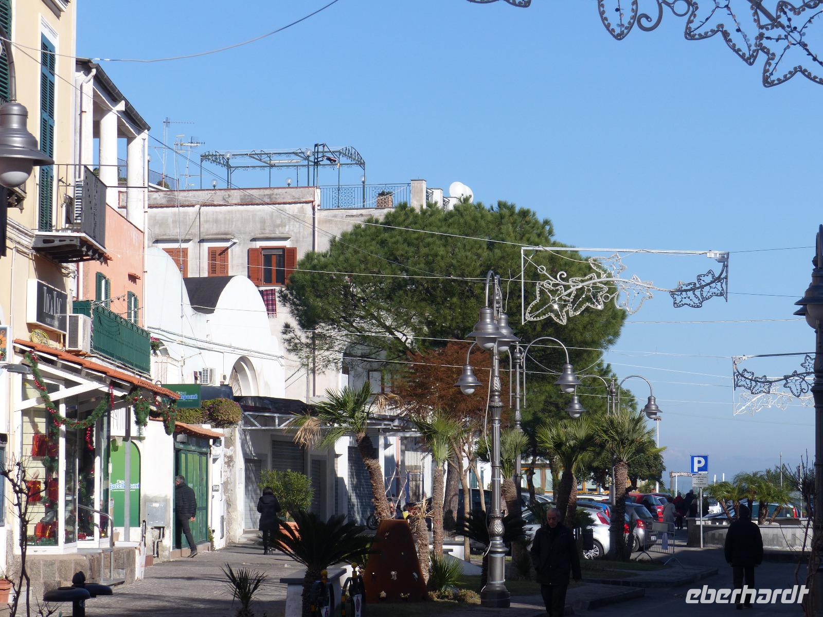 Es ging für die meisten von uns schon sehr früh los, denn viele Gäste flogen oder fuhren von verschiedenen Orten aus morgens nach Frankfurt, von wo aus ein großer Teil der Gruppe am späten Vormittag nach Neapel flog. Dort trafen wir dann noch einige Gäste, die auf anderen Wegen angereist waren. Der Bus brachte uns an den Hafen von Neapel, denn von dort fuhren wir mit dem Schiff nach Ischia. Die Sonne schien aber es war viel kälter als wir erwartet hatten. Ischia empfing uns in der Dämmerung und überall funkelte uns Weihnachtsbeleuchtung entgegen. Sterne, Blumen, Lichtergirlanden in weiß, gelb, rot und blau. Blinkende Lichterbäume und Figuren. Als wir das Hotel erreichten, war bereits die Dunkelheit über Ischia hereingebrochen. Nachdem wir unsere Zimmer bezogen und gegessen hatten fielen wir müde ins Bett. Diese erste Nacht hatte allerdings ihre Tücken denn eine Party versorgte uns zunächst mit Musik. Die meisten Gäste ließen sich nicht stören, aber wer einen leichten Schlaf hat kam erst am späten Abend zur Ruhe. Zum Glück blieb diese Party ein einmaliges Erlebnis, denn den Rest der Woche hatten wir nachts unsere Ruhe.