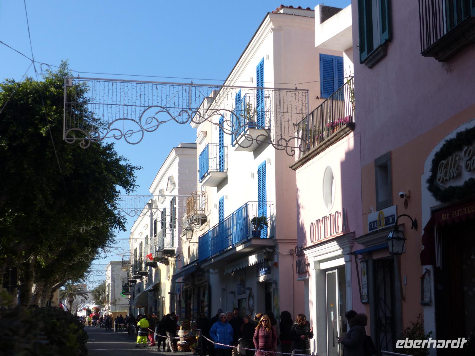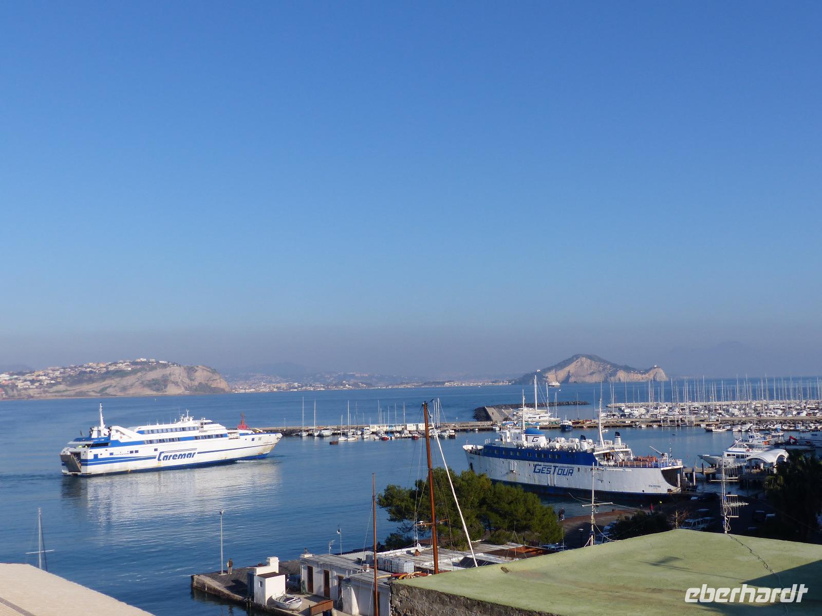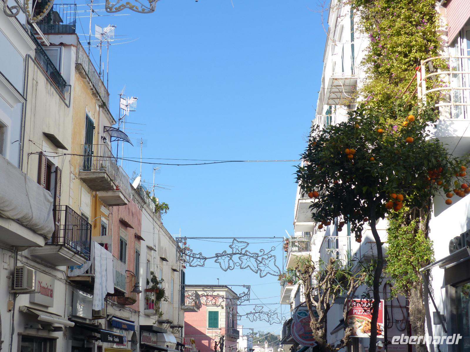 Es ging für die meisten von uns schon sehr früh los, denn viele Gäste flogen oder fuhren von verschiedenen Orten aus morgens nach Frankfurt, von wo aus ein großer Teil der Gruppe am späten Vormittag nach Neapel flog. Dort trafen wir dann noch einige Gäste, die auf anderen Wegen angereist waren. Der Bus brachte uns an den Hafen von Neapel, denn von dort fuhren wir mit dem Schiff nach Ischia. Die Sonne schien aber es war viel kälter als wir erwartet hatten. Ischia empfing uns in der Dämmerung und überall funkelte uns Weihnachtsbeleuchtung entgegen. Sterne, Blumen, Lichtergirlanden in weiß, gelb, rot und blau. Blinkende Lichterbäume und Figuren. Als wir das Hotel erreichten, war bereits die Dunkelheit über Ischia hereingebrochen. Nachdem wir unsere Zimmer bezogen und gegessen hatten fielen wir müde ins Bett. Diese erste Nacht hatte allerdings ihre Tücken denn eine Party versorgte uns zunächst mit Musik. Die meisten Gäste ließen sich nicht stören, aber wer einen leichten Schlaf hat kam erst am späten Abend zur Ruhe. Zum Glück blieb diese Party ein einmaliges Erlebnis, denn den Rest der Woche hatten wir nachts unsere Ruhe.