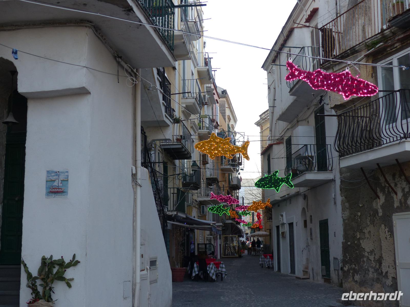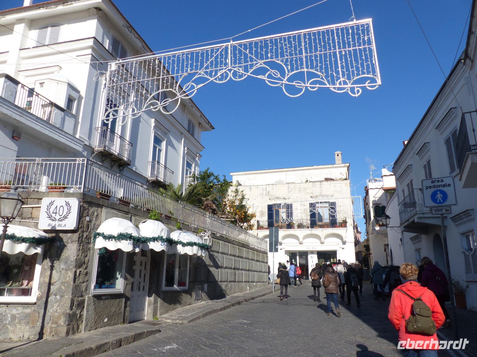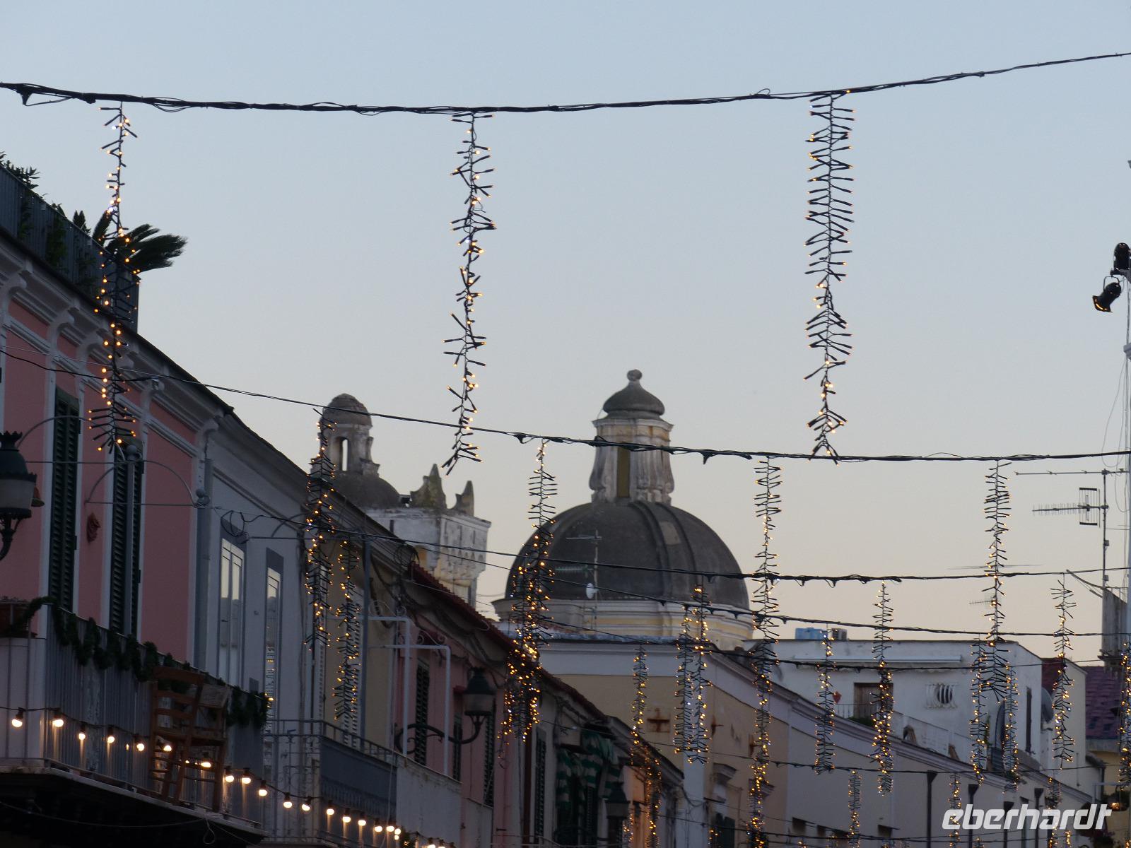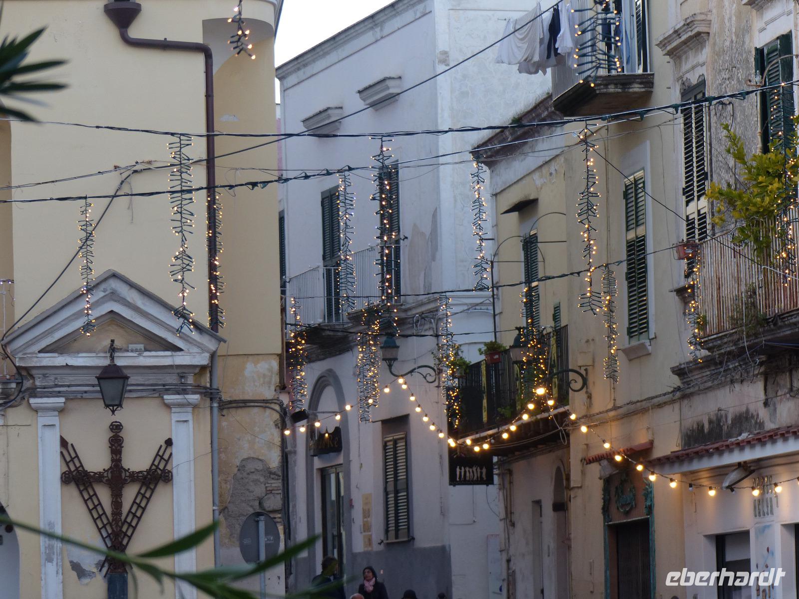 Es ging für die meisten von uns schon sehr früh los, denn viele Gäste flogen oder fuhren von verschiedenen Orten aus morgens nach Frankfurt, von wo aus ein großer Teil der Gruppe am späten Vormittag nach Neapel flog. Dort trafen wir dann noch einige Gäste, die auf anderen Wegen angereist waren. Der Bus brachte uns an den Hafen von Neapel, denn von dort fuhren wir mit dem Schiff nach Ischia. Die Sonne schien aber es war viel kälter als wir erwartet hatten. Ischia empfing uns in der Dämmerung und überall funkelte uns Weihnachtsbeleuchtung entgegen. Sterne, Blumen, Lichtergirlanden in weiß, gelb, rot und blau. Blinkende Lichterbäume und Figuren. Als wir das Hotel erreichten, war bereits die Dunkelheit über Ischia hereingebrochen. Nachdem wir unsere Zimmer bezogen und gegessen hatten fielen wir müde ins Bett. Diese erste Nacht hatte allerdings ihre Tücken denn eine Party versorgte uns zunächst mit Musik. Die meisten Gäste ließen sich nicht stören, aber wer einen leichten Schlaf hat kam erst am späten Abend zur Ruhe. Zum Glück blieb diese Party ein einmaliges Erlebnis, denn den Rest der Woche hatten wir nachts unsere Ruhe.