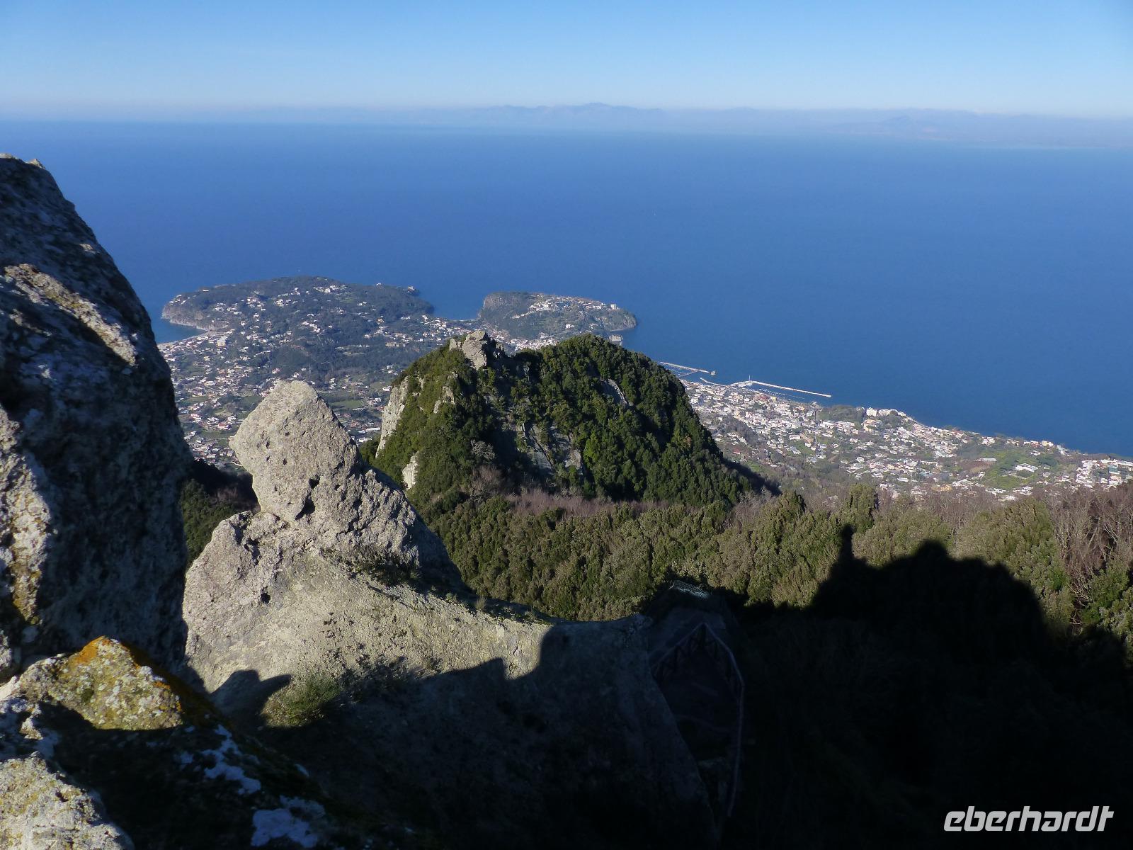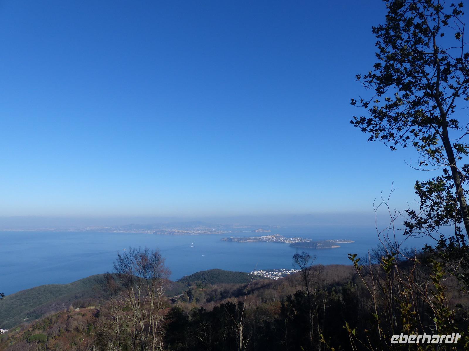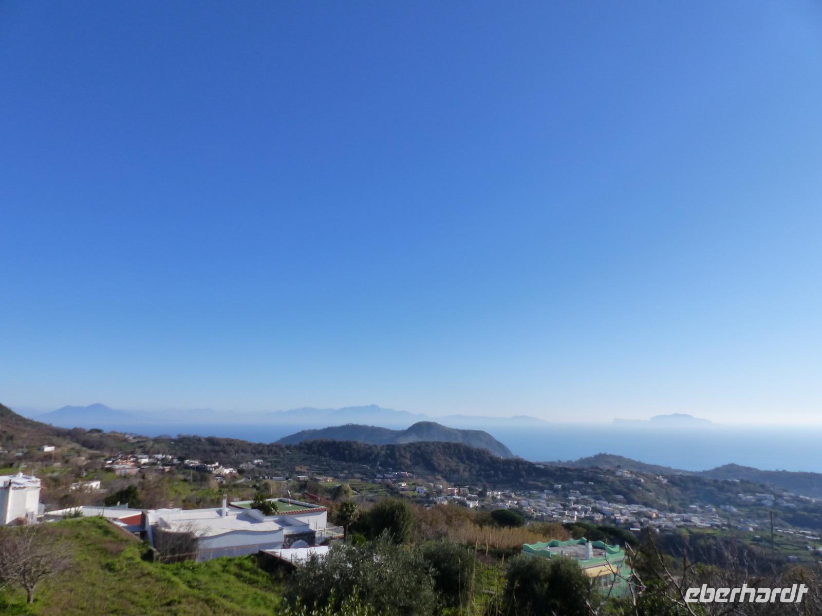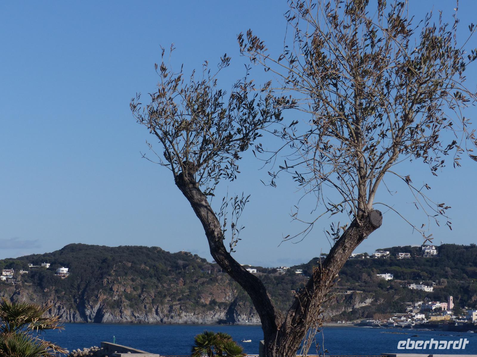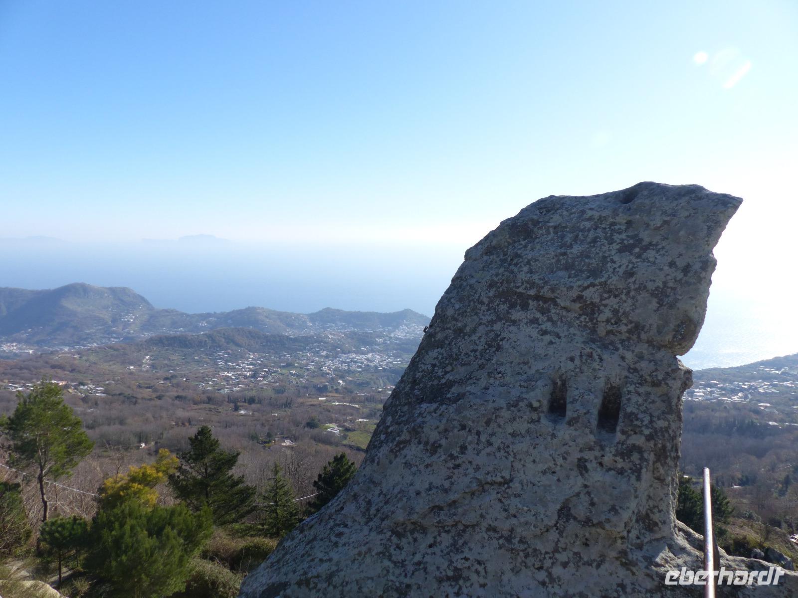 Ein weiterer Tag Freizeit folgte. Wer gerne wandern wollte, der konnte mit mir an diesem strahlend blauen Tag auf den höchsten Inselberg, den Monte Epomeo wandern. Die anderen vergnügten sich auf ihre Weise, bummelten durch die Läden, genossen die Inselspezialitäten, saßen in der Sonne oder badeten gar im Meer, denn in Sorgeto mischt sich das warme Thermalwasser mit dem Meerwasser in natürlichen Becken, so dass man hier auch im Winter ohne die Tugenden eines Eisbaders in die Fluten springen kann. Die Wanderer begannen den Tag mit einer Taxifahrt nach Fontana und kehrten hier zuerst mal ein. Cappuccino, Espresso und Sfogliatelle. Dieses Gebäck ist typisch für die Region, besteht aus Blätterteig mit einer leckeren nur leicht süßen Ricottafüllung. Teilweise packten wir die Teile ein für unterwegs. Dann ging's los. Der Aufstieg erfolgte über eine kleine Straße und durch eine Schlucht auf einem Fußweg. Nach 45 Minuten war er geschafft. Dann erreichten wir den Kastanienwald. Raschelndes Laub und strahlende Sonne. Tifeo oder Typhon, der Herr der heißen Taifune, soll, wenn man einer Geschichte der Mythologie glaubt, unter Ischia lebendig begraben liegen. Seine Körperteile finden sich in den Ortsnamen wieder: bei Testa liegt sein Kopf, bei Panza sein Bauch, bei Piedimonte seine Füße. Er gibt, folgt man den Ortsnamen, eine komische Figur ab, dessen Auge weit entfernt vom Kopf liegt. Tifeo schnaubt vor Wut über seine missliche Lage aus seinen Nasenlöchern, den Fumarolen. Solche Geschichten gab es von mir heute zu hören. Unser Weg führte uns bald aussichtsreich an Terrassenfeldern vorüber und dann folgte ein letzter steiler Aufstieg auf den Gipfel. Das Grottenrestaurant war geöffnet und die Sonnenterrasse voller Menschen. Wir ließen uns auf den Felsen am Gipfel nieder und genossen den Rundumblick. Bis an den Horizont auf allen Seiten keine einzige Wolke zu sehen! Blau, blau und nochmals blau! Meer und Himmel gingen ineinander über. Ich spendierte die Ausbeute der Bar Faro, also die Orangen und Mandarinen aus dem Garten, die ich geschenkt bekommen hatte. Dann wanderten wir weiter. Unser Weg führte uns zunächst wieder durch den Kastanienwald. Aber bald schon erreichten wir enge, steile Schluchten im grünen Tuff, dicht überwuchert mit Efeu und Farnen. Vor einem Häuschen befand sich eine Feuerstelle. Niemand war da aber die Glut schwelte munter vor sich hin. Also betätigten wir uns als Feuerlöscher und leerten die Zisterne. Wieder schöne Aussichten. Wir wanderten auf dem Berggrat entlang immer abwärts nach Osten und machten noch eine herrliche Pause auf einer Waldlichtung, wo wir dann die Reste der Sfogliatelle verzehrten. Der schmale Pfad schlängelte sich nun im Schatten entlang und es wurde kühler. Im Wald machten Waldarbeiter ein Feuer. Sie hatten die Wege von umgestürzten Bäumen befreit und verbrannten nun das Holz. Ihr Haflingerpferd mochte das Feuer gar nicht. Und uns erst recht nicht. Wir wanderten weiter und folgten einer langen Treppe hinunter nach Fiaiano. Dort befand sich eine Bushaltestelle und der Bus ließ nicht lange auf sich warten. In Porto mussten wir umsteigen. Aber wir waren die ersten im Bus und konnten fast alle sitzen. Im letzten Dämmerlicht erreichten wir das Hotel nach einem wunderschönen Wandertag, wo wir abends gemeinsam mit den Nicht-Wanderern mal wieder schlemmten.