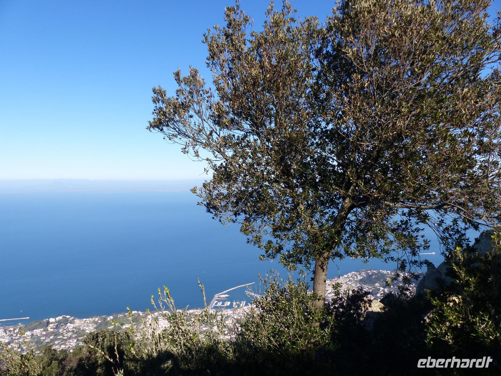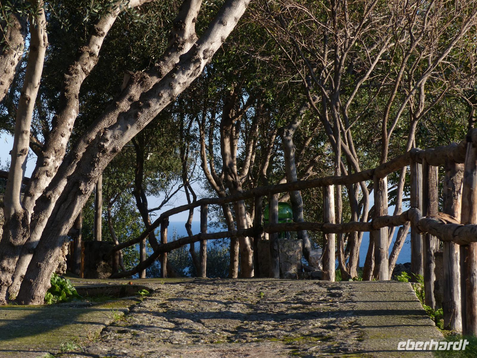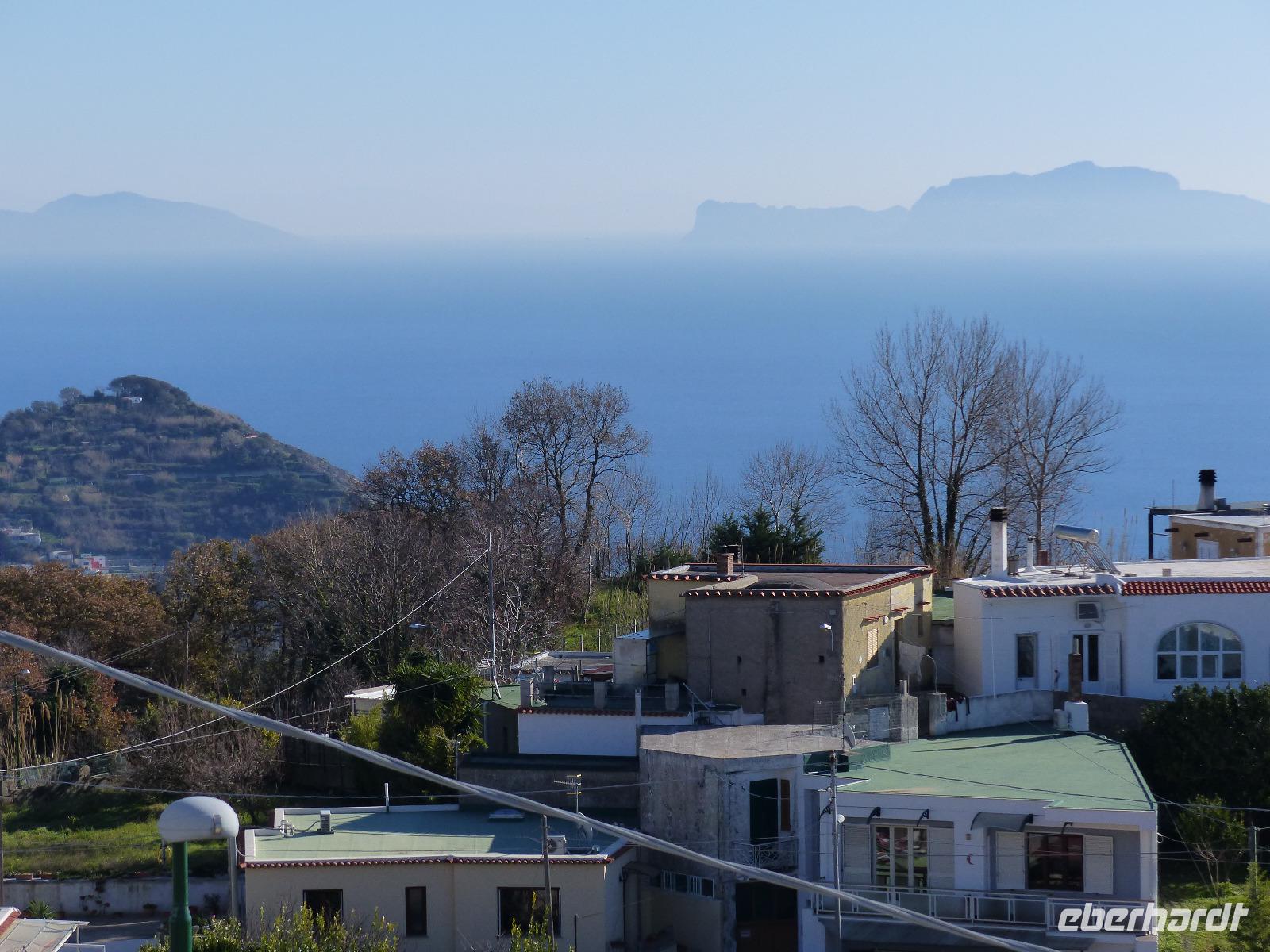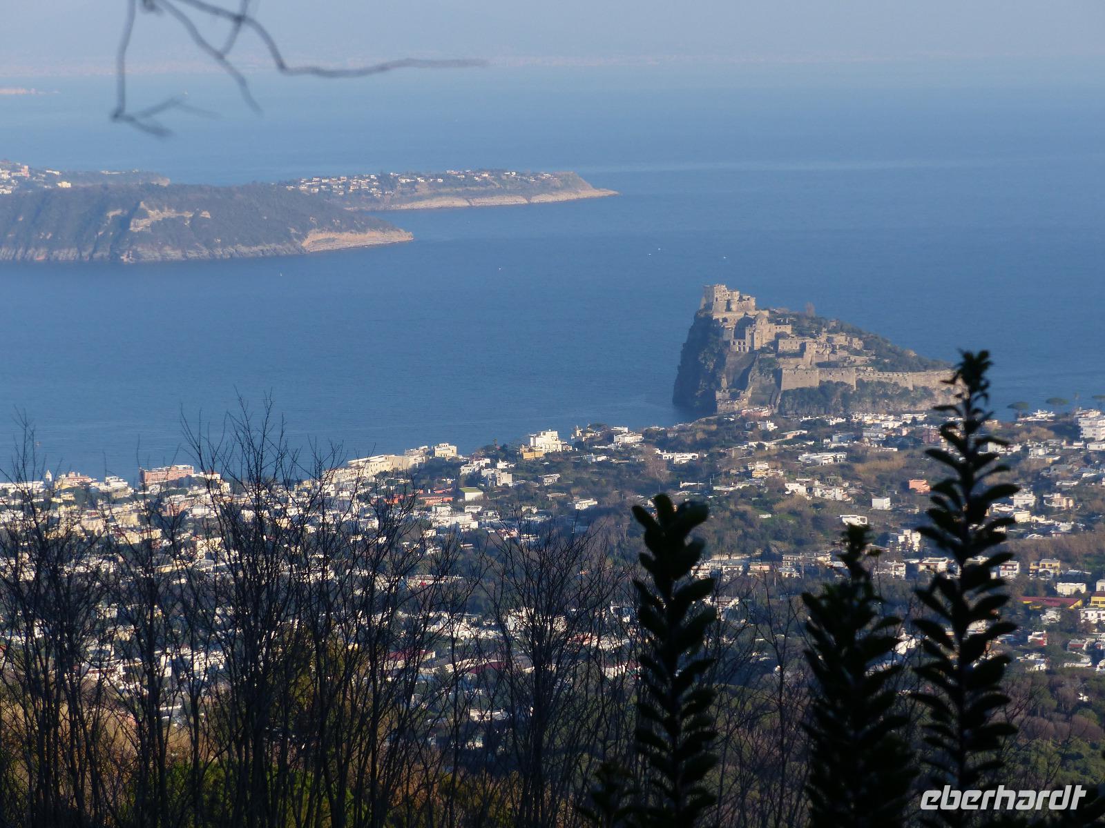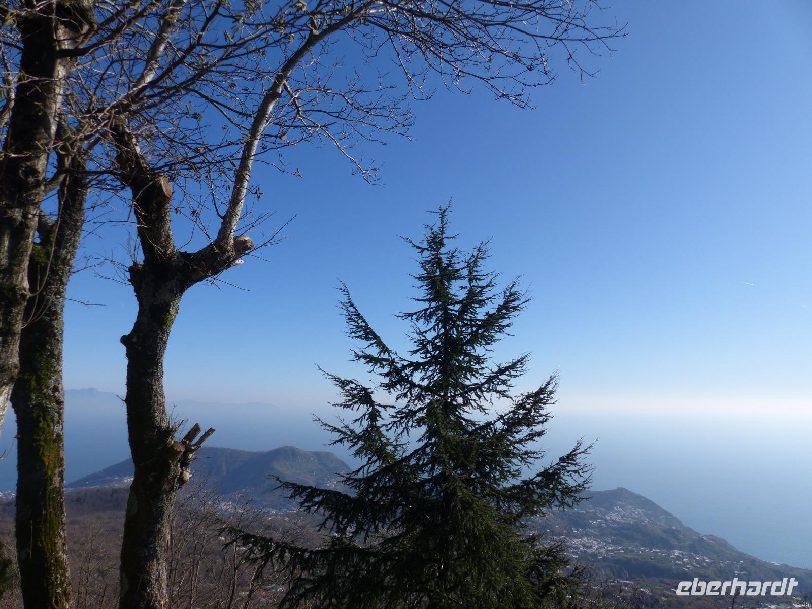 Ein weiterer Tag Freizeit folgte. Wer gerne wandern wollte, der konnte mit mir an diesem strahlend blauen Tag auf den höchsten Inselberg, den Monte Epomeo wandern. Die anderen vergnügten sich auf ihre Weise, bummelten durch die Läden, genossen die Inselspezialitäten, saßen in der Sonne oder badeten gar im Meer, denn in Sorgeto mischt sich das warme Thermalwasser mit dem Meerwasser in natürlichen Becken, so dass man hier auch im Winter ohne die Tugenden eines Eisbaders in die Fluten springen kann. Die Wanderer begannen den Tag mit einer Taxifahrt nach Fontana und kehrten hier zuerst mal ein. Cappuccino, Espresso und Sfogliatelle. Dieses Gebäck ist typisch für die Region, besteht aus Blätterteig mit einer leckeren nur leicht süßen Ricottafüllung. Teilweise packten wir die Teile ein für unterwegs. Dann ging's los. Der Aufstieg erfolgte über eine kleine Straße und durch eine Schlucht auf einem Fußweg. Nach 45 Minuten war er geschafft. Dann erreichten wir den Kastanienwald. Raschelndes Laub und strahlende Sonne. Tifeo oder Typhon, der Herr der heißen Taifune, soll, wenn man einer Geschichte der Mythologie glaubt, unter Ischia lebendig begraben liegen. Seine Körperteile finden sich in den Ortsnamen wieder: bei Testa liegt sein Kopf, bei Panza sein Bauch, bei Piedimonte seine Füße. Er gibt, folgt man den Ortsnamen, eine komische Figur ab, dessen Auge weit entfernt vom Kopf liegt. Tifeo schnaubt vor Wut über seine missliche Lage aus seinen Nasenlöchern, den Fumarolen. Solche Geschichten gab es von mir heute zu hören. Unser Weg führte uns bald aussichtsreich an Terrassenfeldern vorüber und dann folgte ein letzter steiler Aufstieg auf den Gipfel. Das Grottenrestaurant war geöffnet und die Sonnenterrasse voller Menschen. Wir ließen uns auf den Felsen am Gipfel nieder und genossen den Rundumblick. Bis an den Horizont auf allen Seiten keine einzige Wolke zu sehen! Blau, blau und nochmals blau! Meer und Himmel gingen ineinander über. Ich spendierte die Ausbeute der Bar Faro, also die Orangen und Mandarinen aus dem Garten, die ich geschenkt bekommen hatte. Dann wanderten wir weiter. Unser Weg führte uns zunächst wieder durch den Kastanienwald. Aber bald schon erreichten wir enge, steile Schluchten im grünen Tuff, dicht überwuchert mit Efeu und Farnen. Vor einem Häuschen befand sich eine Feuerstelle. Niemand war da aber die Glut schwelte munter vor sich hin. Also betätigten wir uns als Feuerlöscher und leerten die Zisterne. Wieder schöne Aussichten. Wir wanderten auf dem Berggrat entlang immer abwärts nach Osten und machten noch eine herrliche Pause auf einer Waldlichtung, wo wir dann die Reste der Sfogliatelle verzehrten. Der schmale Pfad schlängelte sich nun im Schatten entlang und es wurde kühler. Im Wald machten Waldarbeiter ein Feuer. Sie hatten die Wege von umgestürzten Bäumen befreit und verbrannten nun das Holz. Ihr Haflingerpferd mochte das Feuer gar nicht. Und uns erst recht nicht. Wir wanderten weiter und folgten einer langen Treppe hinunter nach Fiaiano. Dort befand sich eine Bushaltestelle und der Bus ließ nicht lange auf sich warten. In Porto mussten wir umsteigen. Aber wir waren die ersten im Bus und konnten fast alle sitzen. Im letzten Dämmerlicht erreichten wir das Hotel nach einem wunderschönen Wandertag, wo wir abends gemeinsam mit den Nicht-Wanderern mal wieder schlemmten.