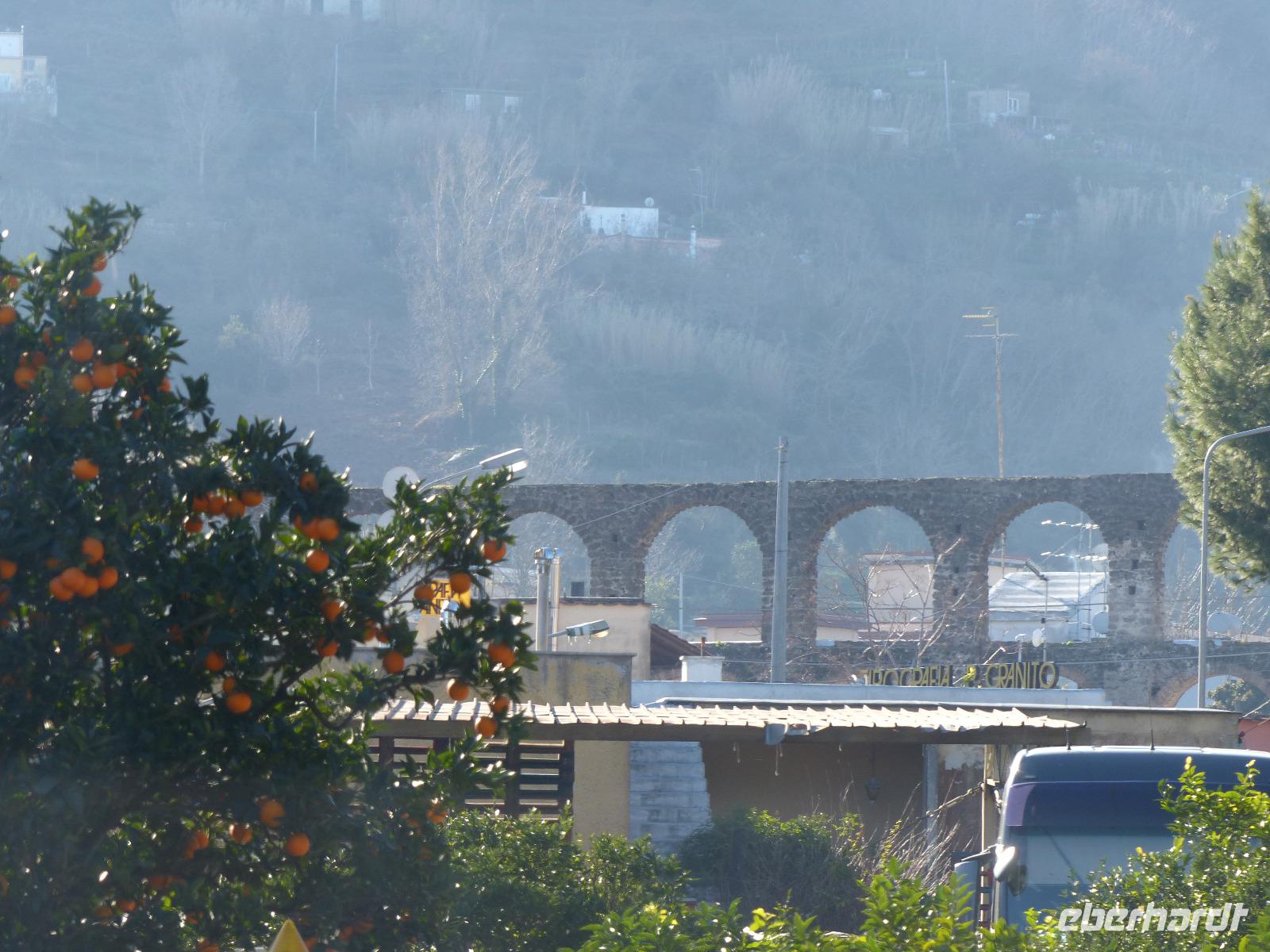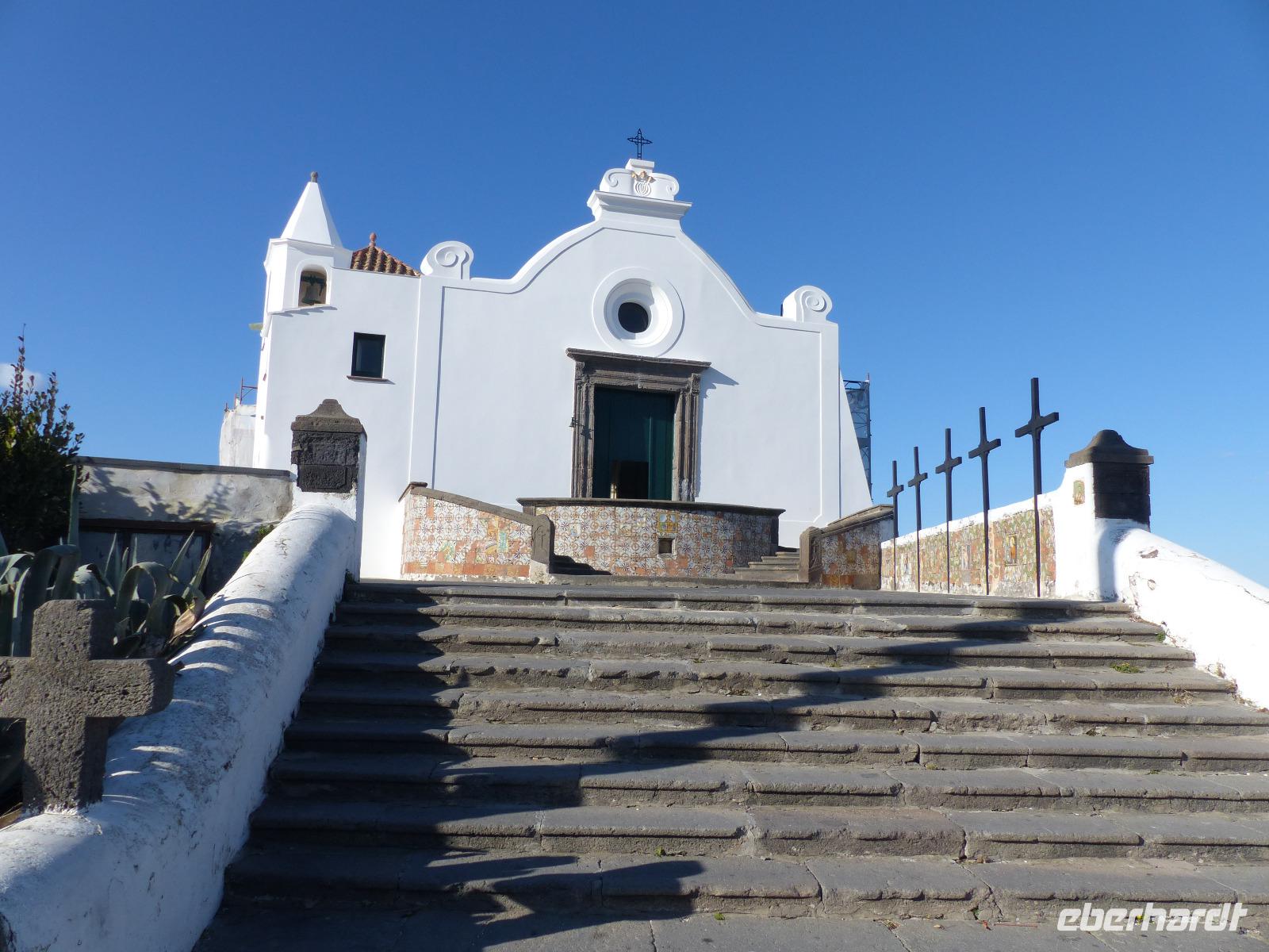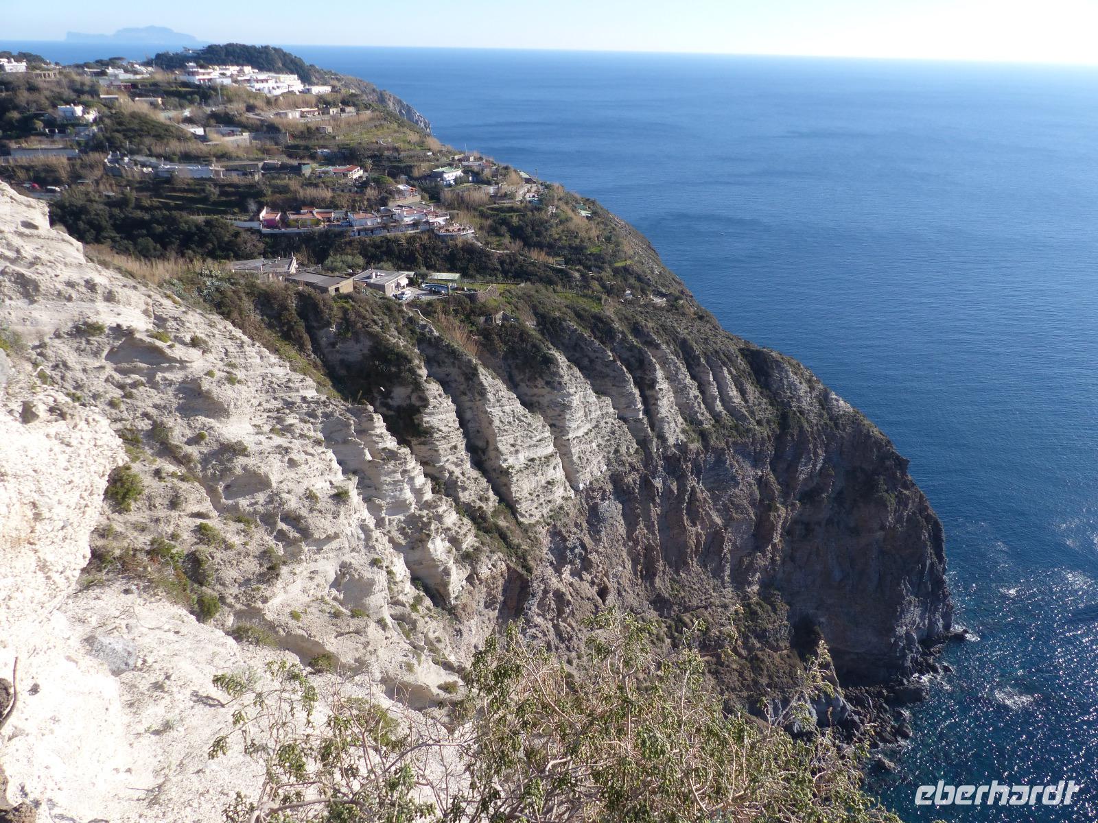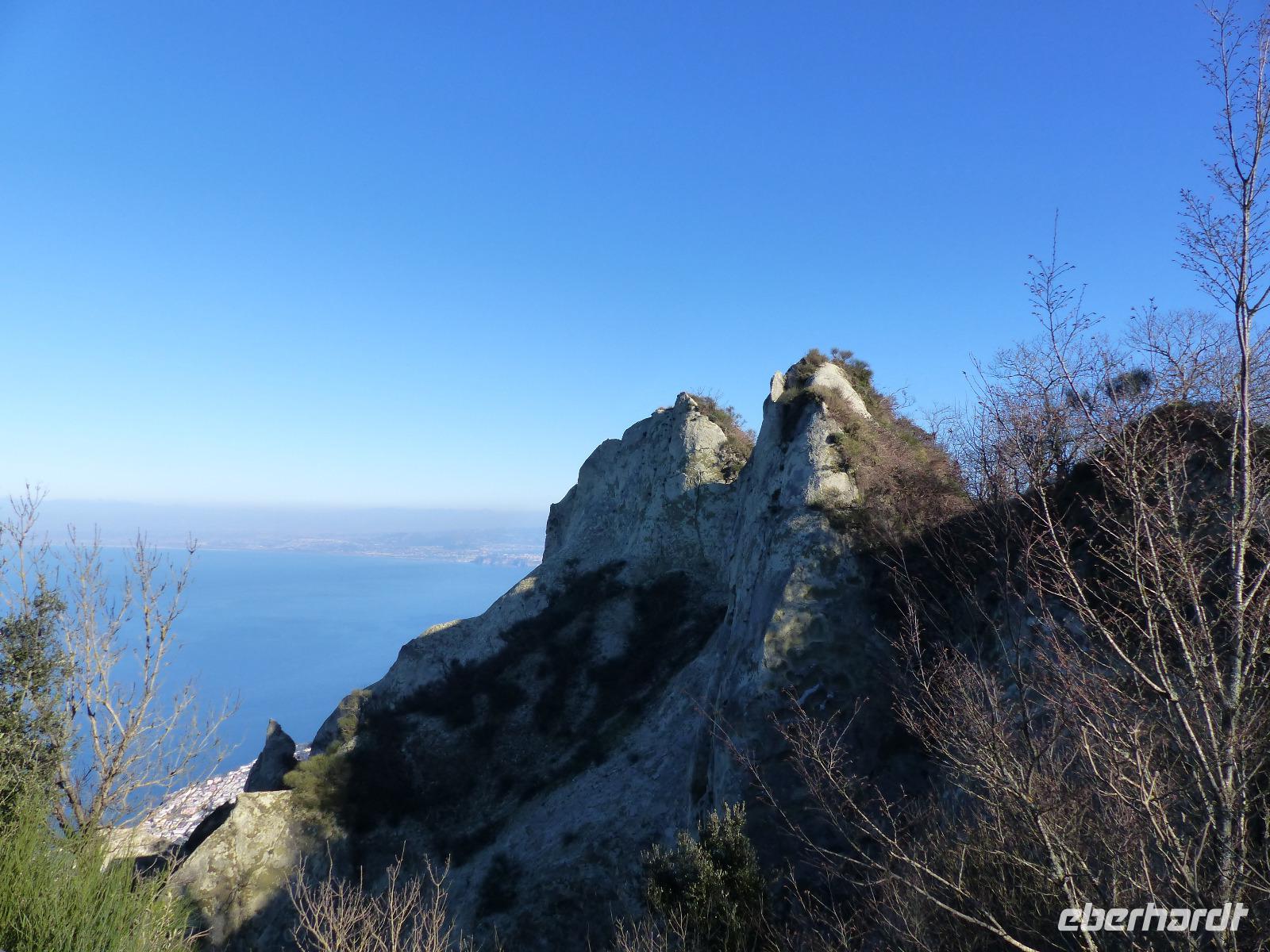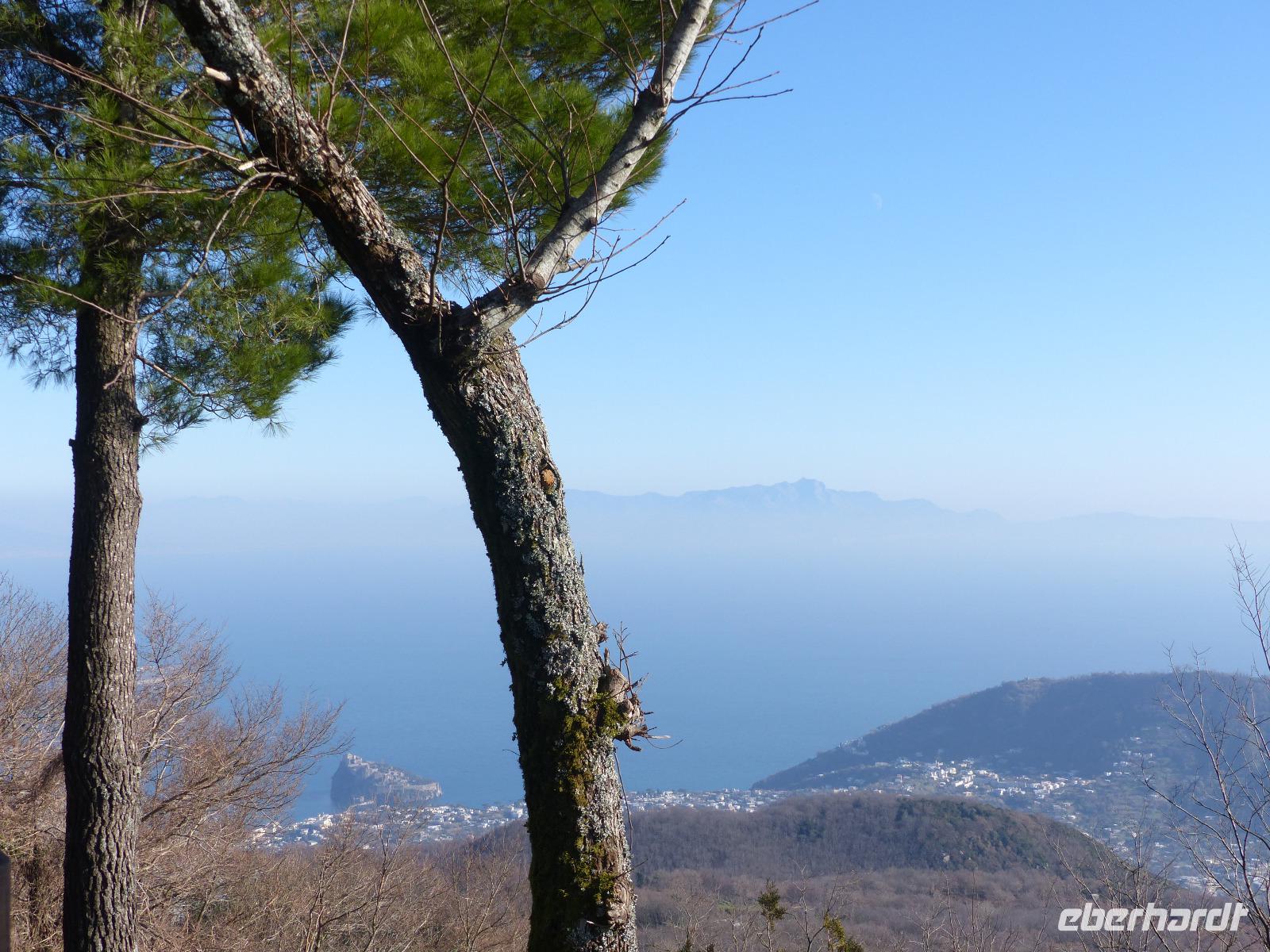 Ein weiterer Tag Freizeit folgte. Wer gerne wandern wollte, der konnte mit mir an diesem strahlend blauen Tag auf den höchsten Inselberg, den Monte Epomeo wandern. Die anderen vergnügten sich auf ihre Weise, bummelten durch die Läden, genossen die Inselspezialitäten, saßen in der Sonne oder badeten gar im Meer, denn in Sorgeto mischt sich das warme Thermalwasser mit dem Meerwasser in natürlichen Becken, so dass man hier auch im Winter ohne die Tugenden eines Eisbaders in die Fluten springen kann. Die Wanderer begannen den Tag mit einer Taxifahrt nach Fontana und kehrten hier zuerst mal ein. Cappuccino, Espresso und Sfogliatelle. Dieses Gebäck ist typisch für die Region, besteht aus Blätterteig mit einer leckeren nur leicht süßen Ricottafüllung. Teilweise packten wir die Teile ein für unterwegs. Dann ging's los. Der Aufstieg erfolgte über eine kleine Straße und durch eine Schlucht auf einem Fußweg. Nach 45 Minuten war er geschafft. Dann erreichten wir den Kastanienwald. Raschelndes Laub und strahlende Sonne. Tifeo oder Typhon, der Herr der heißen Taifune, soll, wenn man einer Geschichte der Mythologie glaubt, unter Ischia lebendig begraben liegen. Seine Körperteile finden sich in den Ortsnamen wieder: bei Testa liegt sein Kopf, bei Panza sein Bauch, bei Piedimonte seine Füße. Er gibt, folgt man den Ortsnamen, eine komische Figur ab, dessen Auge weit entfernt vom Kopf liegt. Tifeo schnaubt vor Wut über seine missliche Lage aus seinen Nasenlöchern, den Fumarolen. Solche Geschichten gab es von mir heute zu hören. Unser Weg führte uns bald aussichtsreich an Terrassenfeldern vorüber und dann folgte ein letzter steiler Aufstieg auf den Gipfel. Das Grottenrestaurant war geöffnet und die Sonnenterrasse voller Menschen. Wir ließen uns auf den Felsen am Gipfel nieder und genossen den Rundumblick. Bis an den Horizont auf allen Seiten keine einzige Wolke zu sehen! Blau, blau und nochmals blau! Meer und Himmel gingen ineinander über. Ich spendierte die Ausbeute der Bar Faro, also die Orangen und Mandarinen aus dem Garten, die ich geschenkt bekommen hatte. Dann wanderten wir weiter. Unser Weg führte uns zunächst wieder durch den Kastanienwald. Aber bald schon erreichten wir enge, steile Schluchten im grünen Tuff, dicht überwuchert mit Efeu und Farnen. Vor einem Häuschen befand sich eine Feuerstelle. Niemand war da aber die Glut schwelte munter vor sich hin. Also betätigten wir uns als Feuerlöscher und leerten die Zisterne. Wieder schöne Aussichten. Wir wanderten auf dem Berggrat entlang immer abwärts nach Osten und machten noch eine herrliche Pause auf einer Waldlichtung, wo wir dann die Reste der Sfogliatelle verzehrten. Der schmale Pfad schlängelte sich nun im Schatten entlang und es wurde kühler. Im Wald machten Waldarbeiter ein Feuer. Sie hatten die Wege von umgestürzten Bäumen befreit und verbrannten nun das Holz. Ihr Haflingerpferd mochte das Feuer gar nicht. Und uns erst recht nicht. Wir wanderten weiter und folgten einer langen Treppe hinunter nach Fiaiano. Dort befand sich eine Bushaltestelle und der Bus ließ nicht lange auf sich warten. In Porto mussten wir umsteigen. Aber wir waren die ersten im Bus und konnten fast alle sitzen. Im letzten Dämmerlicht erreichten wir das Hotel nach einem wunderschönen Wandertag, wo wir abends gemeinsam mit den Nicht-Wanderern mal wieder schlemmten.