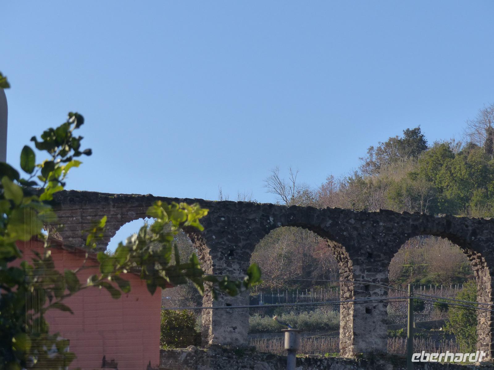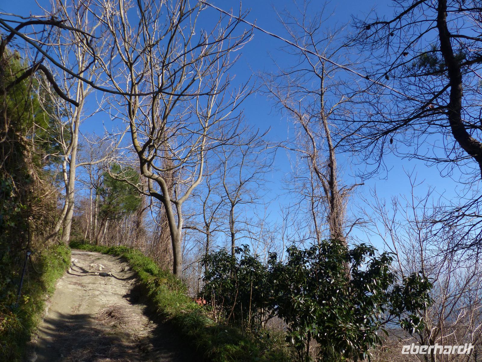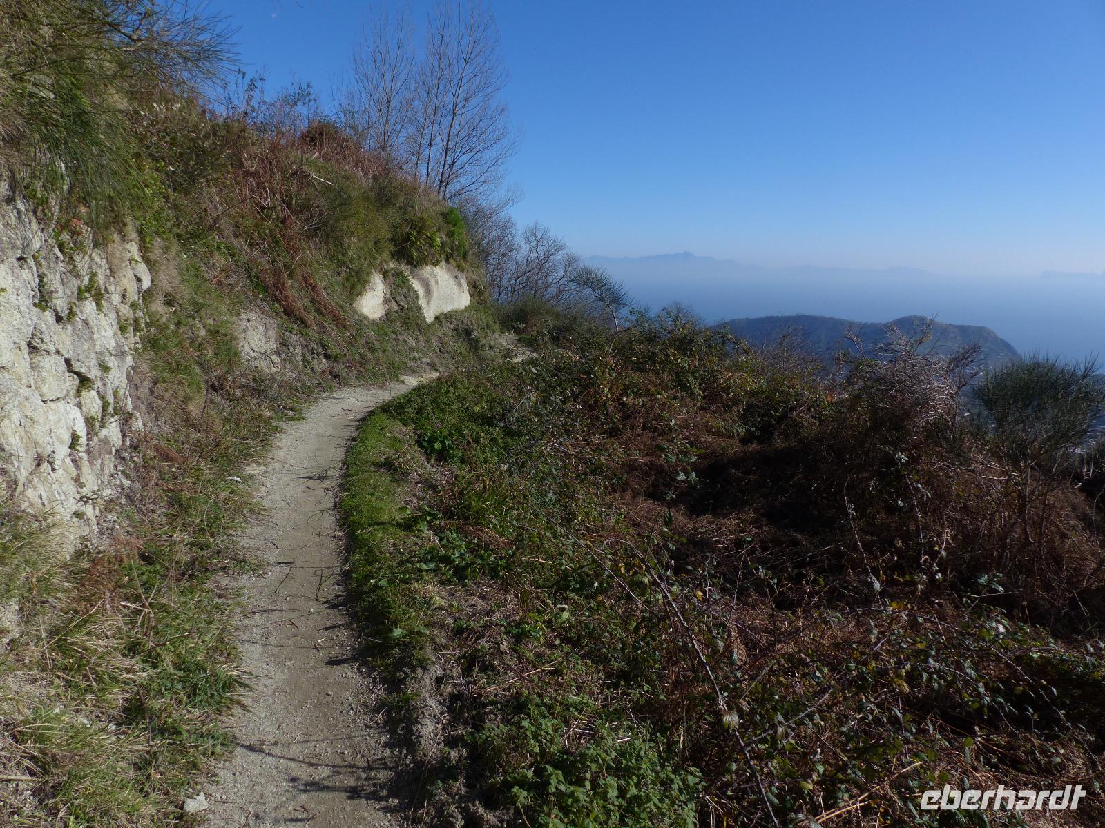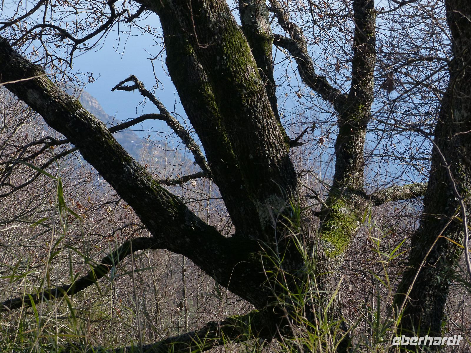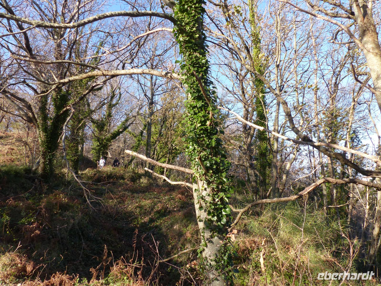 Ein weiterer Tag Freizeit folgte. Wer gerne wandern wollte, der konnte mit mir an diesem strahlend blauen Tag auf den höchsten Inselberg, den Monte Epomeo wandern. Die anderen vergnügten sich auf ihre Weise, bummelten durch die Läden, genossen die Inselspezialitäten, saßen in der Sonne oder badeten gar im Meer, denn in Sorgeto mischt sich das warme Thermalwasser mit dem Meerwasser in natürlichen Becken, so dass man hier auch im Winter ohne die Tugenden eines Eisbaders in die Fluten springen kann. Die Wanderer begannen den Tag mit einer Taxifahrt nach Fontana und kehrten hier zuerst mal ein. Cappuccino, Espresso und Sfogliatelle. Dieses Gebäck ist typisch für die Region, besteht aus Blätterteig mit einer leckeren nur leicht süßen Ricottafüllung. Teilweise packten wir die Teile ein für unterwegs. Dann ging's los. Der Aufstieg erfolgte über eine kleine Straße und durch eine Schlucht auf einem Fußweg. Nach 45 Minuten war er geschafft. Dann erreichten wir den Kastanienwald. Raschelndes Laub und strahlende Sonne. Tifeo oder Typhon, der Herr der heißen Taifune, soll, wenn man einer Geschichte der Mythologie glaubt, unter Ischia lebendig begraben liegen. Seine Körperteile finden sich in den Ortsnamen wieder: bei Testa liegt sein Kopf, bei Panza sein Bauch, bei Piedimonte seine Füße. Er gibt, folgt man den Ortsnamen, eine komische Figur ab, dessen Auge weit entfernt vom Kopf liegt. Tifeo schnaubt vor Wut über seine missliche Lage aus seinen Nasenlöchern, den Fumarolen. Solche Geschichten gab es von mir heute zu hören. Unser Weg führte uns bald aussichtsreich an Terrassenfeldern vorüber und dann folgte ein letzter steiler Aufstieg auf den Gipfel. Das Grottenrestaurant war geöffnet und die Sonnenterrasse voller Menschen. Wir ließen uns auf den Felsen am Gipfel nieder und genossen den Rundumblick. Bis an den Horizont auf allen Seiten keine einzige Wolke zu sehen! Blau, blau und nochmals blau! Meer und Himmel gingen ineinander über. Ich spendierte die Ausbeute der Bar Faro, also die Orangen und Mandarinen aus dem Garten, die ich geschenkt bekommen hatte. Dann wanderten wir weiter. Unser Weg führte uns zunächst wieder durch den Kastanienwald. Aber bald schon erreichten wir enge, steile Schluchten im grünen Tuff, dicht überwuchert mit Efeu und Farnen. Vor einem Häuschen befand sich eine Feuerstelle. Niemand war da aber die Glut schwelte munter vor sich hin. Also betätigten wir uns als Feuerlöscher und leerten die Zisterne. Wieder schöne Aussichten. Wir wanderten auf dem Berggrat entlang immer abwärts nach Osten und machten noch eine herrliche Pause auf einer Waldlichtung, wo wir dann die Reste der Sfogliatelle verzehrten. Der schmale Pfad schlängelte sich nun im Schatten entlang und es wurde kühler. Im Wald machten Waldarbeiter ein Feuer. Sie hatten die Wege von umgestürzten Bäumen befreit und verbrannten nun das Holz. Ihr Haflingerpferd mochte das Feuer gar nicht. Und uns erst recht nicht. Wir wanderten weiter und folgten einer langen Treppe hinunter nach Fiaiano. Dort befand sich eine Bushaltestelle und der Bus ließ nicht lange auf sich warten. In Porto mussten wir umsteigen. Aber wir waren die ersten im Bus und konnten fast alle sitzen. Im letzten Dämmerlicht erreichten wir das Hotel nach einem wunderschönen Wandertag, wo wir abends gemeinsam mit den Nicht-Wanderern mal wieder schlemmten.