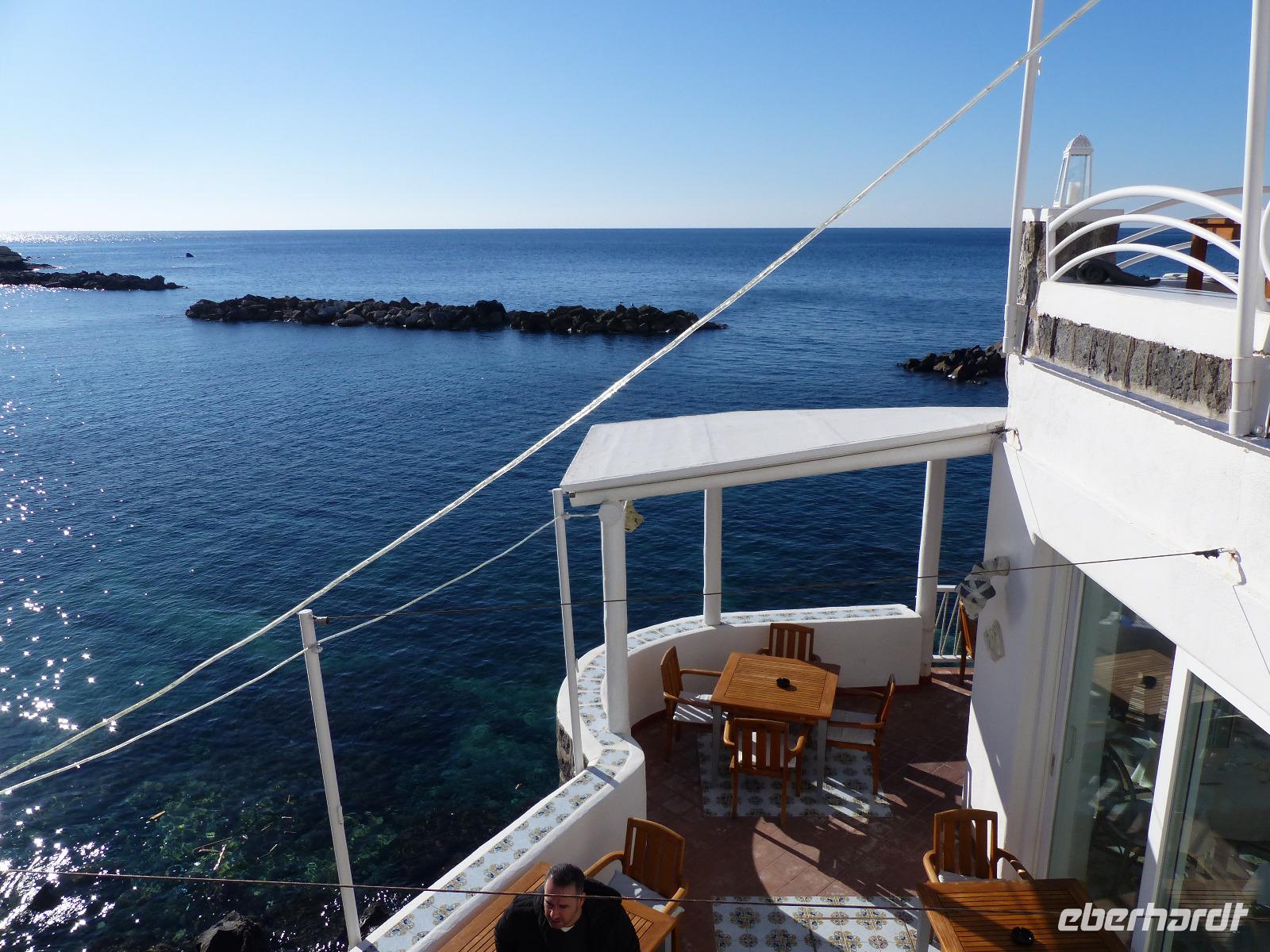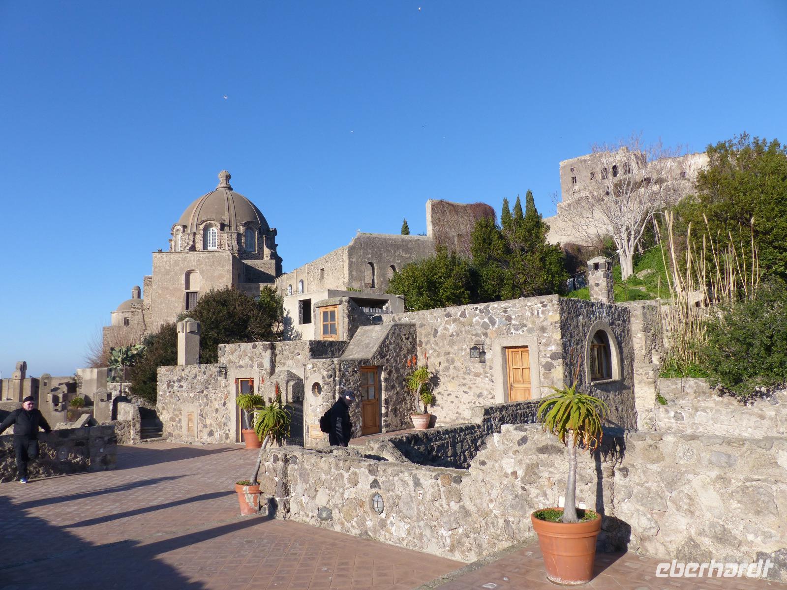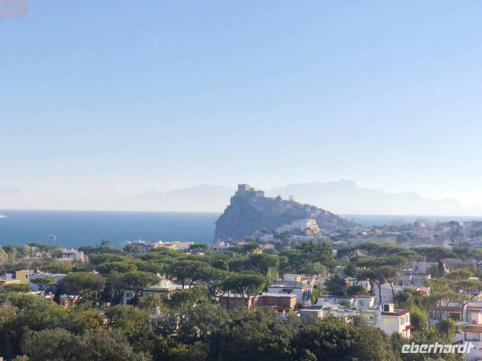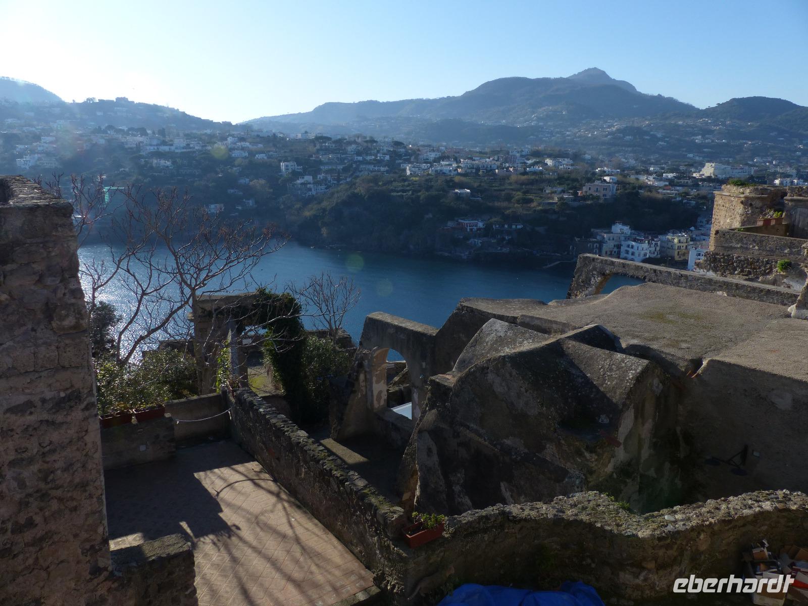 Nach kurzer Nacht ging's weiter. Um 10 Uhr fuhren wir zum Pineta, dem Pinienwäldchen, das Ponte von Porto trennt und liefen am alten Lavastrom entlang zum Strand. Dort trafen wir auf die ersten Neujahrsbader. Rote Badehose und rote Zipfelmütze. Ein Prachtexemplar zeigte sich uns. Aber um 12 Uhr, wenn das wilde Badevergnügen startet, waren wir bereits am Hafen von Porto und genossen unser Mittagsmahl. Auch am Strand konnten wir die Schäden, die das Unwetter hinterlassen hatte, gut sehen. Es wurde schon kräftig Sand hin- und hergeschoben und im Frühjahr wird man von diesen Spuren wohl nicht mehr viel sehen. Die meisten Läden in Ponte waren geschlossen und in der hellgelb leuchtenden Barockkirche fand ein Gottesdienst statt, so dass wir die Kirche nicht von innen ansehen konnten. Trotzdem war es schön hier entlang zu bummeln. Nach unserem Essen direkt am Wasser, wo wir kleine Holzboote dümpeln sahen, brachte uns der Bus nach Ponte. Mit dem Aufzug fuhren wir nach oben und besichtigten das Castello Aragonese. Das Castello Aragonese bot seinen Besuchern einige interessante und einige schöne Eindrücke. So besichtigten wir die Begräbnisplätze des Klarissenklosters im Keller, durchstreiften Kirchenruinen und durchwanderten den Teil des Gartens, der im Winter zugänglich ist, wo wir wunderschöne Aussichtspunkte flankiert vom blühenden Aloe erreichten, schauten uns im Wachhaus noch die schaurigen Werkzeuge, die man früher zur Bestrafung unliebsamer Artgenossen verwendet hatte, an und bummelten in der Dämmerung dieses blitzblauen Tages dann noch durch den schön beleuchteten Ort. Danach fuhren wir mit dem Bus zurück ins Hotel.