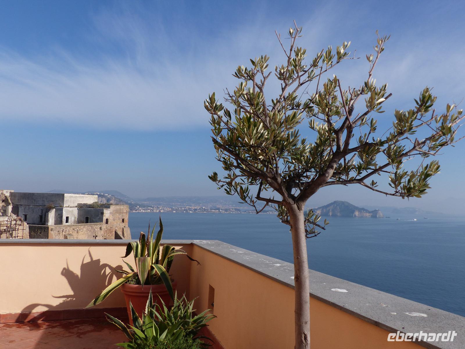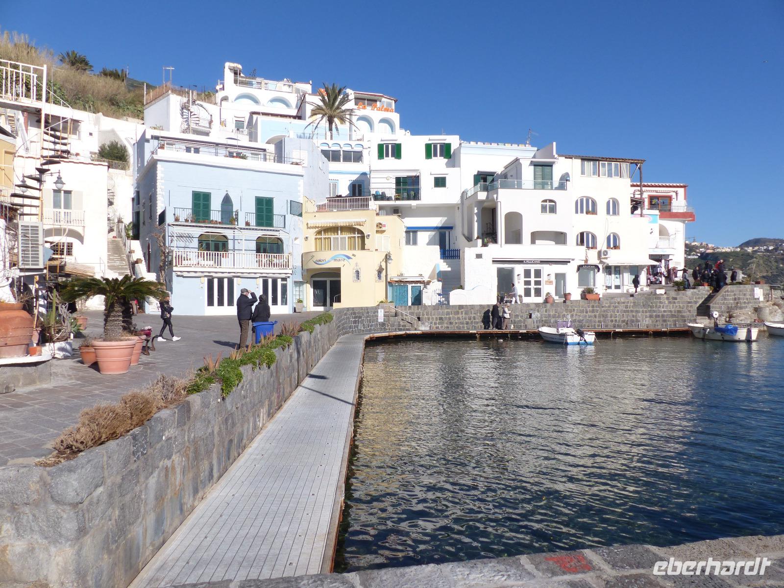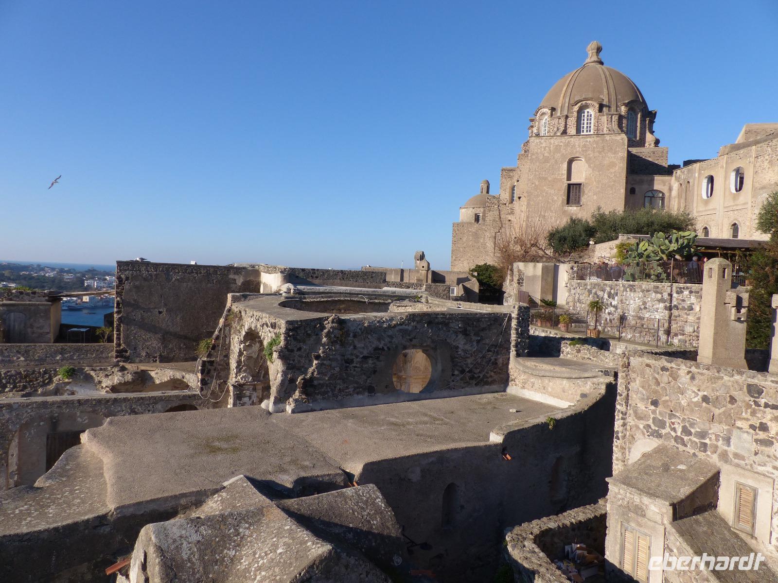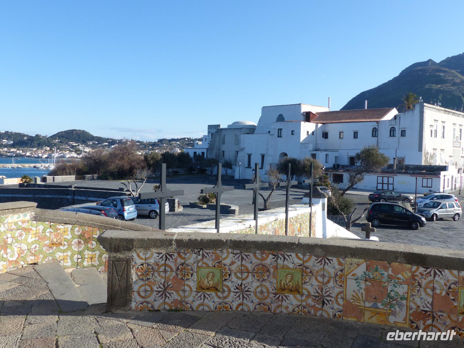 Nach kurzer Nacht ging's weiter. Um 10 Uhr fuhren wir zum Pineta, dem Pinienwäldchen, das Ponte von Porto trennt und liefen am alten Lavastrom entlang zum Strand. Dort trafen wir auf die ersten Neujahrsbader. Rote Badehose und rote Zipfelmütze. Ein Prachtexemplar zeigte sich uns. Aber um 12 Uhr, wenn das wilde Badevergnügen startet, waren wir bereits am Hafen von Porto und genossen unser Mittagsmahl. Auch am Strand konnten wir die Schäden, die das Unwetter hinterlassen hatte, gut sehen. Es wurde schon kräftig Sand hin- und hergeschoben und im Frühjahr wird man von diesen Spuren wohl nicht mehr viel sehen. Die meisten Läden in Ponte waren geschlossen und in der hellgelb leuchtenden Barockkirche fand ein Gottesdienst statt, so dass wir die Kirche nicht von innen ansehen konnten. Trotzdem war es schön hier entlang zu bummeln. Nach unserem Essen direkt am Wasser, wo wir kleine Holzboote dümpeln sahen, brachte uns der Bus nach Ponte. Mit dem Aufzug fuhren wir nach oben und besichtigten das Castello Aragonese. Das Castello Aragonese bot seinen Besuchern einige interessante und einige schöne Eindrücke. So besichtigten wir die Begräbnisplätze des Klarissenklosters im Keller, durchstreiften Kirchenruinen und durchwanderten den Teil des Gartens, der im Winter zugänglich ist, wo wir wunderschöne Aussichtspunkte flankiert vom blühenden Aloe erreichten, schauten uns im Wachhaus noch die schaurigen Werkzeuge, die man früher zur Bestrafung unliebsamer Artgenossen verwendet hatte, an und bummelten in der Dämmerung dieses blitzblauen Tages dann noch durch den schön beleuchteten Ort. Danach fuhren wir mit dem Bus zurück ins Hotel.