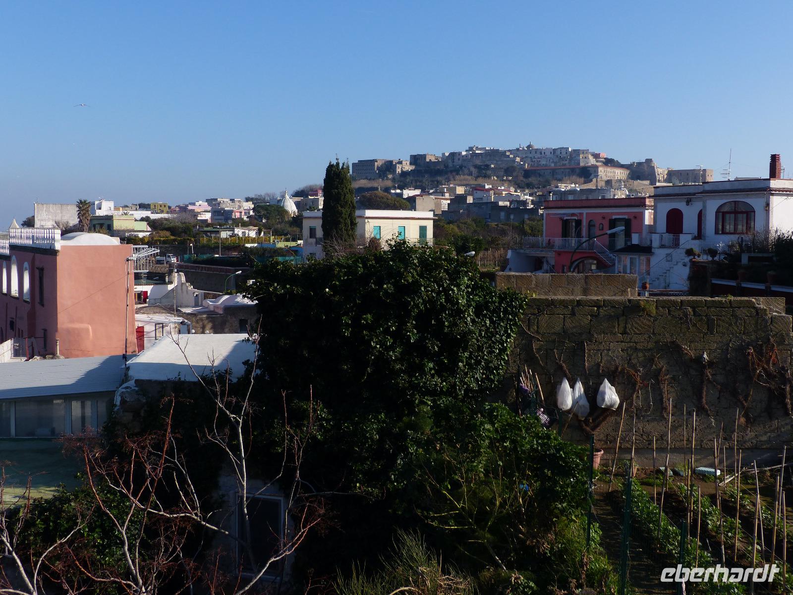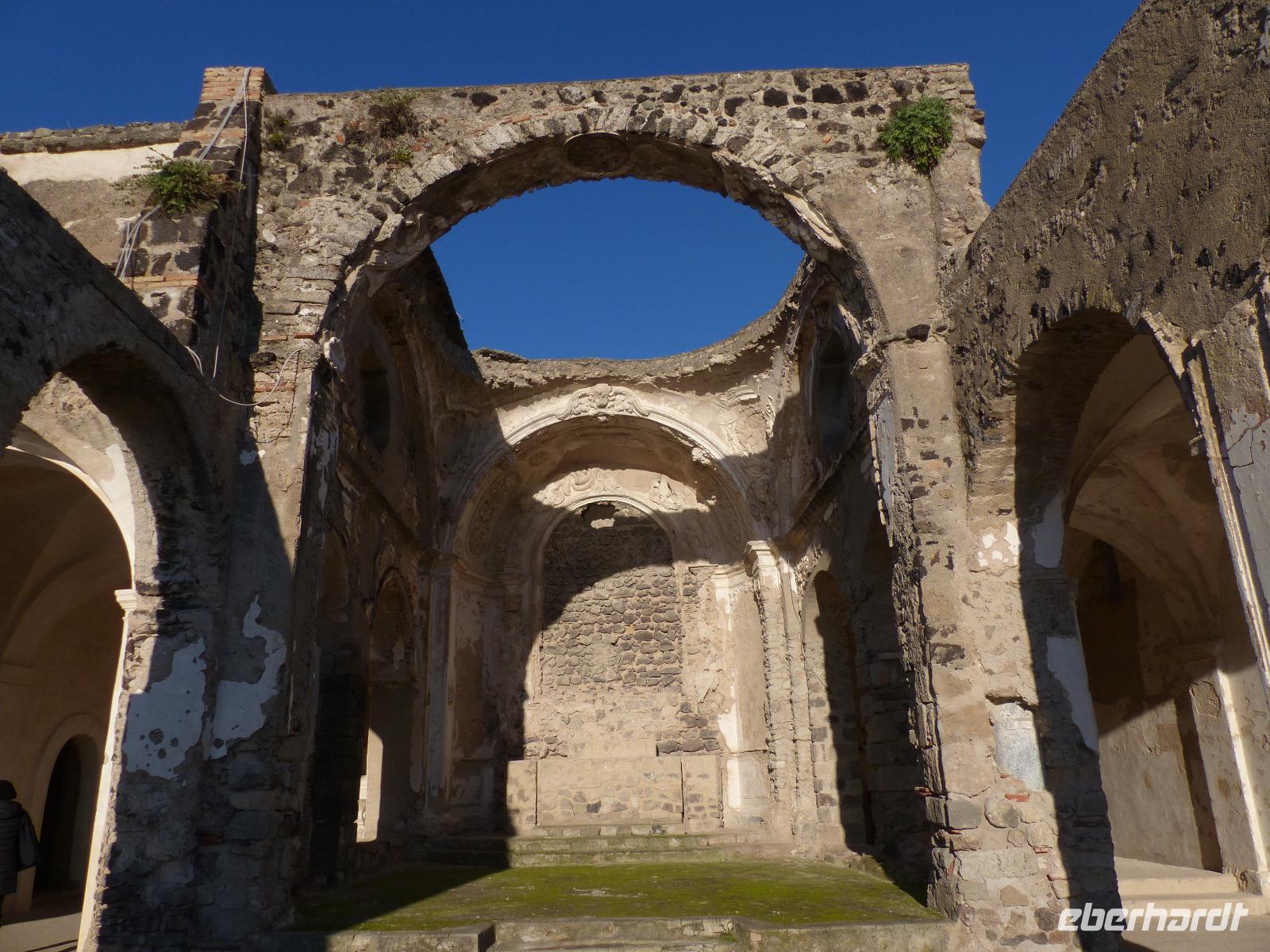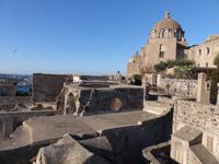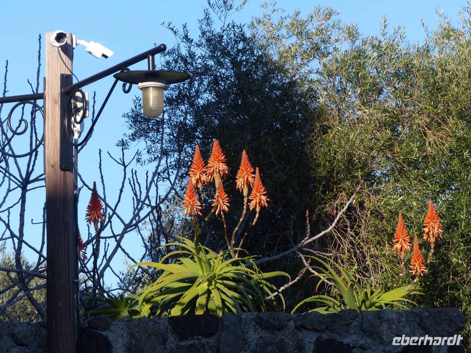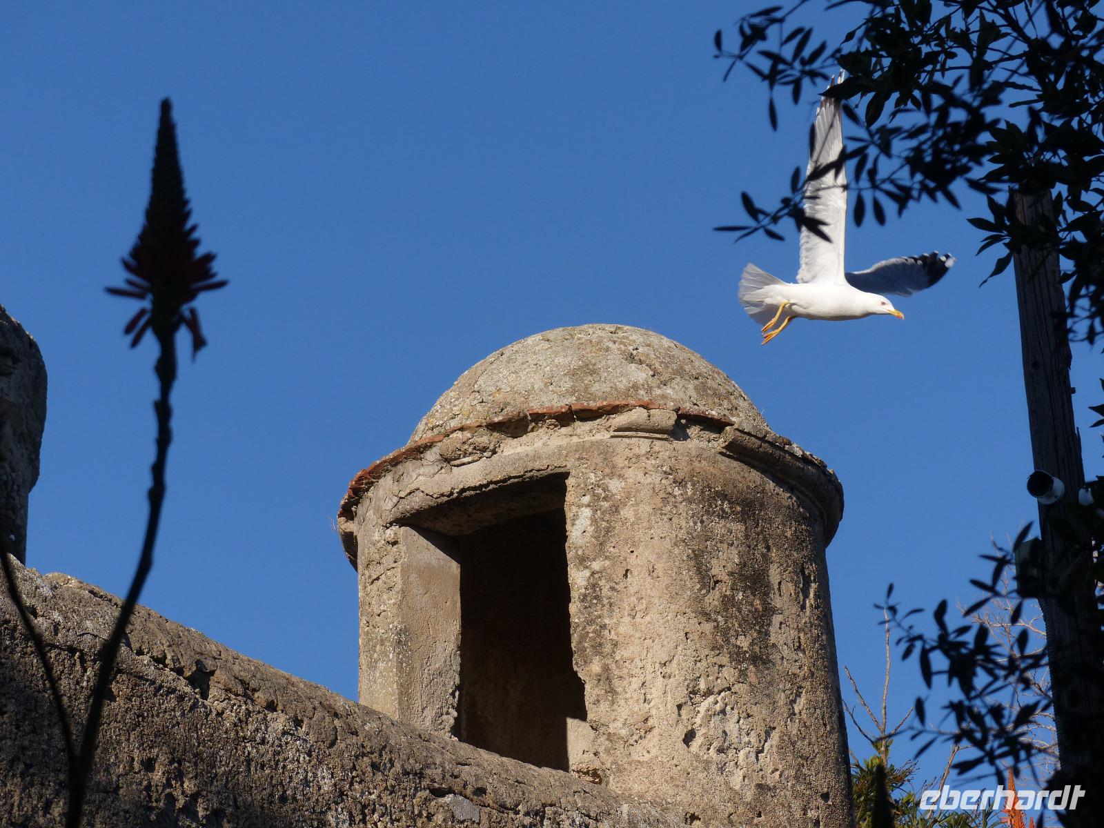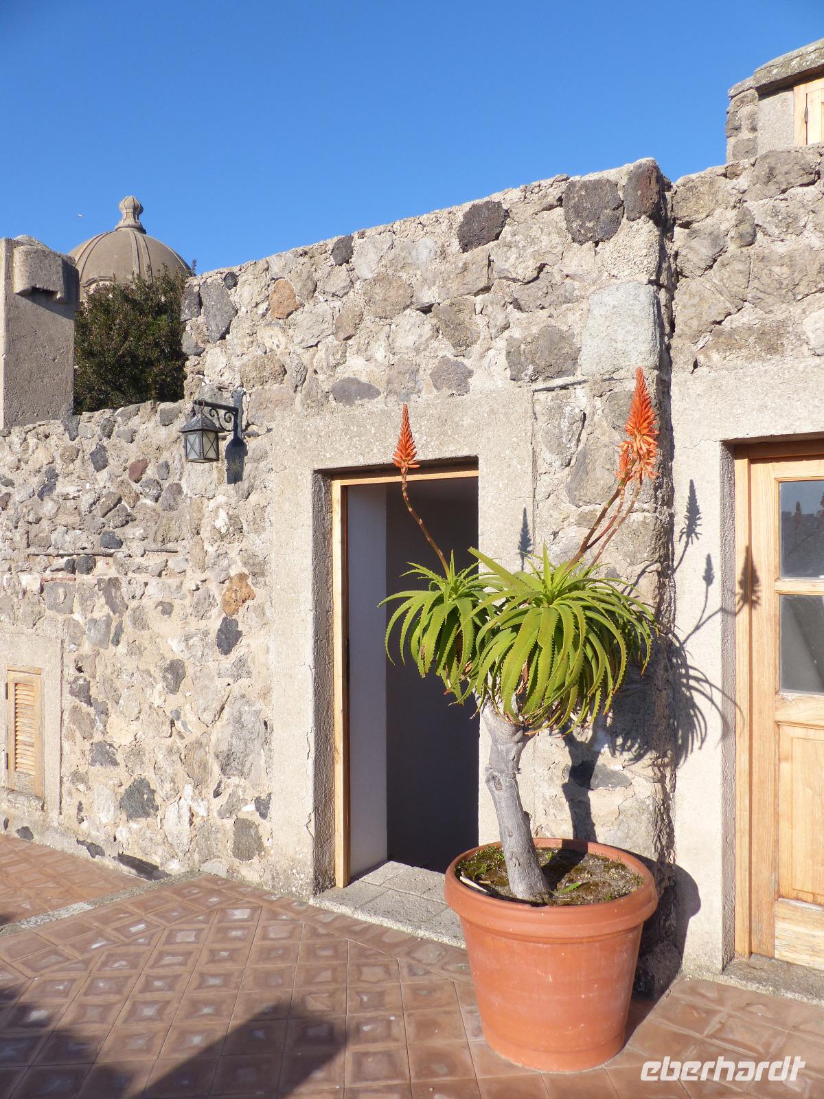 Nach kurzer Nacht ging's weiter. Um 10 Uhr fuhren wir zum Pineta, dem Pinienwäldchen, das Ponte von Porto trennt und liefen am alten Lavastrom entlang zum Strand. Dort trafen wir auf die ersten Neujahrsbader. Rote Badehose und rote Zipfelmütze. Ein Prachtexemplar zeigte sich uns. Aber um 12 Uhr, wenn das wilde Badevergnügen startet, waren wir bereits am Hafen von Porto und genossen unser Mittagsmahl. Auch am Strand konnten wir die Schäden, die das Unwetter hinterlassen hatte, gut sehen. Es wurde schon kräftig Sand hin- und hergeschoben und im Frühjahr wird man von diesen Spuren wohl nicht mehr viel sehen. Die meisten Läden in Ponte waren geschlossen und in der hellgelb leuchtenden Barockkirche fand ein Gottesdienst statt, so dass wir die Kirche nicht von innen ansehen konnten. Trotzdem war es schön hier entlang zu bummeln. Nach unserem Essen direkt am Wasser, wo wir kleine Holzboote dümpeln sahen, brachte uns der Bus nach Ponte. Mit dem Aufzug fuhren wir nach oben und besichtigten das Castello Aragonese. Das Castello Aragonese bot seinen Besuchern einige interessante und einige schöne Eindrücke. So besichtigten wir die Begräbnisplätze des Klarissenklosters im Keller, durchstreiften Kirchenruinen und durchwanderten den Teil des Gartens, der im Winter zugänglich ist, wo wir wunderschöne Aussichtspunkte flankiert vom blühenden Aloe erreichten, schauten uns im Wachhaus noch die schaurigen Werkzeuge, die man früher zur Bestrafung unliebsamer Artgenossen verwendet hatte, an und bummelten in der Dämmerung dieses blitzblauen Tages dann noch durch den schön beleuchteten Ort. Danach fuhren wir mit dem Bus zurück ins Hotel.