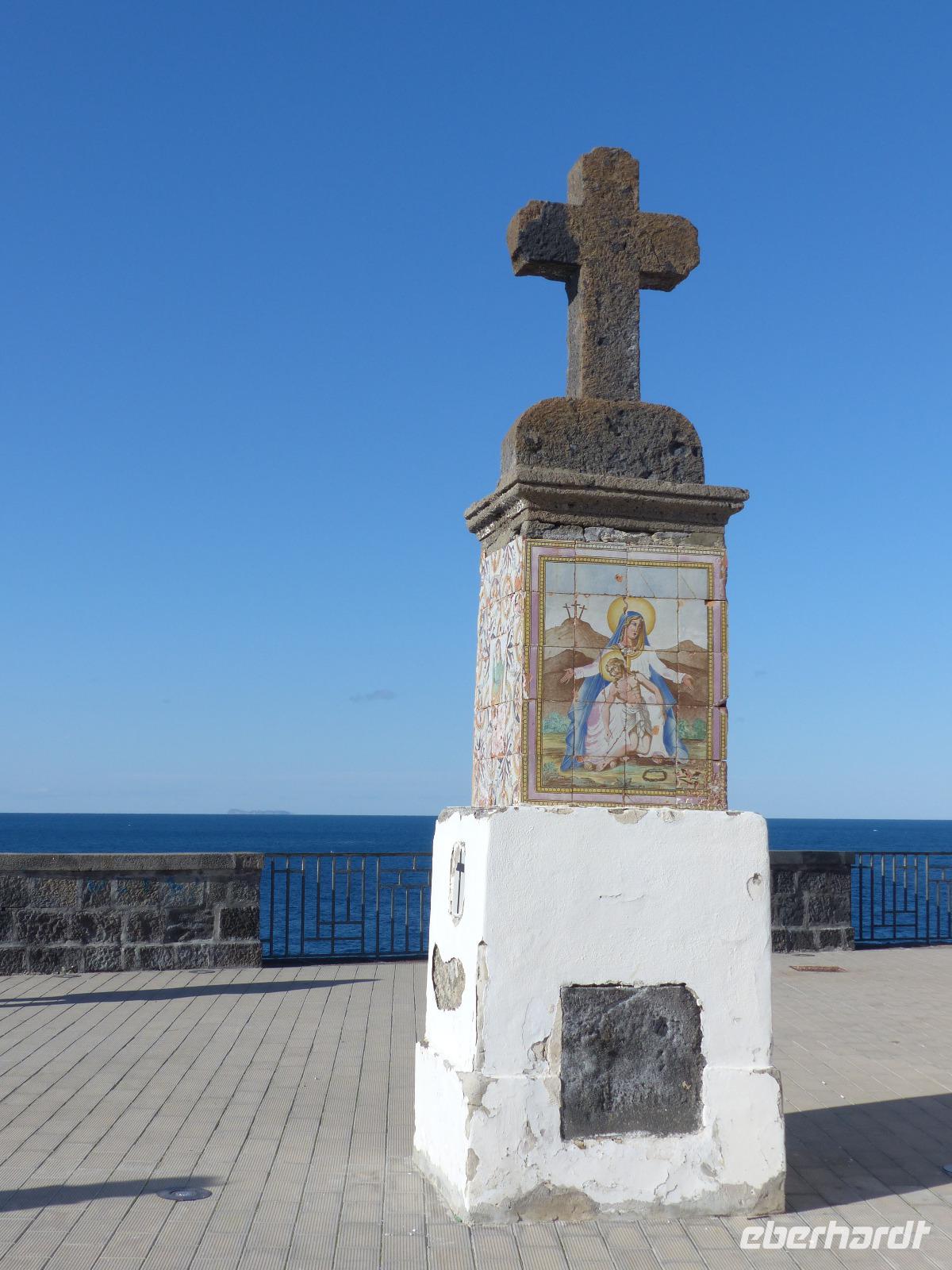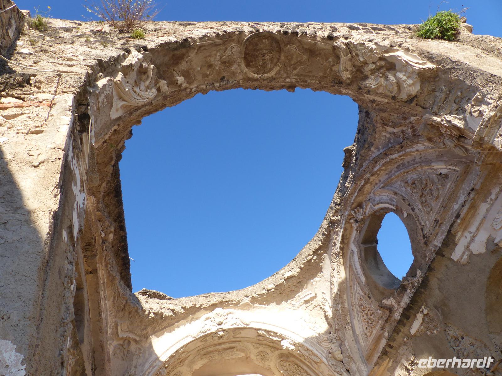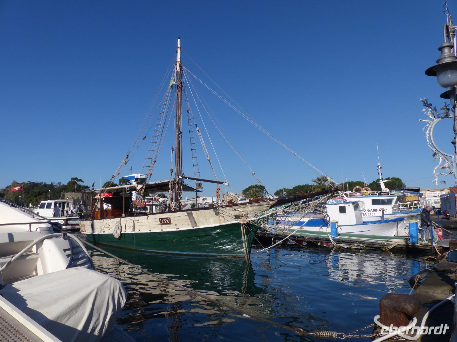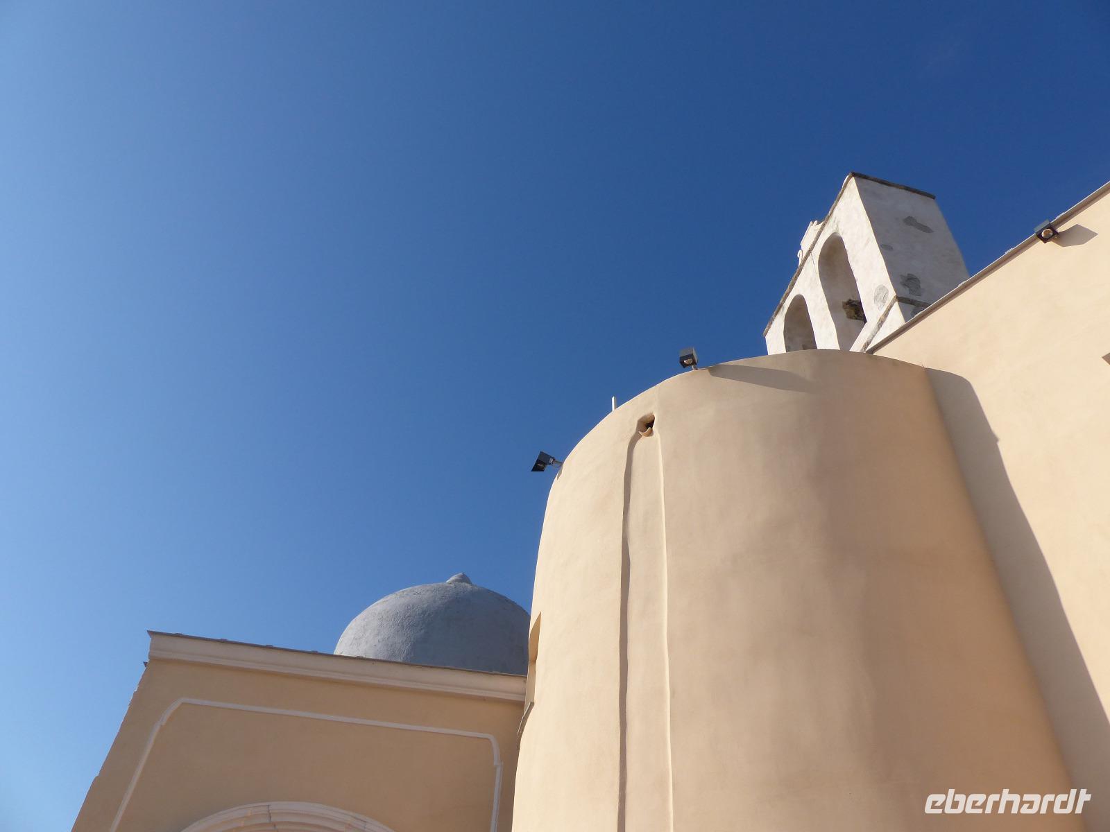 Nach kurzer Nacht ging's weiter. Um 10 Uhr fuhren wir zum Pineta, dem Pinienwäldchen, das Ponte von Porto trennt und liefen am alten Lavastrom entlang zum Strand. Dort trafen wir auf die ersten Neujahrsbader. Rote Badehose und rote Zipfelmütze. Ein Prachtexemplar zeigte sich uns. Aber um 12 Uhr, wenn das wilde Badevergnügen startet, waren wir bereits am Hafen von Porto und genossen unser Mittagsmahl. Auch am Strand konnten wir die Schäden, die das Unwetter hinterlassen hatte, gut sehen. Es wurde schon kräftig Sand hin- und hergeschoben und im Frühjahr wird man von diesen Spuren wohl nicht mehr viel sehen. Die meisten Läden in Ponte waren geschlossen und in der hellgelb leuchtenden Barockkirche fand ein Gottesdienst statt, so dass wir die Kirche nicht von innen ansehen konnten. Trotzdem war es schön hier entlang zu bummeln. Nach unserem Essen direkt am Wasser, wo wir kleine Holzboote dümpeln sahen, brachte uns der Bus nach Ponte. Mit dem Aufzug fuhren wir nach oben und besichtigten das Castello Aragonese. Das Castello Aragonese bot seinen Besuchern einige interessante und einige schöne Eindrücke. So besichtigten wir die Begräbnisplätze des Klarissenklosters im Keller, durchstreiften Kirchenruinen und durchwanderten den Teil des Gartens, der im Winter zugänglich ist, wo wir wunderschöne Aussichtspunkte flankiert vom blühenden Aloe erreichten, schauten uns im Wachhaus noch die schaurigen Werkzeuge, die man früher zur Bestrafung unliebsamer Artgenossen verwendet hatte, an und bummelten in der Dämmerung dieses blitzblauen Tages dann noch durch den schön beleuchteten Ort. Danach fuhren wir mit dem Bus zurück ins Hotel.