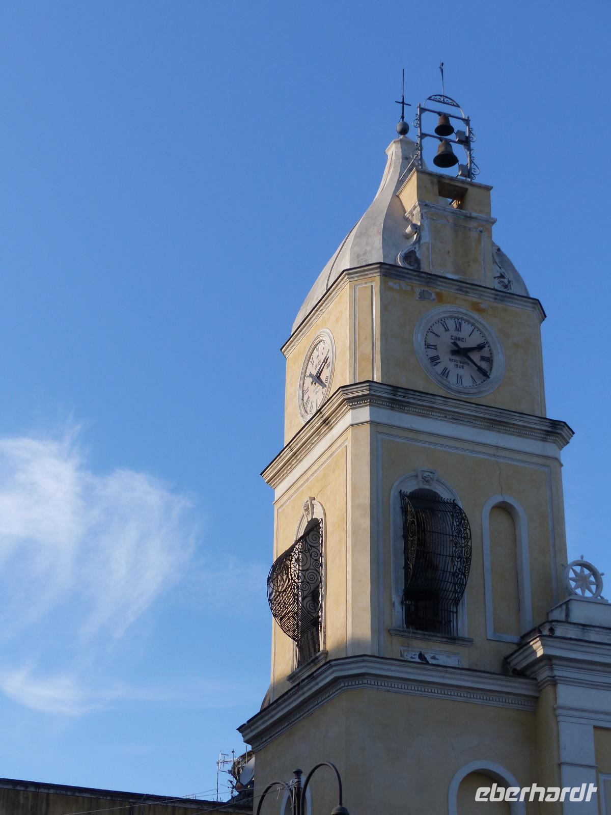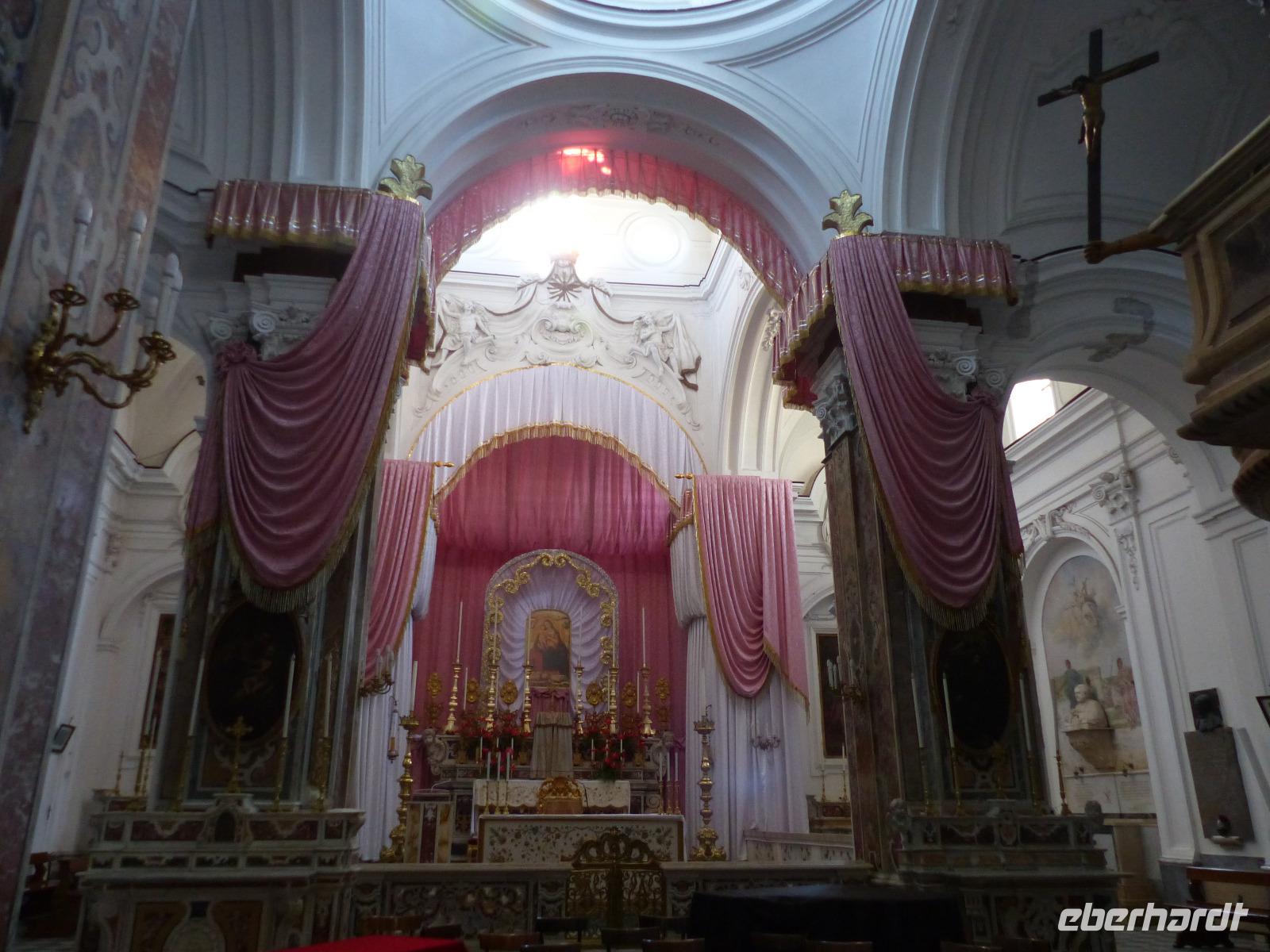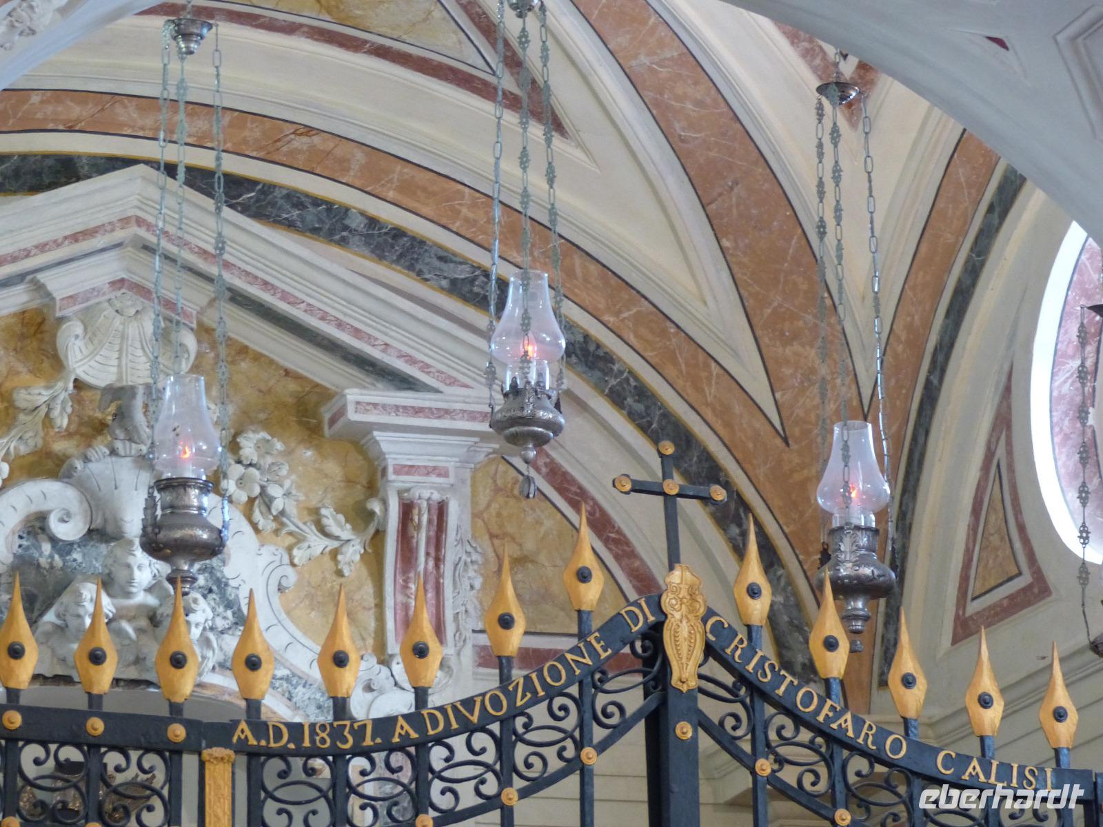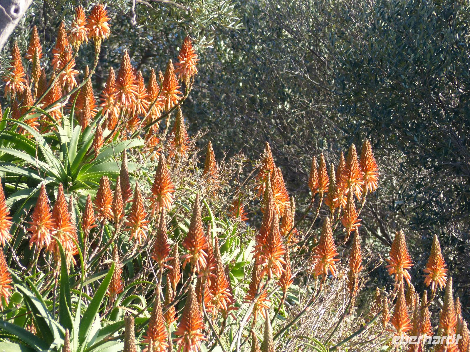 Nach kurzer Nacht ging's weiter. Um 10 Uhr fuhren wir zum Pineta, dem Pinienwäldchen, das Ponte von Porto trennt und liefen am alten Lavastrom entlang zum Strand. Dort trafen wir auf die ersten Neujahrsbader. Rote Badehose und rote Zipfelmütze. Ein Prachtexemplar zeigte sich uns. Aber um 12 Uhr, wenn das wilde Badevergnügen startet, waren wir bereits am Hafen von Porto und genossen unser Mittagsmahl. Auch am Strand konnten wir die Schäden, die das Unwetter hinterlassen hatte, gut sehen. Es wurde schon kräftig Sand hin- und hergeschoben und im Frühjahr wird man von diesen Spuren wohl nicht mehr viel sehen. Die meisten Läden in Ponte waren geschlossen und in der hellgelb leuchtenden Barockkirche fand ein Gottesdienst statt, so dass wir die Kirche nicht von innen ansehen konnten. Trotzdem war es schön hier entlang zu bummeln. Nach unserem Essen direkt am Wasser, wo wir kleine Holzboote dümpeln sahen, brachte uns der Bus nach Ponte. Mit dem Aufzug fuhren wir nach oben und besichtigten das Castello Aragonese. Das Castello Aragonese bot seinen Besuchern einige interessante und einige schöne Eindrücke. So besichtigten wir die Begräbnisplätze des Klarissenklosters im Keller, durchstreiften Kirchenruinen und durchwanderten den Teil des Gartens, der im Winter zugänglich ist, wo wir wunderschöne Aussichtspunkte flankiert vom blühenden Aloe erreichten, schauten uns im Wachhaus noch die schaurigen Werkzeuge, die man früher zur Bestrafung unliebsamer Artgenossen verwendet hatte, an und bummelten in der Dämmerung dieses blitzblauen Tages dann noch durch den schön beleuchteten Ort. Danach fuhren wir mit dem Bus zurück ins Hotel.