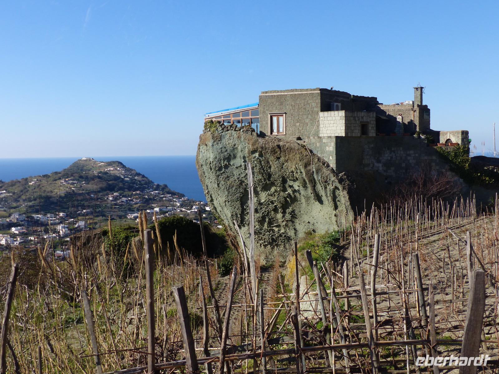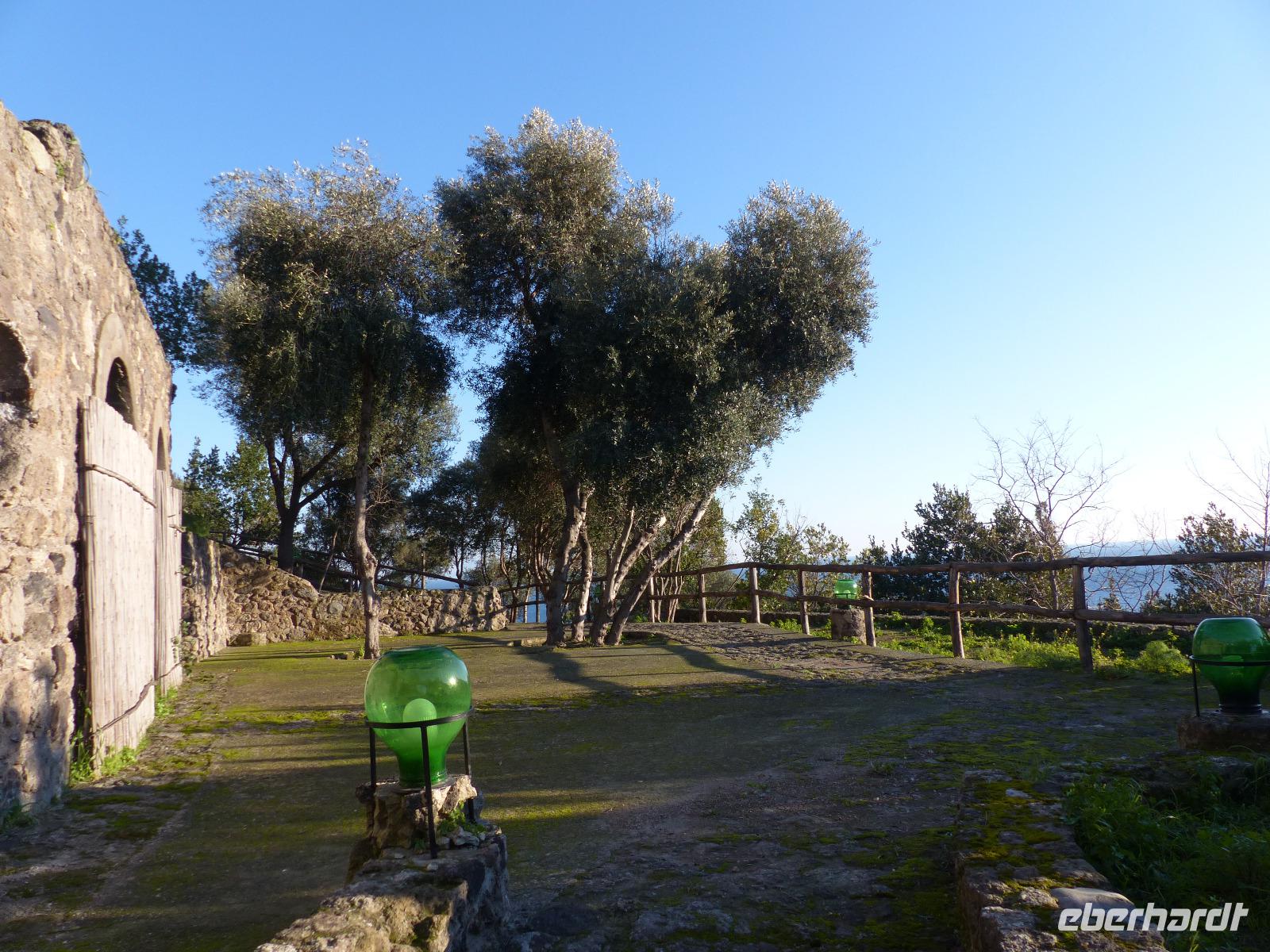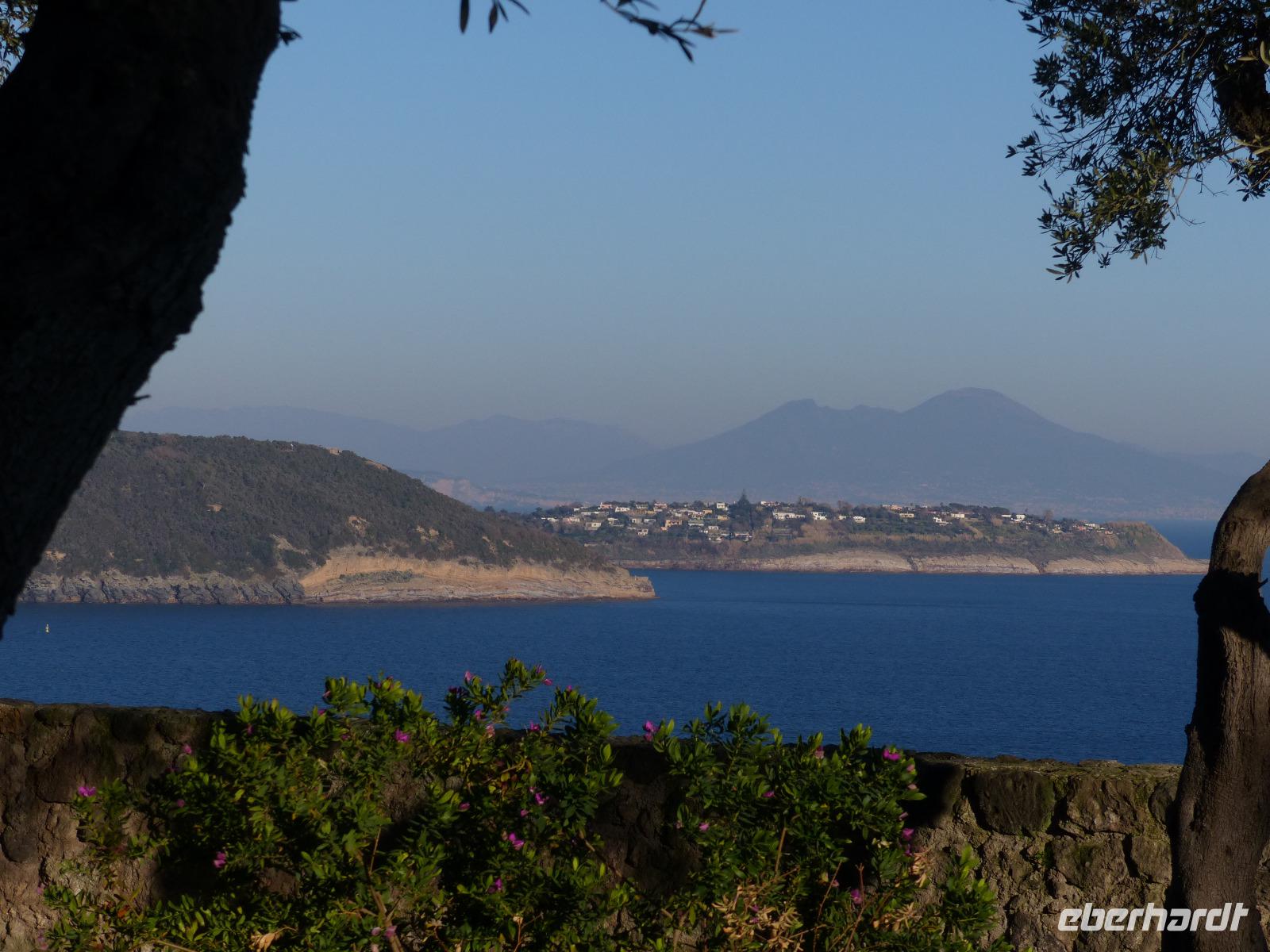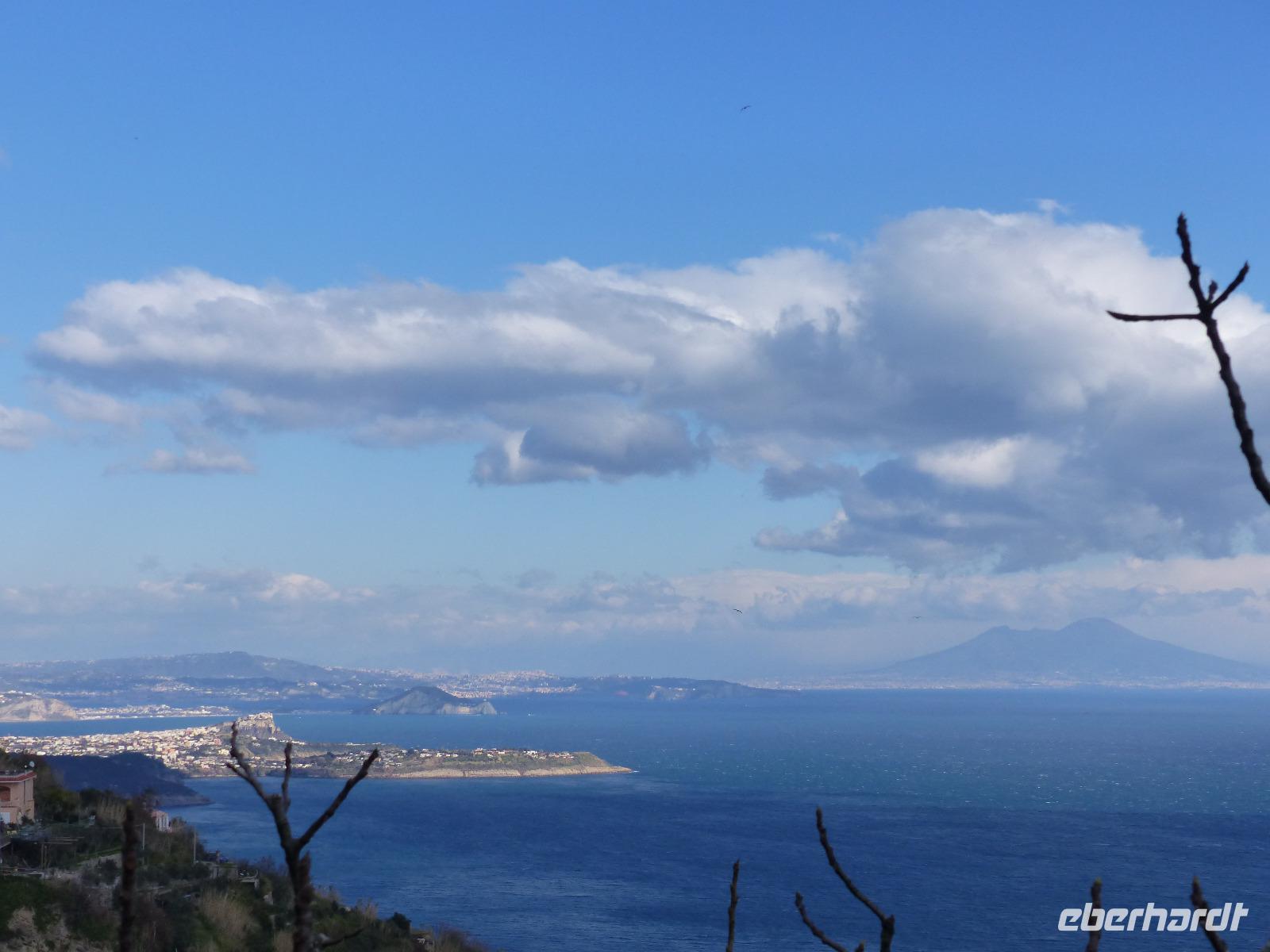 Rund die Hälfte der Gruppe nahm heute an der fakultativen Wanderung mit Biagio teil. Die andere Hälfte der Gruppe genoss diesen Tag beim Einkaufsbummel und in Cafés, je nach persönlichen Wünschen. Morgens starteten wir bei leicht bewölktem Himmel in Vatoliere. Nach einem kleinen Kaffee zogen wir los über einen Pfad, der uns durch Felder und an Häusern vorüber zur Kirche Montevergine führte. Ein kleines Rotkehlchen lud zum Fototermin ein, denn es hüpfte recht zahm auf dem Zaun vor der Kirche entlang. Dann folgte ein etwas mühevollerer Aufstieg, den aber alle Gäste mit Bravour hinter sich brachten und danach tat sich eine herrliche Aussicht auf die Steilküste auf. Weiter ging's, an Schilf und Weinbergen vorüber. Überall blühte der Sauerklee in leuchtendem Hellgelb. Wir passierten die Ruinensiedlung Piano Liguori und erreichten schließlich eine kleine Trattoria mitten in den Weinbergen, die eine wunderschöne Aussichtsterrasse hatte. Unser Blick fiel auf Capri und auf die Küste bei Sorrent. Hier wurden uns Bruschette und ein leckerer Salat aufgetischt, bevor wir weiter nach Campagnano wanderten. Wieder eine tolle Aussicht: vor uns lag im Meer das Castello Aragonese und auch Procida konnten wir gut sehen. Am Horizont ragten die Vulkane der Campi Flegrei und der Vesuv in den Himmel. Biagio führte uns dann noch in eine Höhle. Dort lagerte Wein. Der Besitzer ließ uns diesen verkosten und auch den selbst gemachten Limoncello bot er uns an. Wer sich versorgen wollte konnte dies. Zum Kauf hatte der Weinbauer in leeren Coca-Cola-Flaschen den leckeren Limoncello gut verpackt. Danach brachte uns der Bus wieder zum Hotel zurück.
