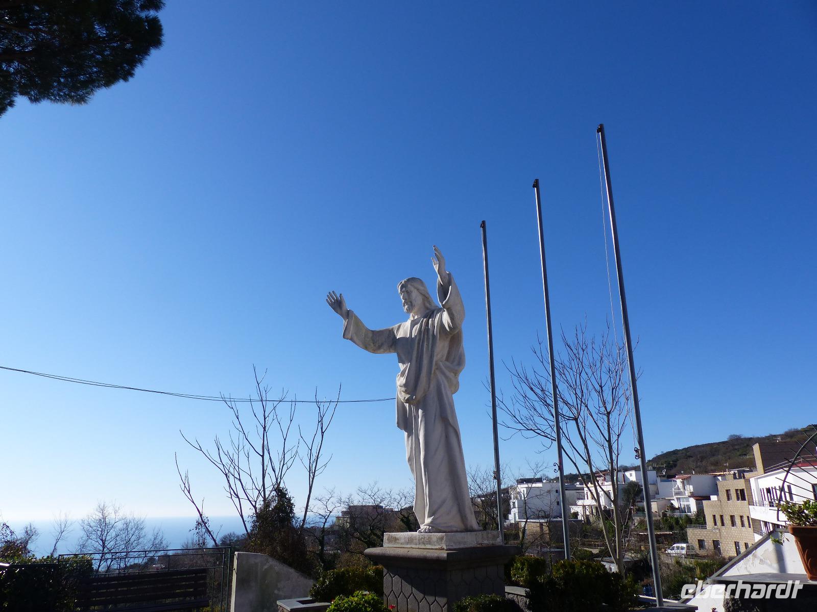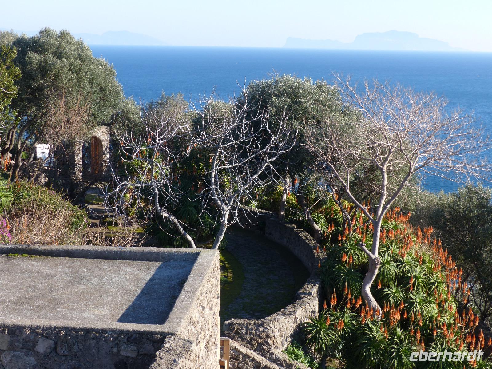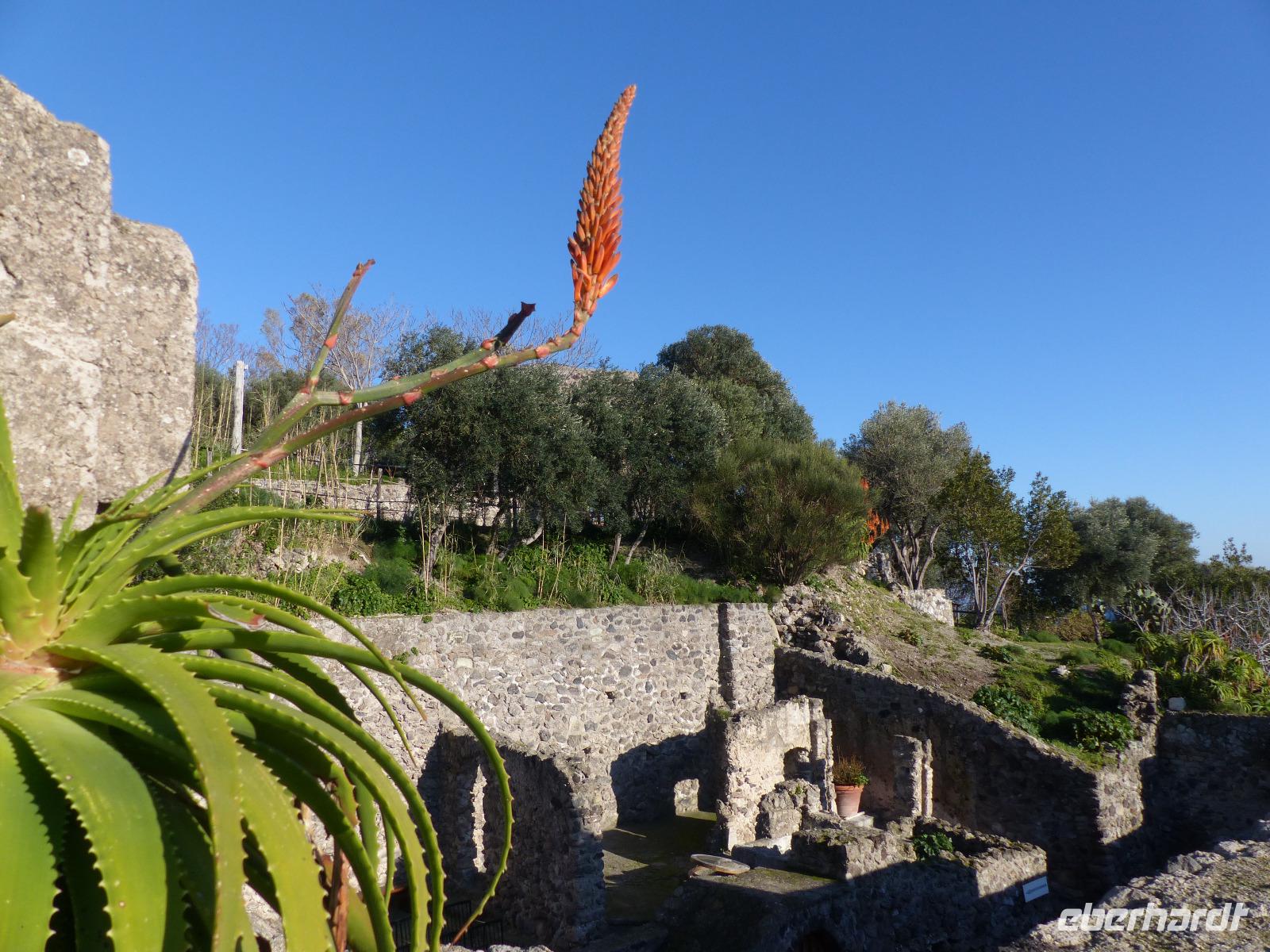 Unser Tag begann mit einem Treffen mit Giovanni, dem Agenturchef, der uns das Wochenprogramm vorstellen wollte. Danach erwartete uns Brigitte, unsere örtliche Reiseleiterin, die uns durch den hübschen Ort Forio führte. Wir wohnten oberhalb von Forio, in Fango. Daher brachte uns der Bus runter ins Zentrum. Strahlend blauer Himmel mit ein paar kleinen Wölkchen - aber es war kalt. Vorüber an altem Gemäuer ging es nun. Wir bestaunten die Mandarinen- und Orangenbäume in den Gärten, die voller Früchte hingen, bummelten schließlich durch die Fußgängerzone zur malerisch gelegenen Kirche Chiesa del Soccorso und schauten auf das blitzblaue Meer. Kurz vor Weihnachten hatte es in Süditalien mächtig gestürmt und die hintere Uferstraße von Forio war stark beschädigt worden, so dass sie nun gesperrt war. Unseren Stadtspaziergang beeinträchtigte das allerdings nicht. In Forio verbrachten wir unsere Mittagspause und jeder Gast konnte hier noch ein Stündchen lange tun und lassen was er wollte, bevor uns der Bus an den Stadtrand brachte. Der Garten La Mortella war unser nächstes Ziel. Monika empfing uns hier und führte uns sachkundig durch den winterlich blühenden Garten. Pampelmusen hingen an den Bäumen. Bromelien blühten. Und die Kamelienbüsche standen in voller Blüte. Die empfindlichen Pflänzchen waren in Gewächshäusern verstaut, aber sehr viele Pflanzen blühen hier auch mitten im Winter. Riesige Strelizien erheben sich zwischen Baumfarnen, Bambus und Palmen. Blühende Rosmarinhecken und blühender Aloe. Und fröhlich zwitschernde Vögel im Vogelhaus. Monika erzählte uns die Geschichte des Gartens. Der englische Komponist Sir William Walton hatte die 24 Jahre jüngere Argentinierin Susanna geheiratet und beide suchten nach einem Domizil für ihren gemeinsamen Lebensweg. Ein kahler Steinbruch reizte Lady Susanna. Genau hier ließen sie sich nieder und es wurde zu ihrem Lebenswerk aus diesem Steinbruch eine grüne Idylle zu machen. Heute, nach dem Tod der beiden, gibt es zwei Stiftungen, denen das kinderlose Paar sein Vermögen vermachte. Die eine Stiftung fördert Nachwuchsmusiker, die andere bemüht sich um den Erhalt des wunderschönen Gartens, der im Winter nur mit vorgebuchter Führung betreten werden kann. Wir hatten also das wunderschöne Terrain fast für uns alleine! Meditative Plätzchen, plätscherndes Wasser, herrliche Aussichtspunkte und eine wunderschöne, friedliche Stimmung - wir haben diesen Besuch sehr genossen!