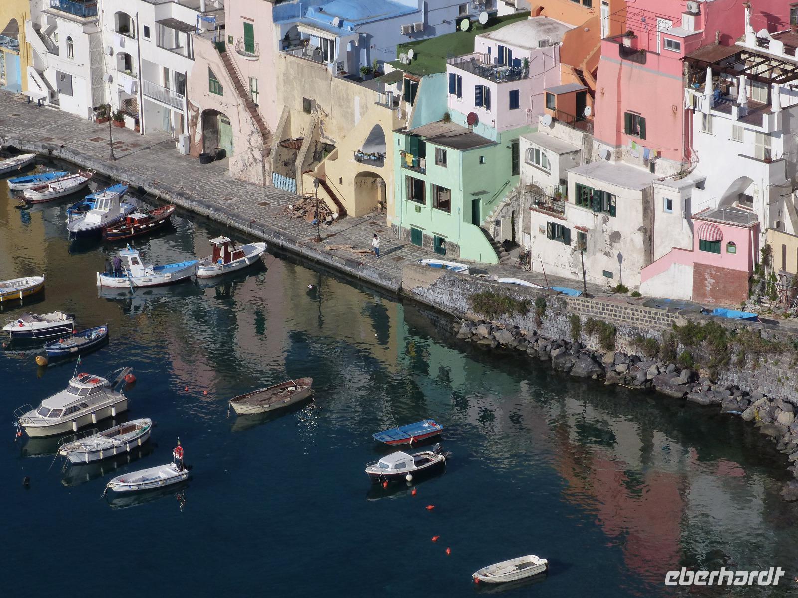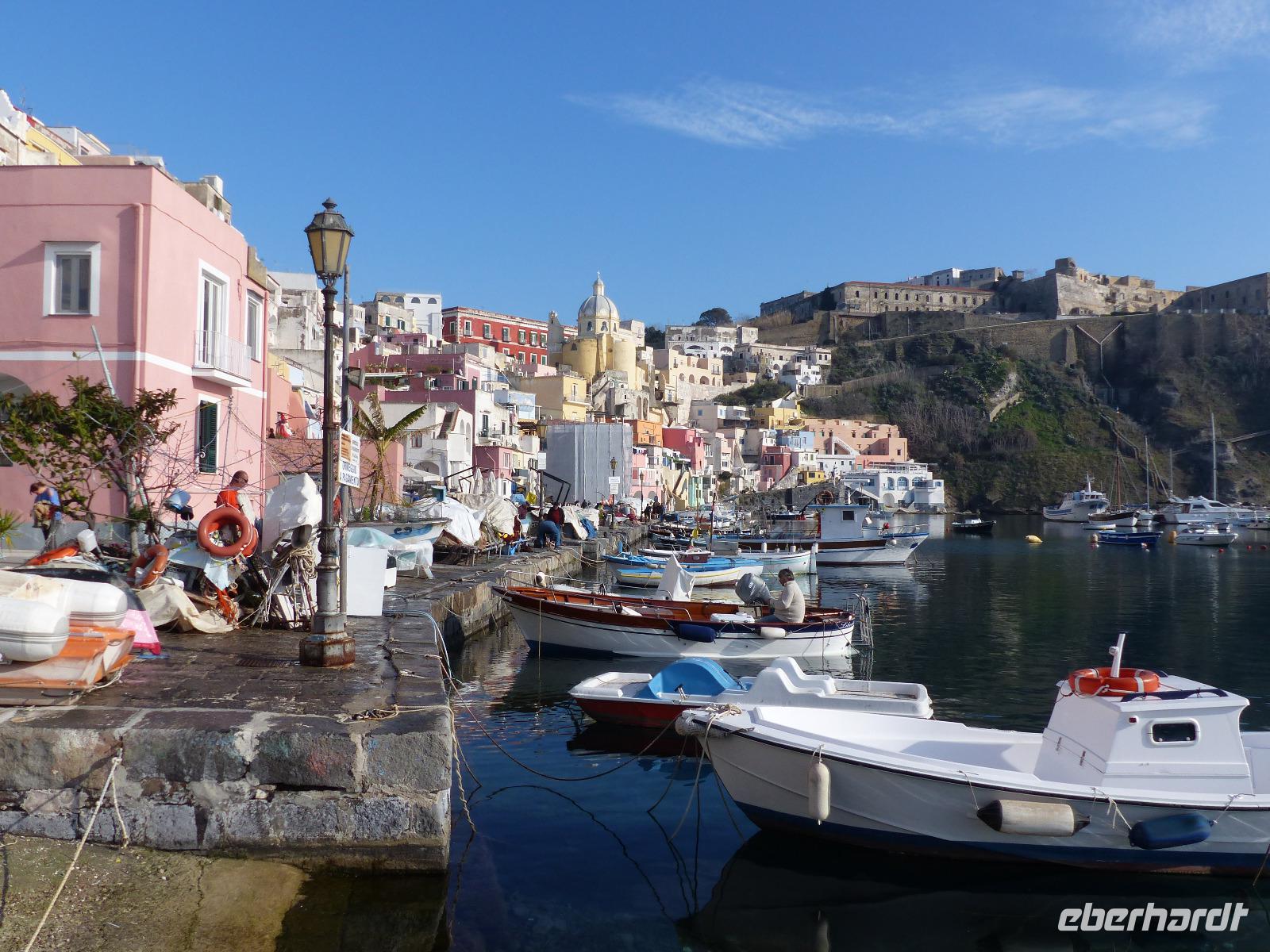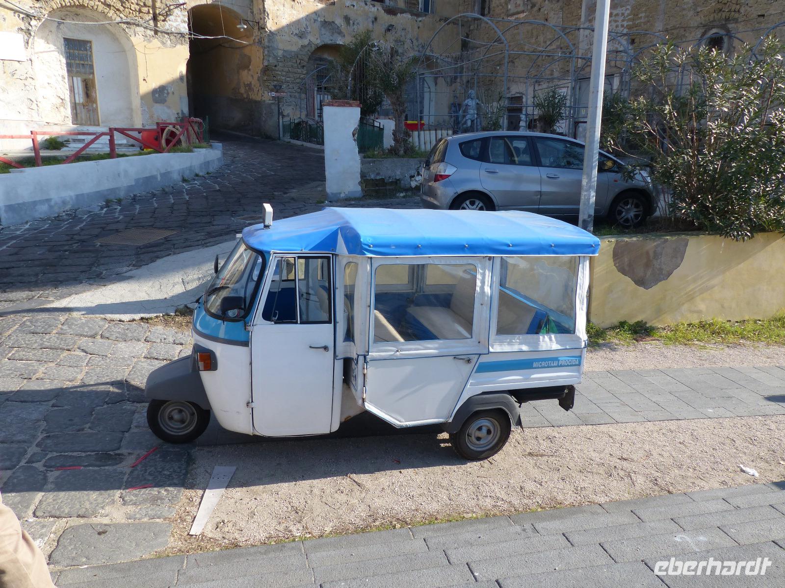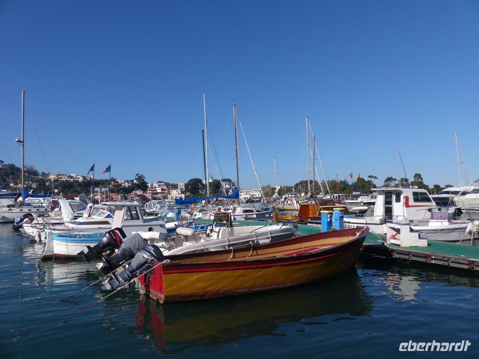 Heute mussten wir alle pünktlich sein - Schiffe warten nicht! Um 9 Uhr ging's los. Der Bus brachte uns an den Hafen von Casamicciola, wo uns Biagio erwartete, und per Schnellfähre ging's ab nach Procida, wo wir in Sancio Cattolico anlegten. Biagio verteilte uns in mehrere Taxis, einige normale und ein Microtaxi, bestehend aus einer Ape. Die Apefahrer hatten heute ihr privates Abenteuer. Wir fuhren laut knatternd hoch zur Festung Terra Murata, dem ummauerten Land, genossen dort die Aussicht, bewunderten die Kirche und zogen abwärts am Denkmal des Politikers Scialoja vorbei zum romantischen Hafen von Corricella. Hier war der in Italien zum Kultfilm gewordene Streifen „Il postino", eine nette Geschichte über den Briefträger Nablo Nerudas, gedreht worden. Danach umfuhren die Taxis mit uns die Insel und nach einer Fotopause landeten wir mal wieder vor vollen Tellern: sehr leckere Antipasti gibt's auch auf Procida! Nach einem kurzen Bummel durch Sancio Cattolico ging's mit dem Schiff am Nachmittag dann zurück nach Ischia. Dieses Schiff legte nun im Hafen von Porto an, einem alten Vulkankrater, der erst im 19. Jh. zum Fährhafen ausgebaut wurde. Ein Teil der Gäste verließ bereits unten am Meer in Lacco Ameno den Bus, der uns am Hafen von Porto abgeholt hatte und der die Gruppe zurück ins Hotel brachte. Beim Abendessen trafen wir uns alle wieder und von mir gab es wie auf den meisten meiner Reisen ein Abschiedsgedicht.