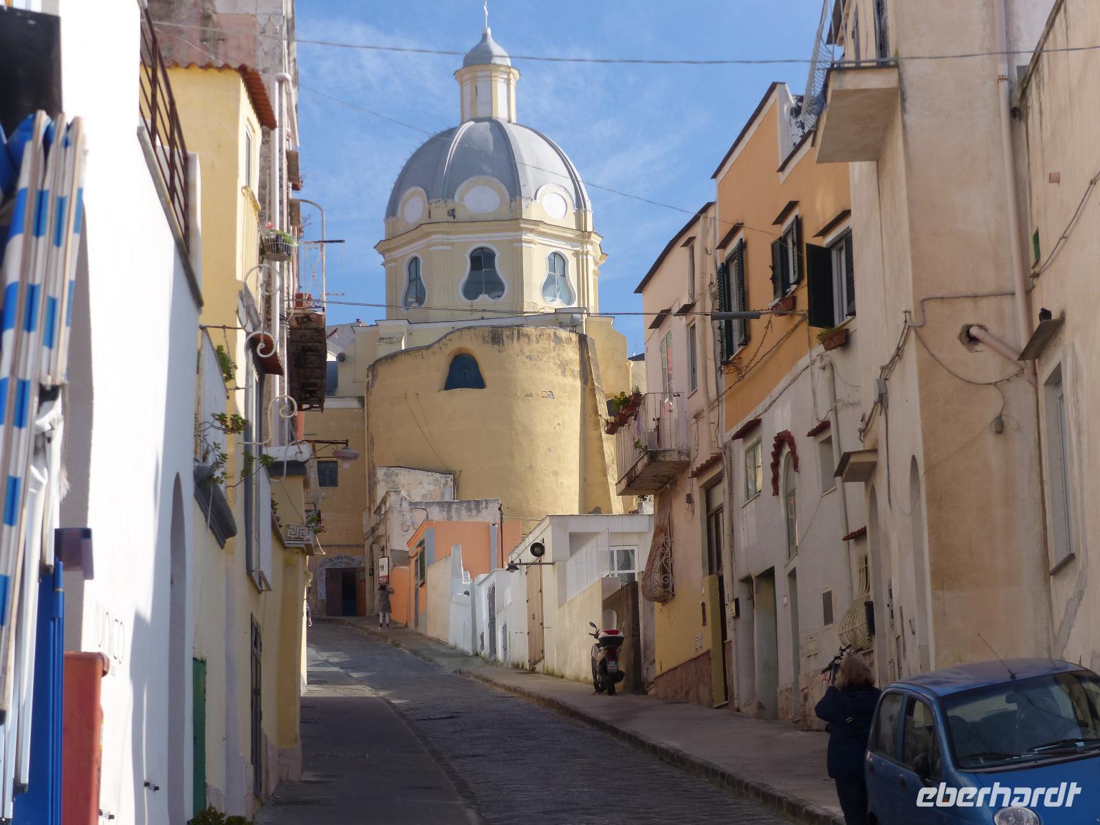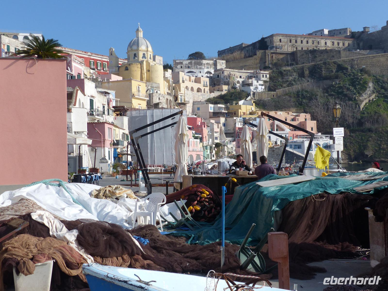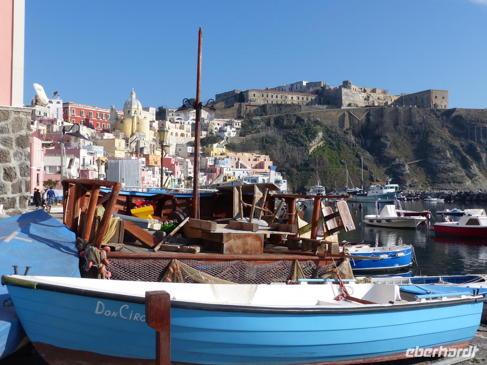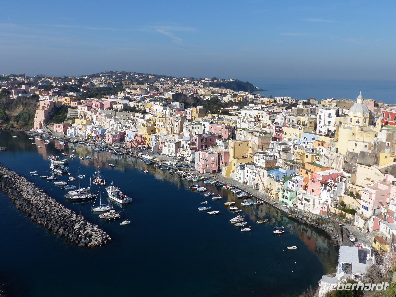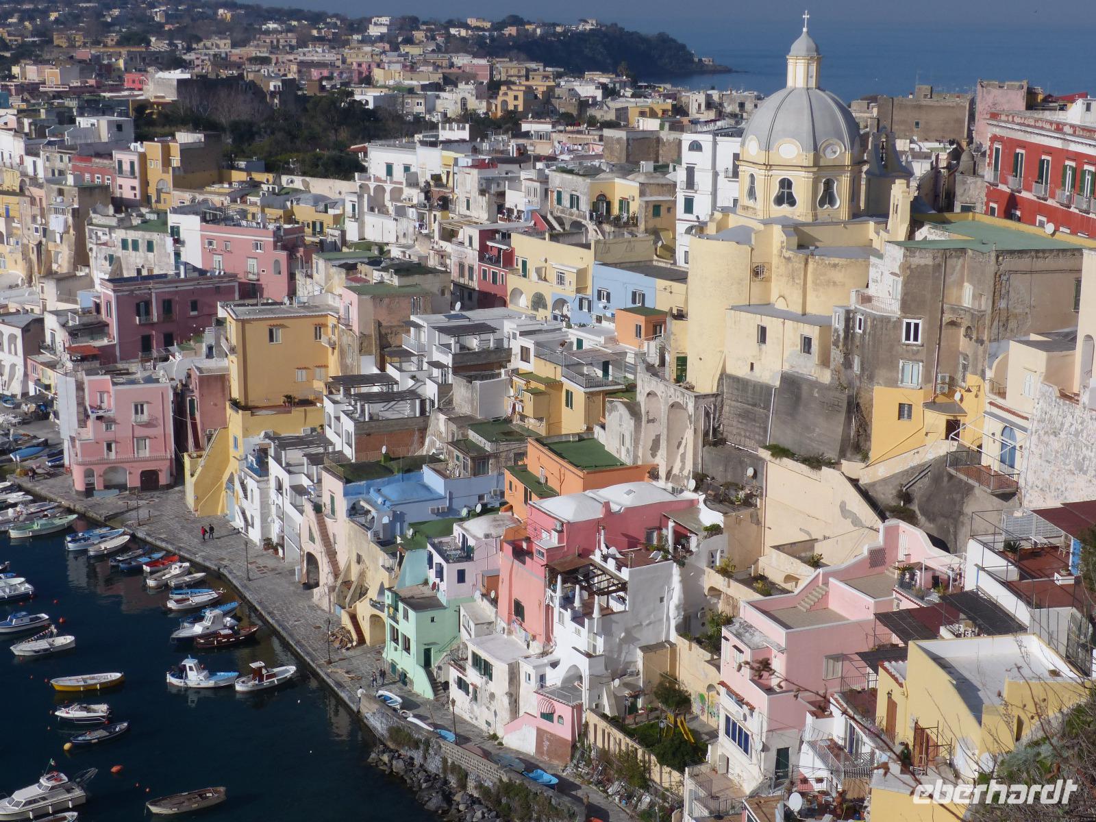 Heute mussten wir alle pünktlich sein - Schiffe warten nicht! Um 9 Uhr ging's los. Der Bus brachte uns an den Hafen von Casamicciola, wo uns Biagio erwartete, und per Schnellfähre ging's ab nach Procida, wo wir in Sancio Cattolico anlegten. Biagio verteilte uns in mehrere Taxis, einige normale und ein Microtaxi, bestehend aus einer Ape. Die Apefahrer hatten heute ihr privates Abenteuer. Wir fuhren laut knatternd hoch zur Festung Terra Murata, dem ummauerten Land, genossen dort die Aussicht, bewunderten die Kirche und zogen abwärts am Denkmal des Politikers Scialoja vorbei zum romantischen Hafen von Corricella. Hier war der in Italien zum Kultfilm gewordene Streifen „Il postino", eine nette Geschichte über den Briefträger Nablo Nerudas, gedreht worden. Danach umfuhren die Taxis mit uns die Insel und nach einer Fotopause landeten wir mal wieder vor vollen Tellern: sehr leckere Antipasti gibt's auch auf Procida! Nach einem kurzen Bummel durch Sancio Cattolico ging's mit dem Schiff am Nachmittag dann zurück nach Ischia. Dieses Schiff legte nun im Hafen von Porto an, einem alten Vulkankrater, der erst im 19. Jh. zum Fährhafen ausgebaut wurde. Ein Teil der Gäste verließ bereits unten am Meer in Lacco Ameno den Bus, der uns am Hafen von Porto abgeholt hatte und der die Gruppe zurück ins Hotel brachte. Beim Abendessen trafen wir uns alle wieder und von mir gab es wie auf den meisten meiner Reisen ein Abschiedsgedicht.