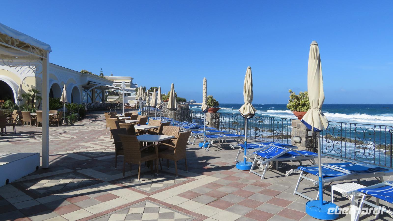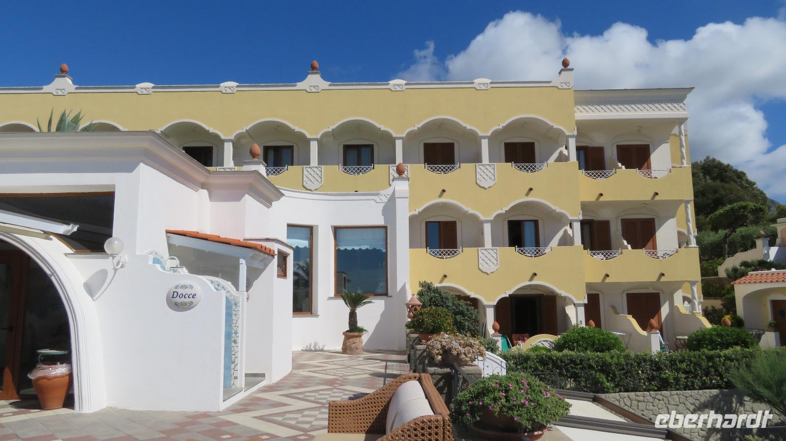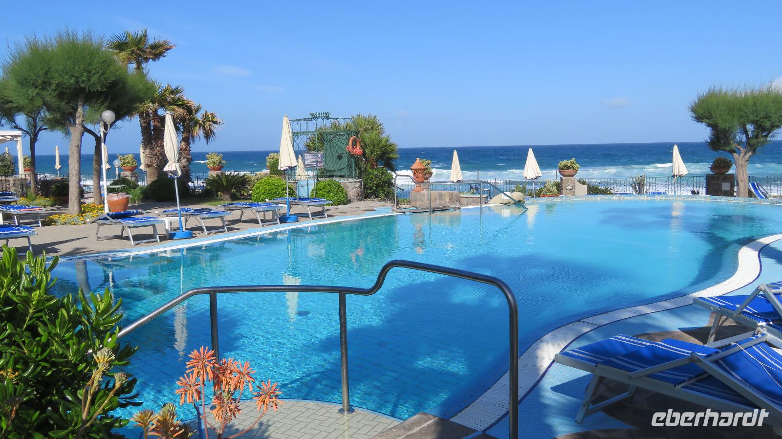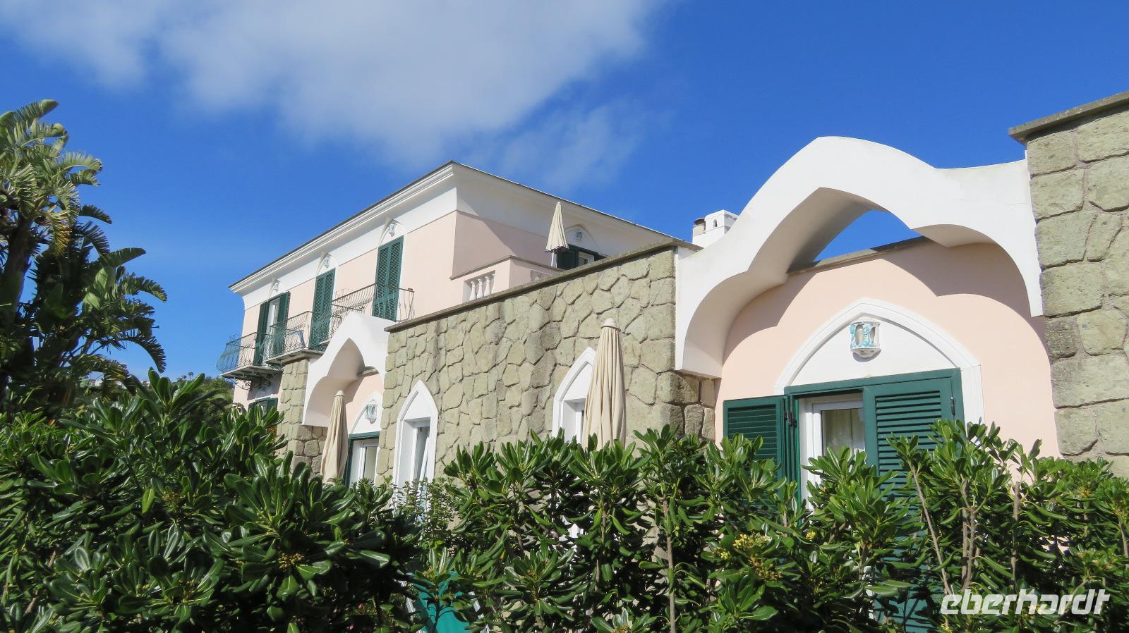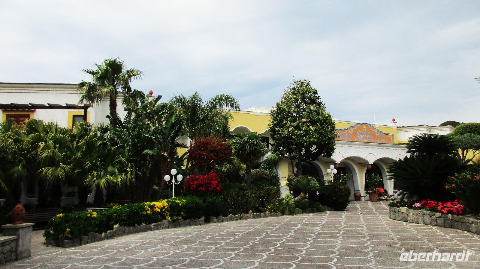 Aber ein Fahrradrennen hat unsere Pläne zwangsweise geändert. So beginnen wir mit einem ruhigem Tag. Allerdings hat uns unsere italienische Reiseleiterin Raffaella morgens an die Bar eingeladen, um uns einige Informationen über die Insel zu geben. Mit einem Prosecco stoßen wir auf die schönen Tage an. Am Nachmittag kann man im Hotel relaxen, in der herrlichen Anlage spazieren, sich am Meer oder in den Gärten sonnen, baden in Meer, Pool, und verschiedenen Thermalbecken. Einige Gäste spazieren nach Forio und genießen das Sonntagsflair in der hübschen fast schon maurisch anmutenden Stadt. Auch die Italiener vom Festland hat es am Sonntag bei dem schönen Wetter zum Promenieren auf die Insel gezogen.