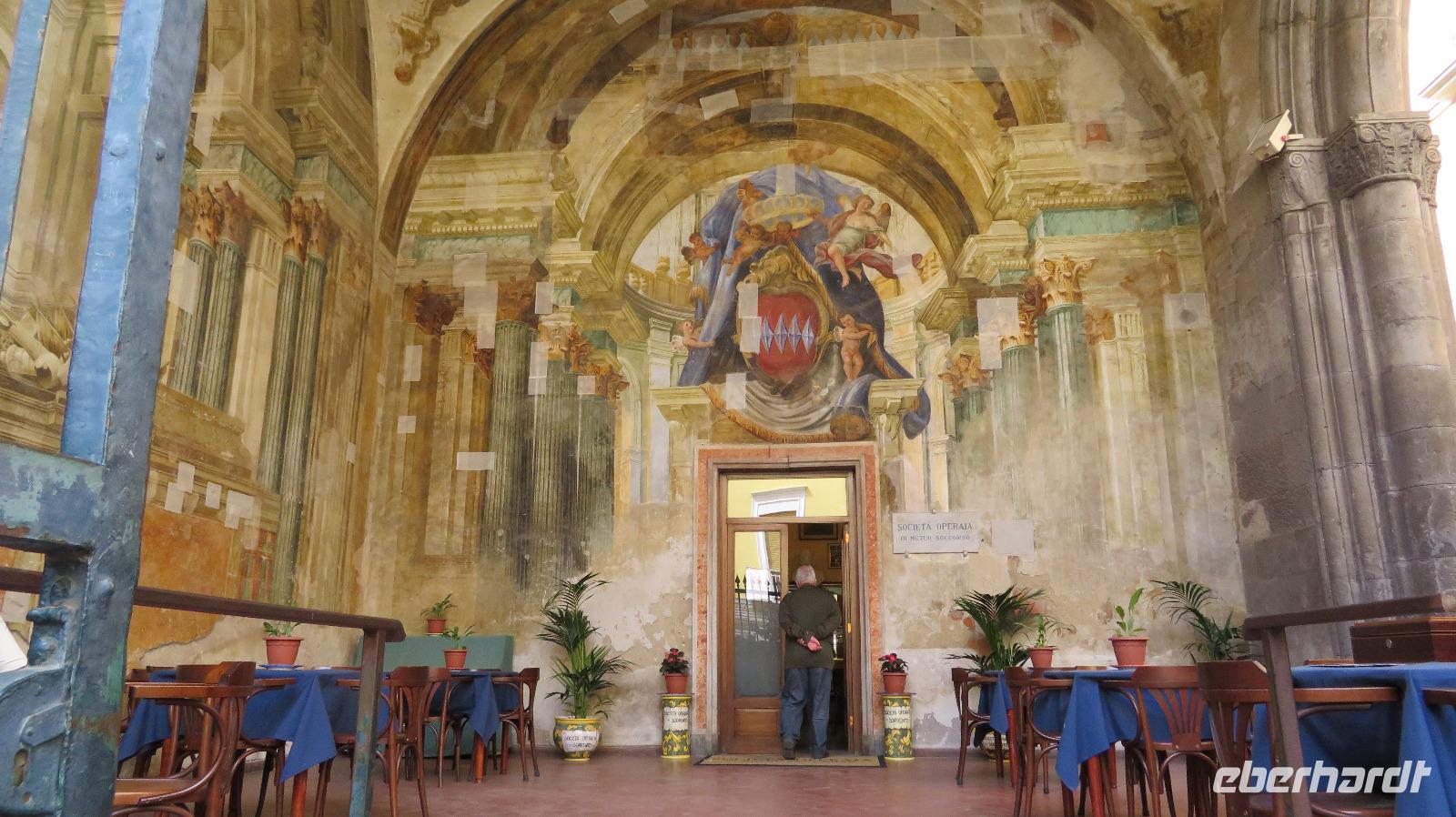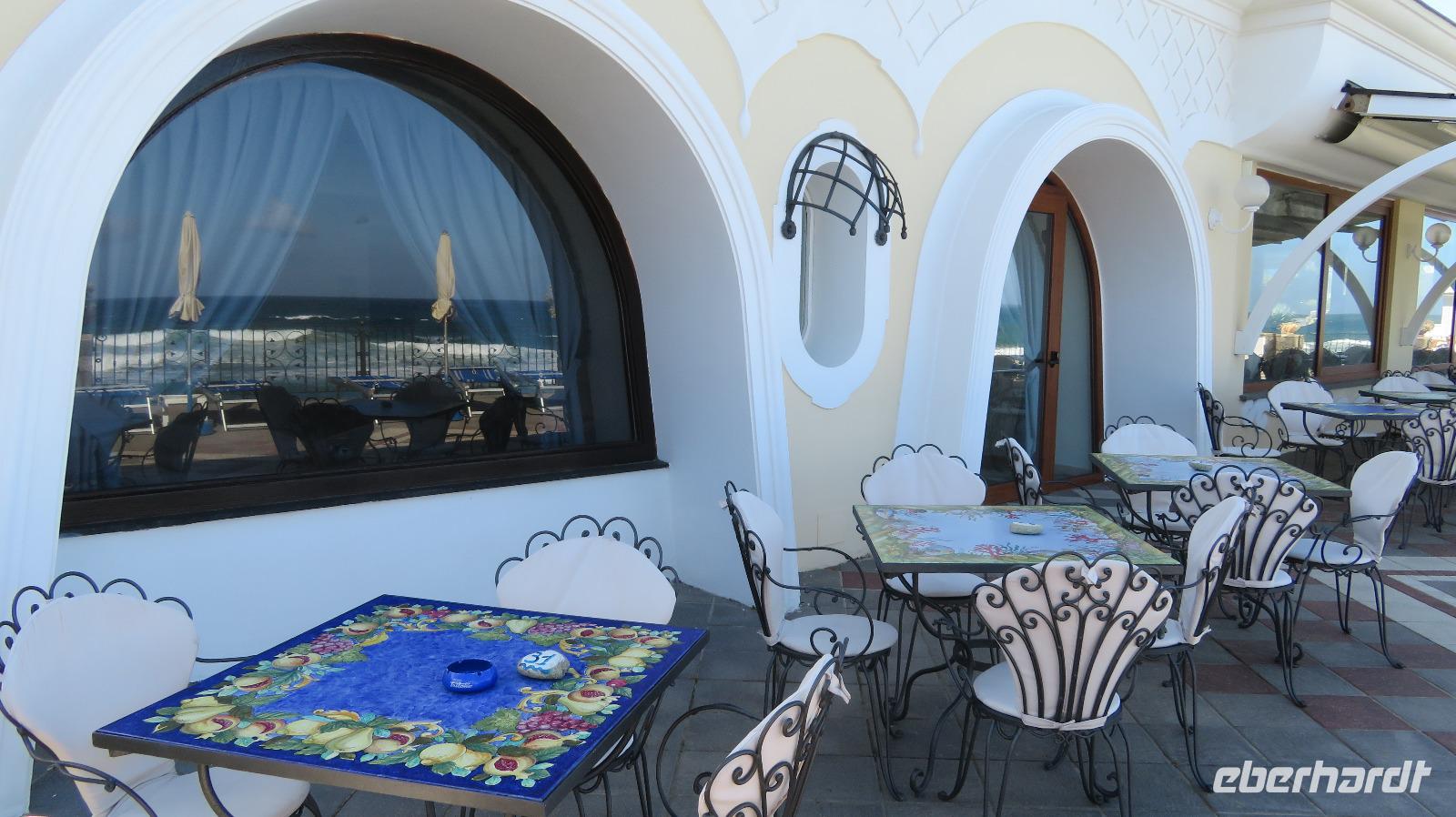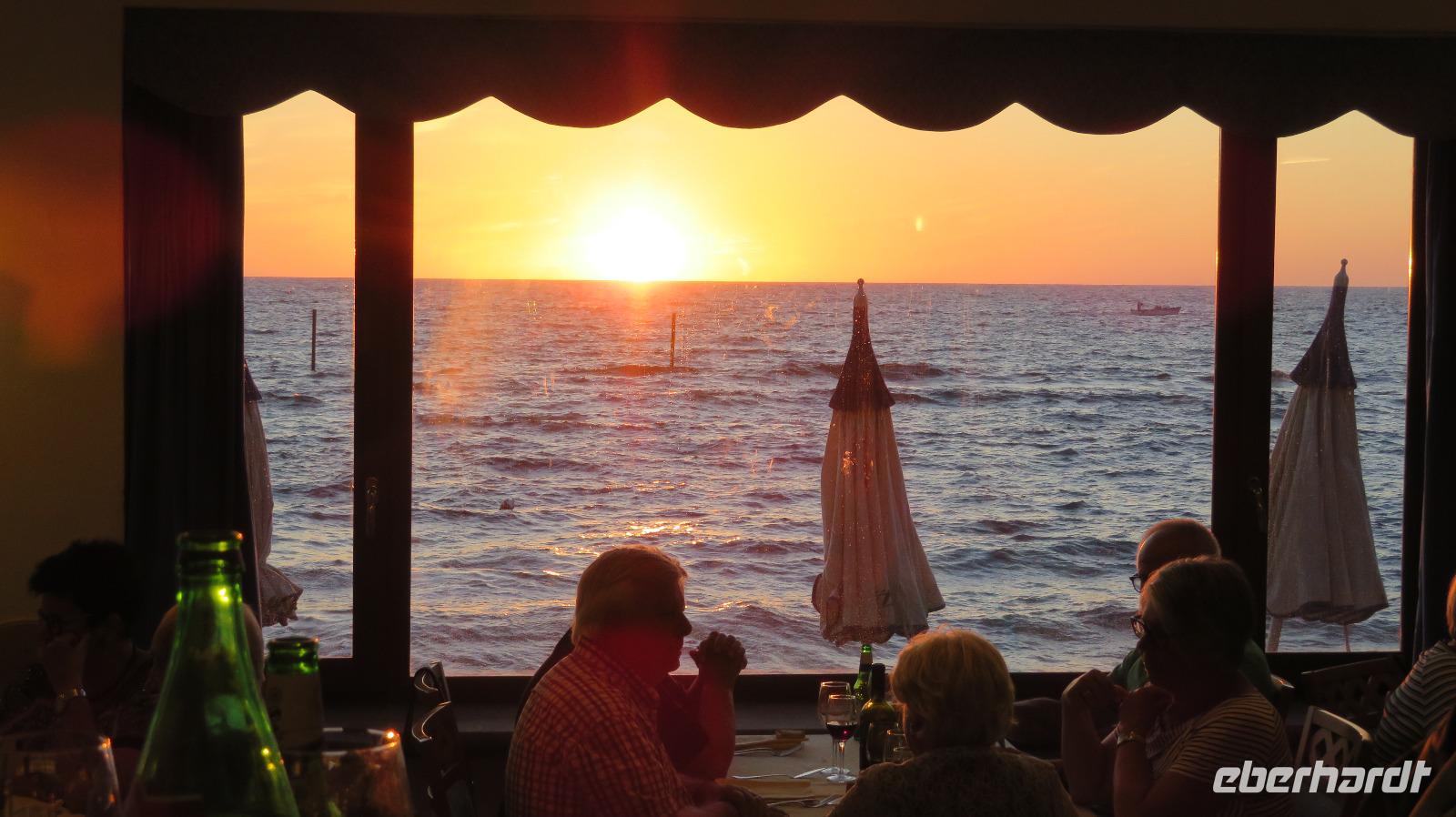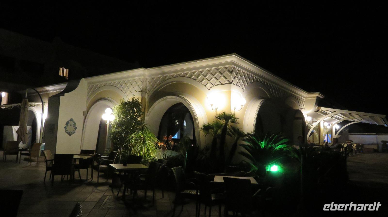 Hier begeistert uns ein umfangreiches Antipastibuffet, und die aufmerksamen und freundlichen Kellner nehmen unsere Wünsche an Vorspeisen und Hauptgerichten entgegen. Wir können zwischen fünf verschiedenen Angeboten wählen. Die Auswahl fällt immer schwer, denn das Essen ist ausgezeichnet.