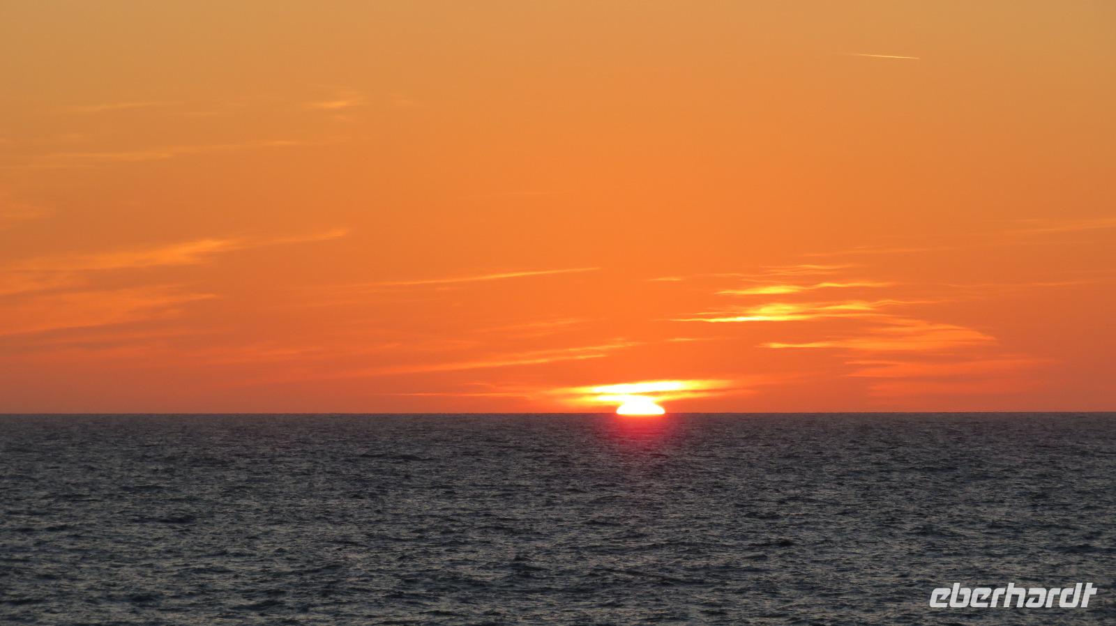 Vom Speisesaal können wir heute einen besonders schönen Sonnenuntergang verfolgen, "wenn bei Capri (oder Ischia) die rote Sonne im Meer versinkt ...", wir können das Rot bestätigen!