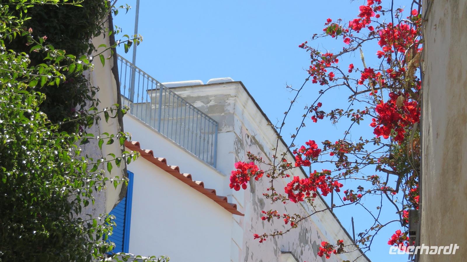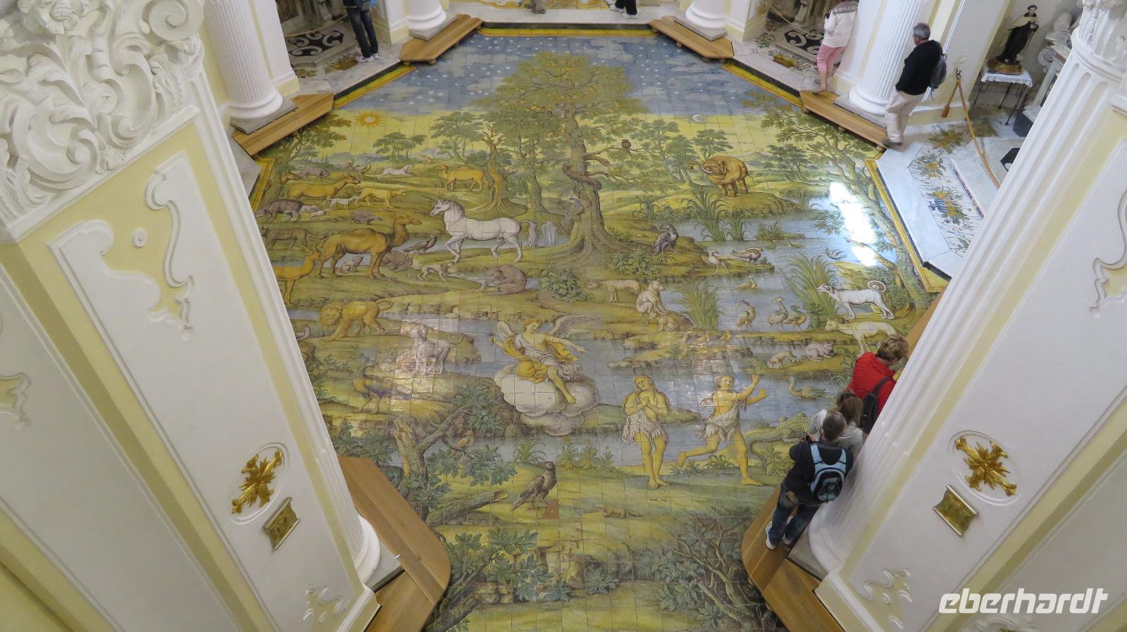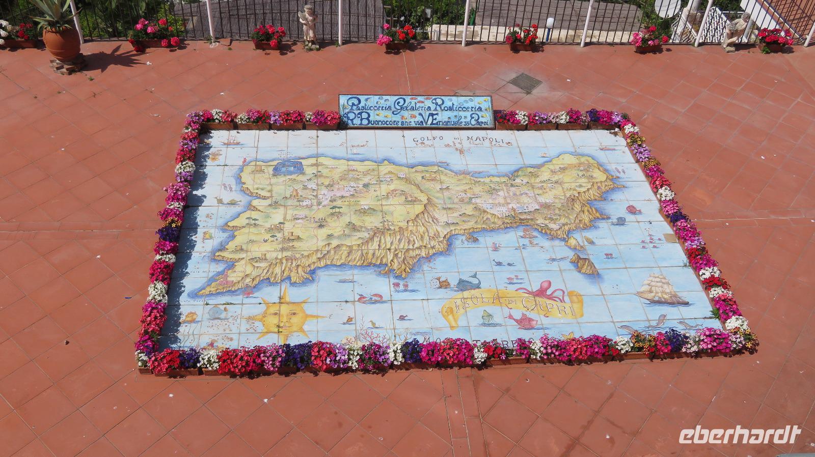 Mit einem Kleinbus fahren wir zuerst hinauf nach Anacapri. Wir spazieren durch die engen Gassen, schauen uns in der Kirche San Michele den phantastischen Majolika-Fußboden an.