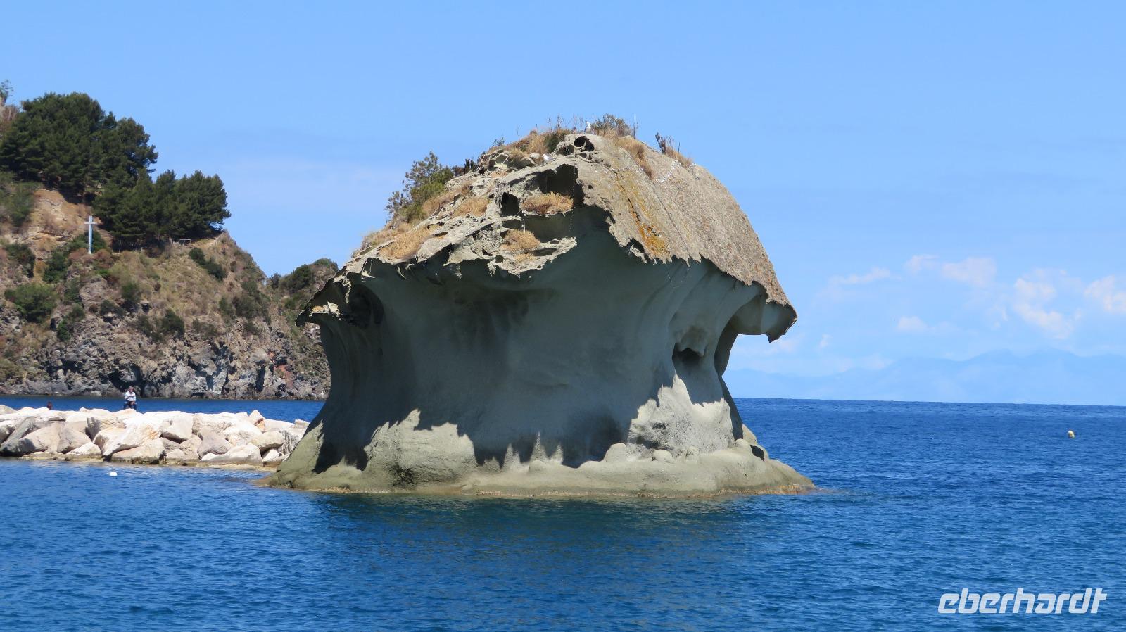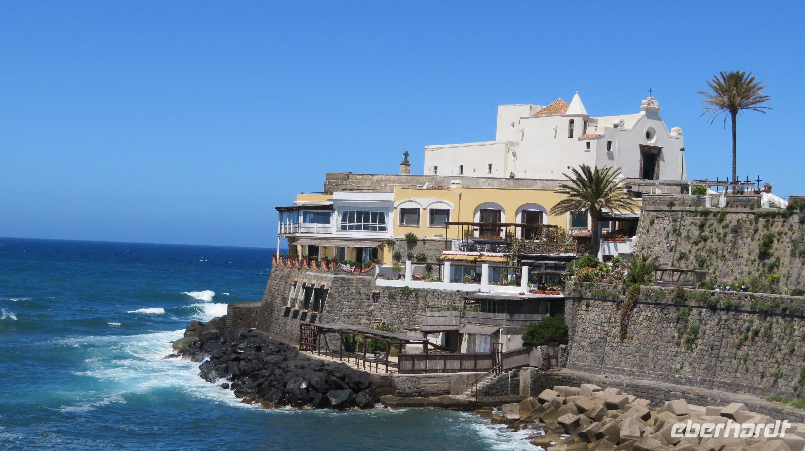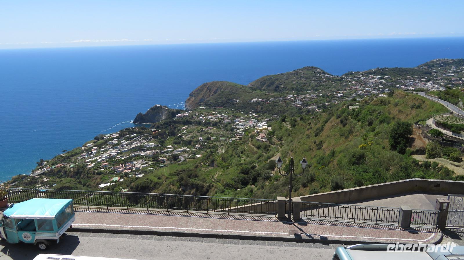 In Lacco Ameno legen wir einen kurzen Fotostopp ein, um den "Pilz" zu fotografieren und spazieren dann durch Ischia Ponte, wo wir einen Blick auf das Castello Aragonese werfen können. Da ein Betonfahrzeug unser Weiterkommen auf der einzigen Inselstraße behindert, hat Brigitte die gute Idee, noch einen Abstecher zu einem Aussichtspunkt über den Marontibeach zu machen. Ein toller Blick auf den herrlichen Strand mit San Angelo im Hintergrund. Wir können sogar das Hotel erkennen, wo unsere Kanzlerin öfters Urlaub gemacht hat. Im Bergort Serrara Fontana nehmen wir ein Mittagessen ein und probieren den berühmten Zitronenlikör der neapolitanischen Küste, den Limoncello. Ein herrlicher Tag mit fabelhafter Sicht läßt uns über das Tyrrhenische Meer bis zur Halbinsel von Sorrent und zur Insel Capri blicken. Unter uns der Felsen von San Angelo. Der Bus bringt uns noch dorthin, so dass wir auch dieses idyllische Dörfchen kennenlernen können. Und für Orqangensaft, Eis oder Cappuccino reicht die Zeit auch noch. Vorher hatten wir auch noch eine kleine Felsenkirche besucht.