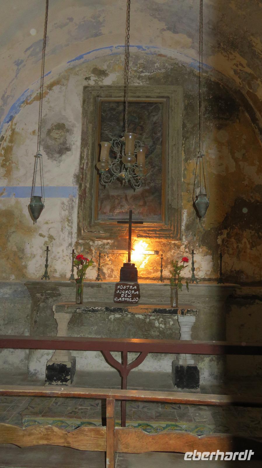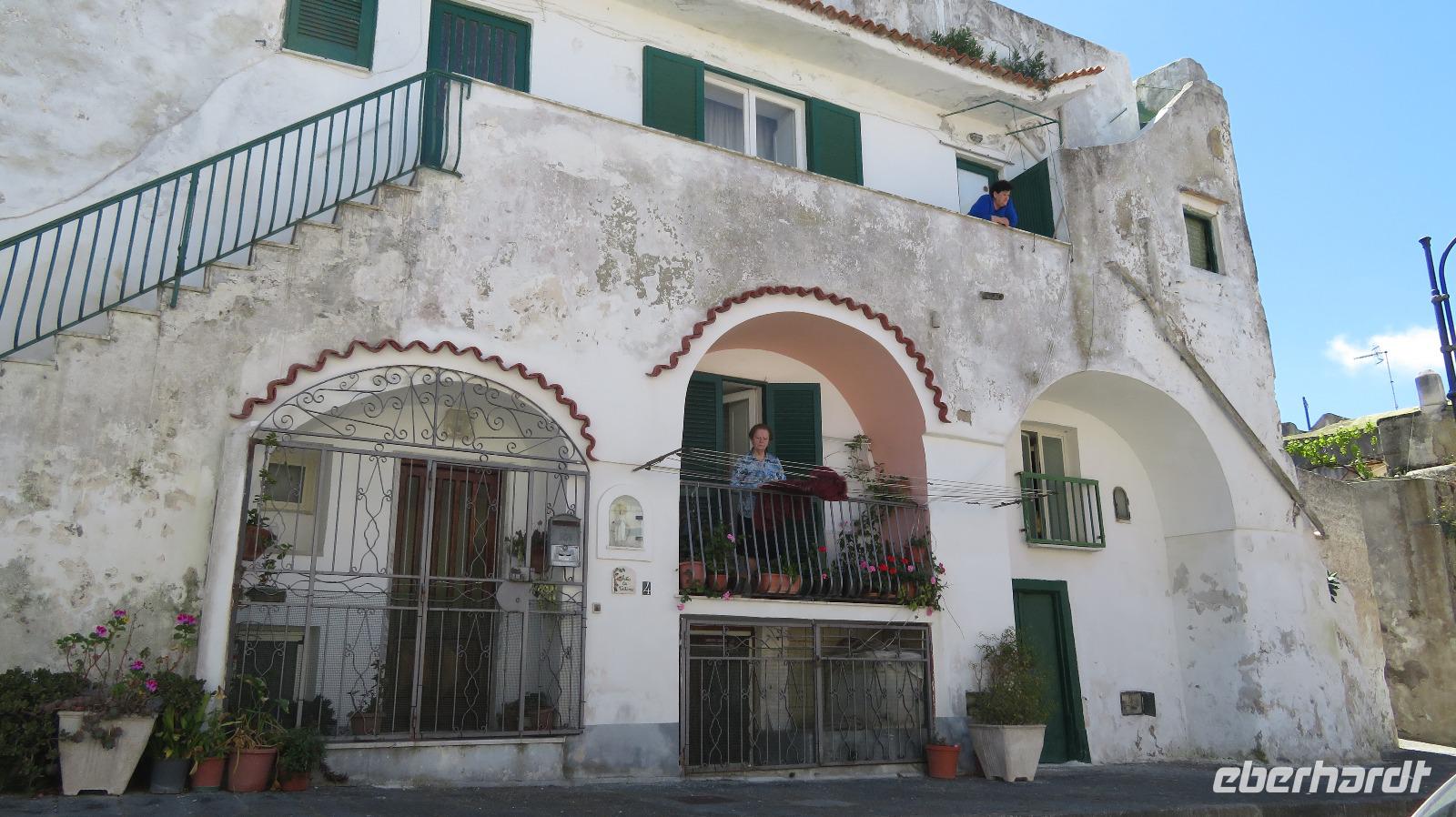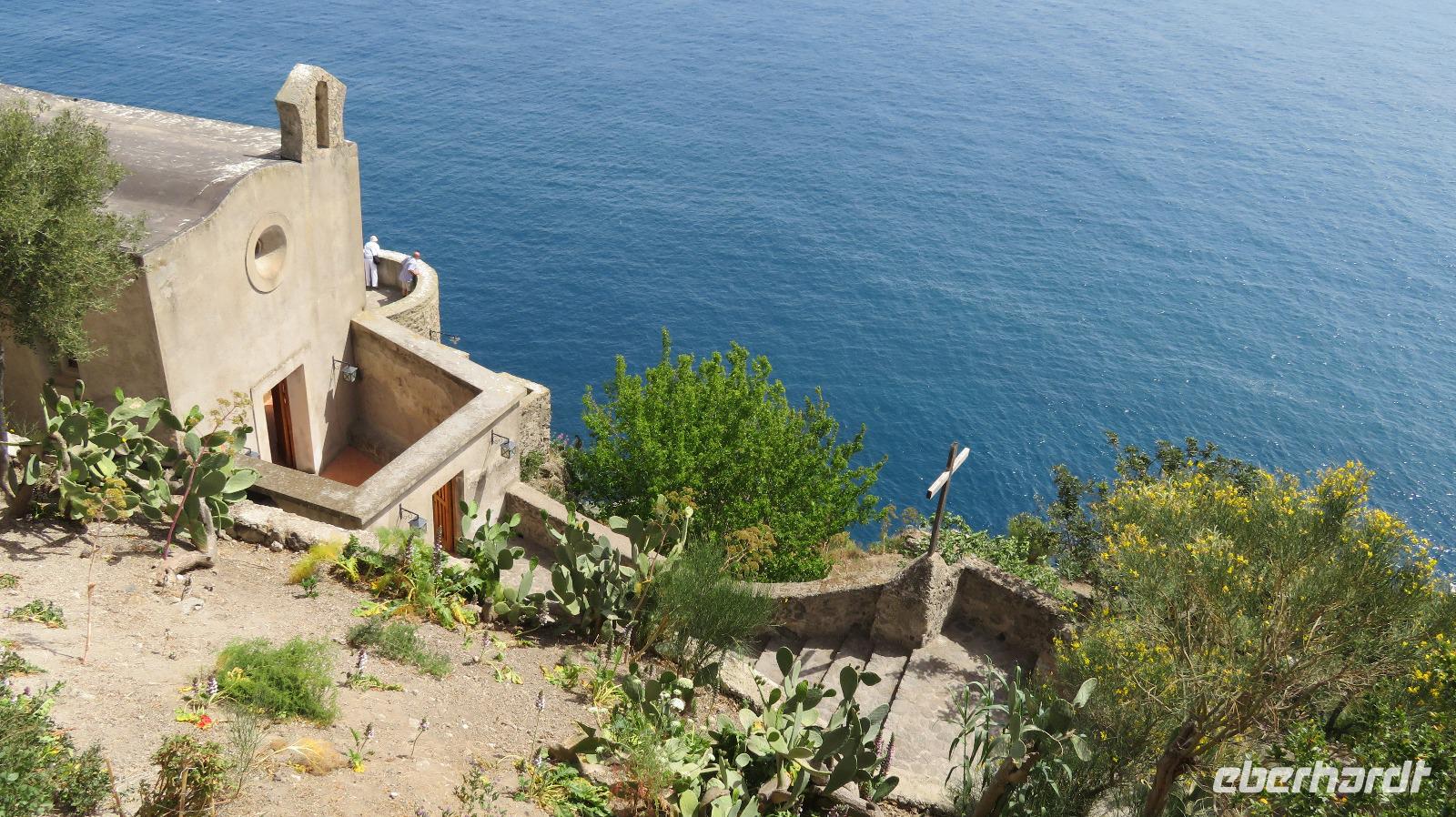 In Lacco Ameno legen wir einen kurzen Fotostopp ein, um den "Pilz" zu fotografieren und spazieren dann durch Ischia Ponte, wo wir einen Blick auf das Castello Aragonese werfen können. Da ein Betonfahrzeug unser Weiterkommen auf der einzigen Inselstraße behindert, hat Brigitte die gute Idee, noch einen Abstecher zu einem Aussichtspunkt über den Marontibeach zu machen. Ein toller Blick auf den herrlichen Strand mit San Angelo im Hintergrund. Wir können sogar das Hotel erkennen, wo unsere Kanzlerin öfters Urlaub gemacht hat. Im Bergort Serrara Fontana nehmen wir ein Mittagessen ein und probieren den berühmten Zitronenlikör der neapolitanischen Küste, den Limoncello. Ein herrlicher Tag mit fabelhafter Sicht läßt uns über das Tyrrhenische Meer bis zur Halbinsel von Sorrent und zur Insel Capri blicken. Unter uns der Felsen von San Angelo. Der Bus bringt uns noch dorthin, so dass wir auch dieses idyllische Dörfchen kennenlernen können. Und für Orqangensaft, Eis oder Cappuccino reicht die Zeit auch noch. Vorher hatten wir auch noch eine kleine Felsenkirche besucht.