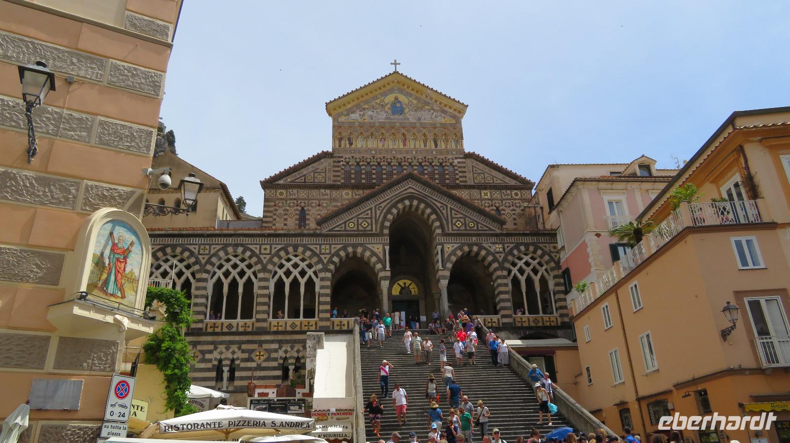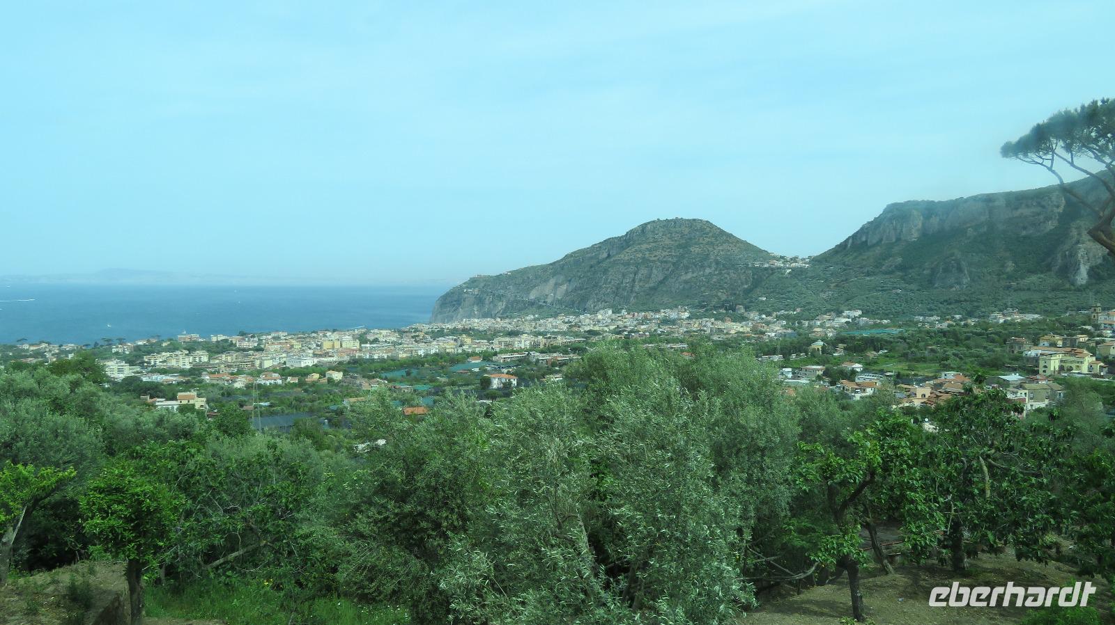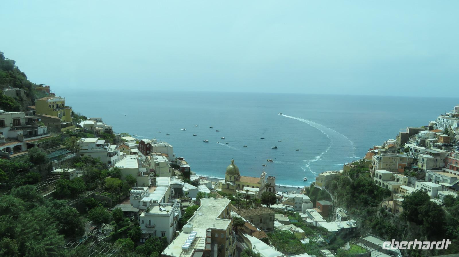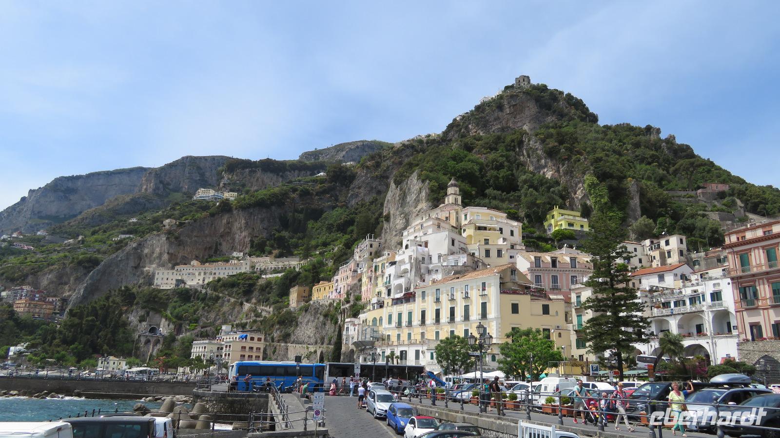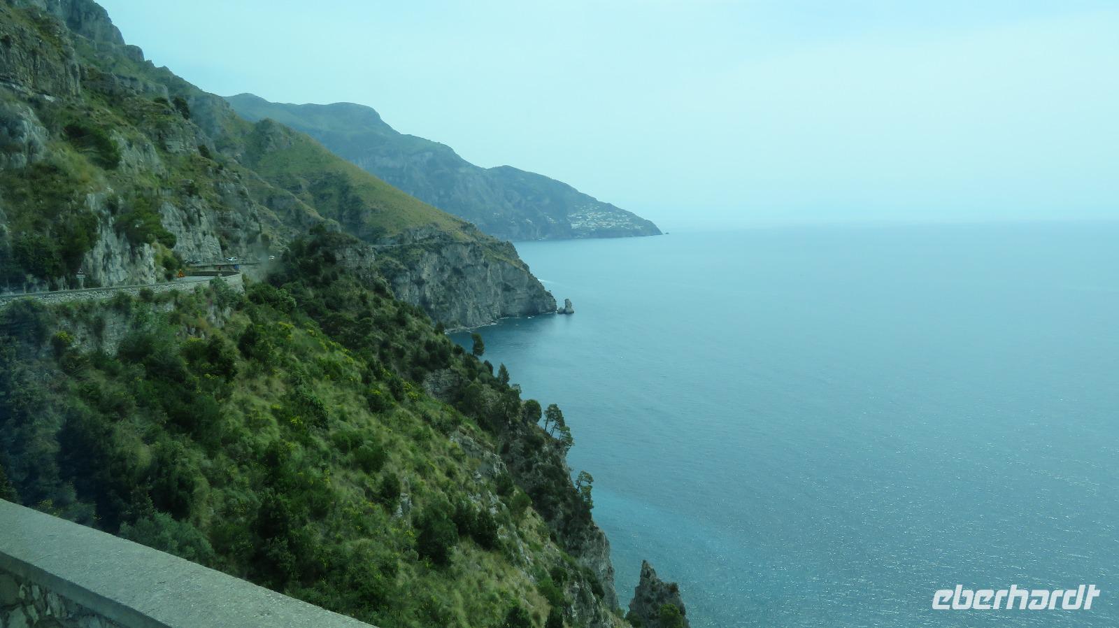 Heute werden wir schon 5.40 Uhr zum Hafen gebracht. Nach der Fährüberfahrt erwartet uns im Hafen von Pozzuoli Natalia. Auch heute ist eine andere deutsche Gruppe mit uns und Natalia unterwegs. Aber dadurch haben wir einen größeren Bus und die Aussicht ist besser. Erst einmal geht es langsam auf der Autobahn voran durch Neapel. Vorbei am Vesuv fahren wir zuerst nach Sorrent. Aber auf der Küstenstraße stehen wir ewig im Stau, so daß nur kurze Zeit für Sorrent bleibt. Auf einer engen Straße fahren wir dann an der Costa Divina, der Göttlichen Küste, zwischen Meer und Berg auf einer der bekanntesten Traumstraßen der Welt. Wir schauen auf die Galli-Inseln und auf das berühmte idyllische Örtchen Positano. Leider gibt es keine Parkmöglichkeiten an der Straße, so dass wir die Aussicht nur aus dem Bus genießen können. Aber in Amalfi unternehmen wir einen Spaziergang zum Dom. Wer möchte kann den Dom Sant Andrea mit seinem schönen Kreuzgang und den Gebeinen des Heiligen besichtigen. Wir essen eine Kleinigkeit und bummeln durch die Gassen. Leider ist das Meer etwas zu bewegt für eine Bootstour entlang der Küste. Denn erst vom Meer aus kann man die Steilküste so richtig bewundern.