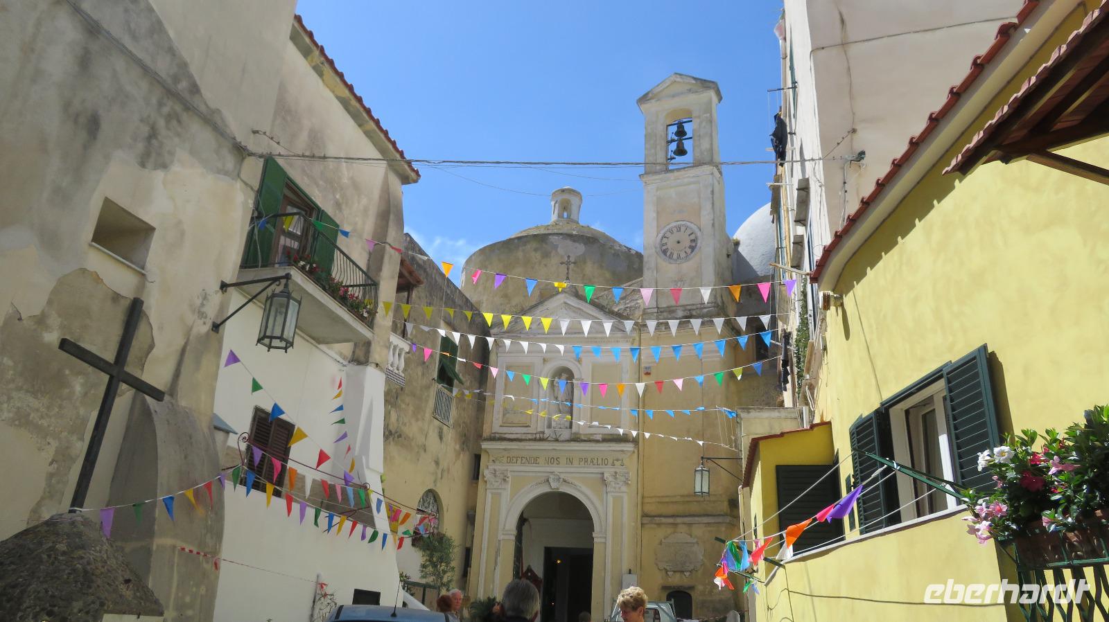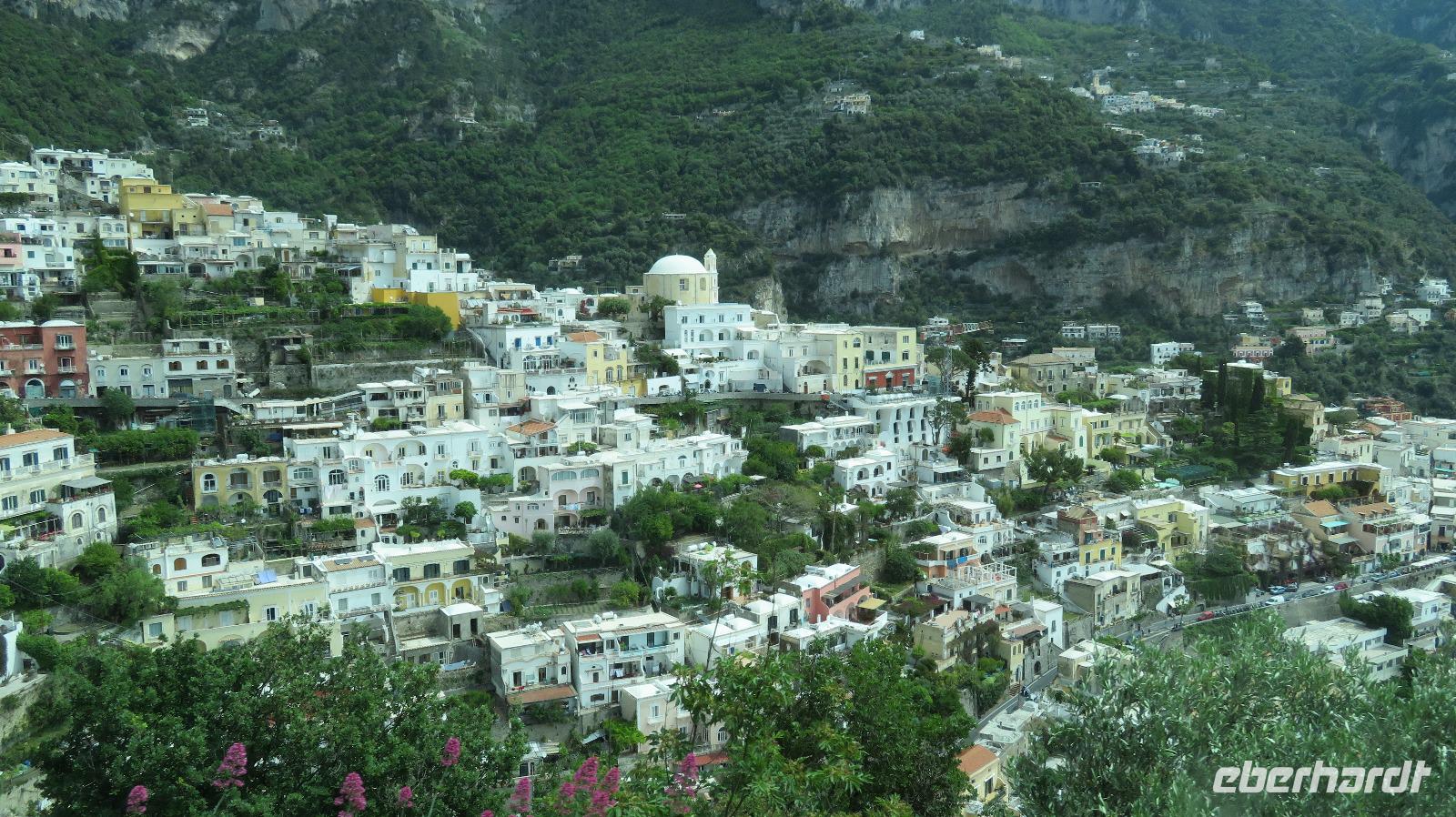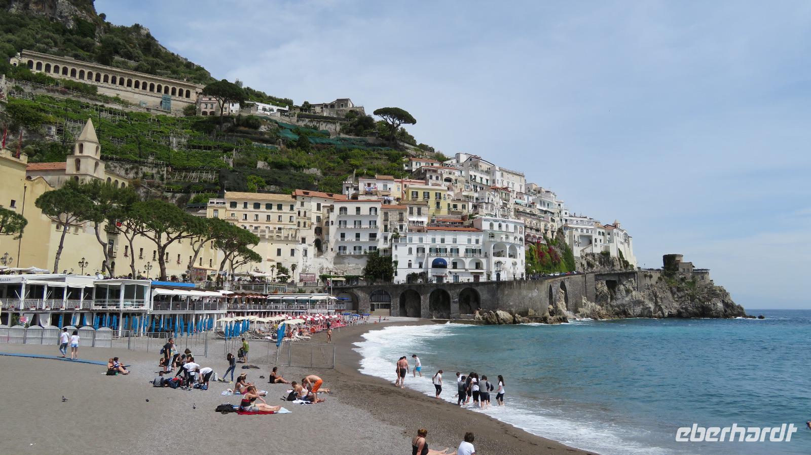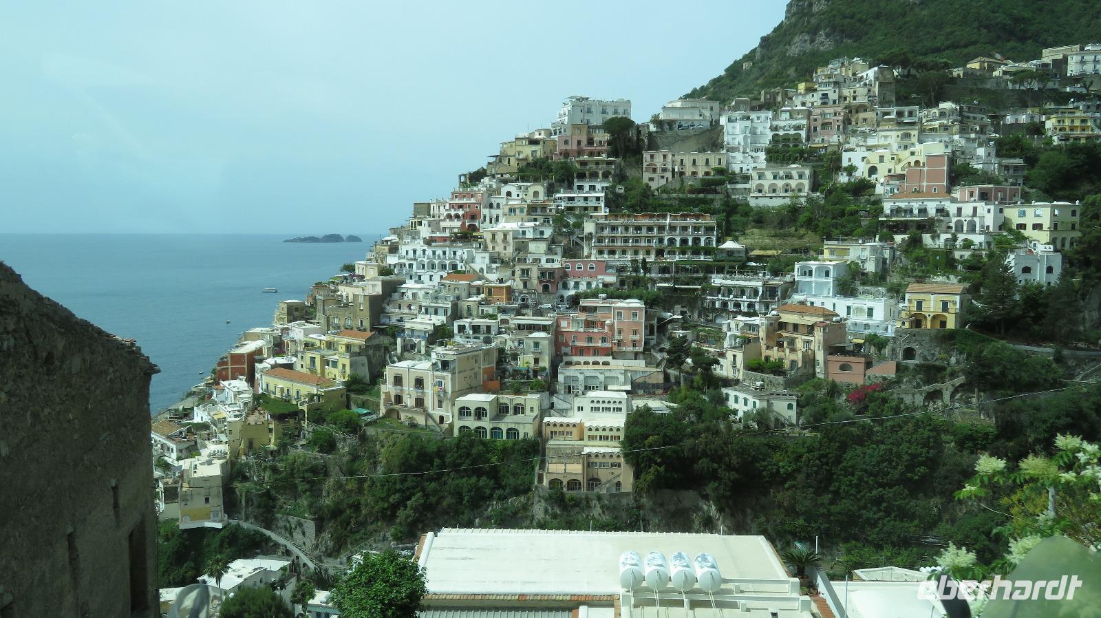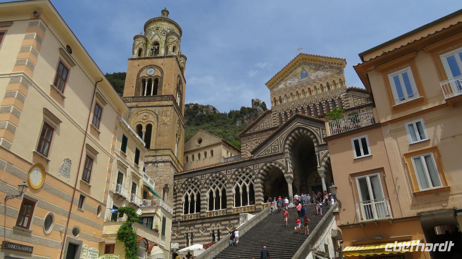Heute werden wir schon 5.40 Uhr zum Hafen gebracht. Nach der Fährüberfahrt erwartet uns im Hafen von Pozzuoli Natalia. Auch heute ist eine andere deutsche Gruppe mit uns und Natalia unterwegs. Aber dadurch haben wir einen größeren Bus und die Aussicht ist besser. Erst einmal geht es langsam auf der Autobahn voran durch Neapel. Vorbei am Vesuv fahren wir zuerst nach Sorrent. Aber auf der Küstenstraße stehen wir ewig im Stau, so daß nur kurze Zeit für Sorrent bleibt. Auf einer engen Straße fahren wir dann an der Costa Divina, der Göttlichen Küste, zwischen Meer und Berg auf einer der bekanntesten Traumstraßen der Welt. Wir schauen auf die Galli-Inseln und auf das berühmte idyllische Örtchen Positano. Leider gibt es keine Parkmöglichkeiten an der Straße, so dass wir die Aussicht nur aus dem Bus genießen können. Aber in Amalfi unternehmen wir einen Spaziergang zum Dom. Wer möchte kann den Dom Sant Andrea mit seinem schönen Kreuzgang und den Gebeinen des Heiligen besichtigen. Wir essen eine Kleinigkeit und bummeln durch die Gassen. Leider ist das Meer etwas zu bewegt für eine Bootstour entlang der Küste. Denn erst vom Meer aus kann man die Steilküste so richtig bewundern.