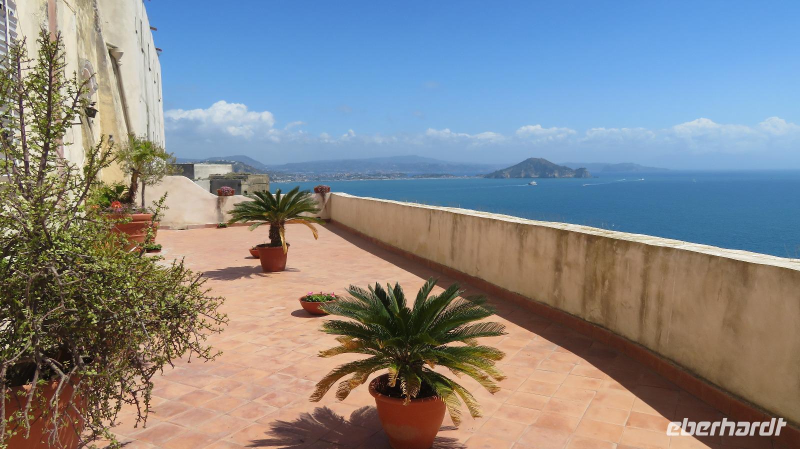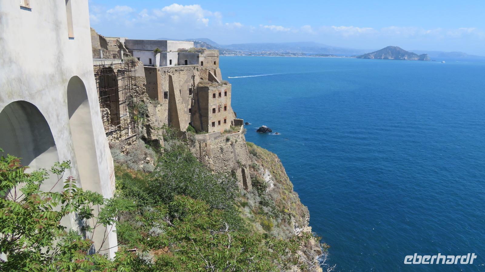 Da heute der Tag des Inselheiligen San Michele ist, findet in der Kirche eine Messe statt. Wir starten deshalb mit der Inselrundfahrt. Das macht natürlich Spaß und lässt uns Staunen, wie die Fahrer zügig durch die engen Gassen fahren. Um die Insel herum fahren wir dann oberhalb der Felsküste zu einem Aussichtspunkt am einstigen Vulkankrater Corricella, wo man einen Traumblick über Insel, Meer und zum bunten Fischerdörfchen Corricella hat, das wir später besuchen werden. Aber erst bringen uns die Taxis zum Burgberg Terra Murata, dass älteste bewohnte Viertel der Insel mit einem berüchtigten Gefängnis. Der Palazzo d'Avalos, wurde im 16. Jahrhundert von der regierenden Familie d'Avalos als Residenz errichtet.