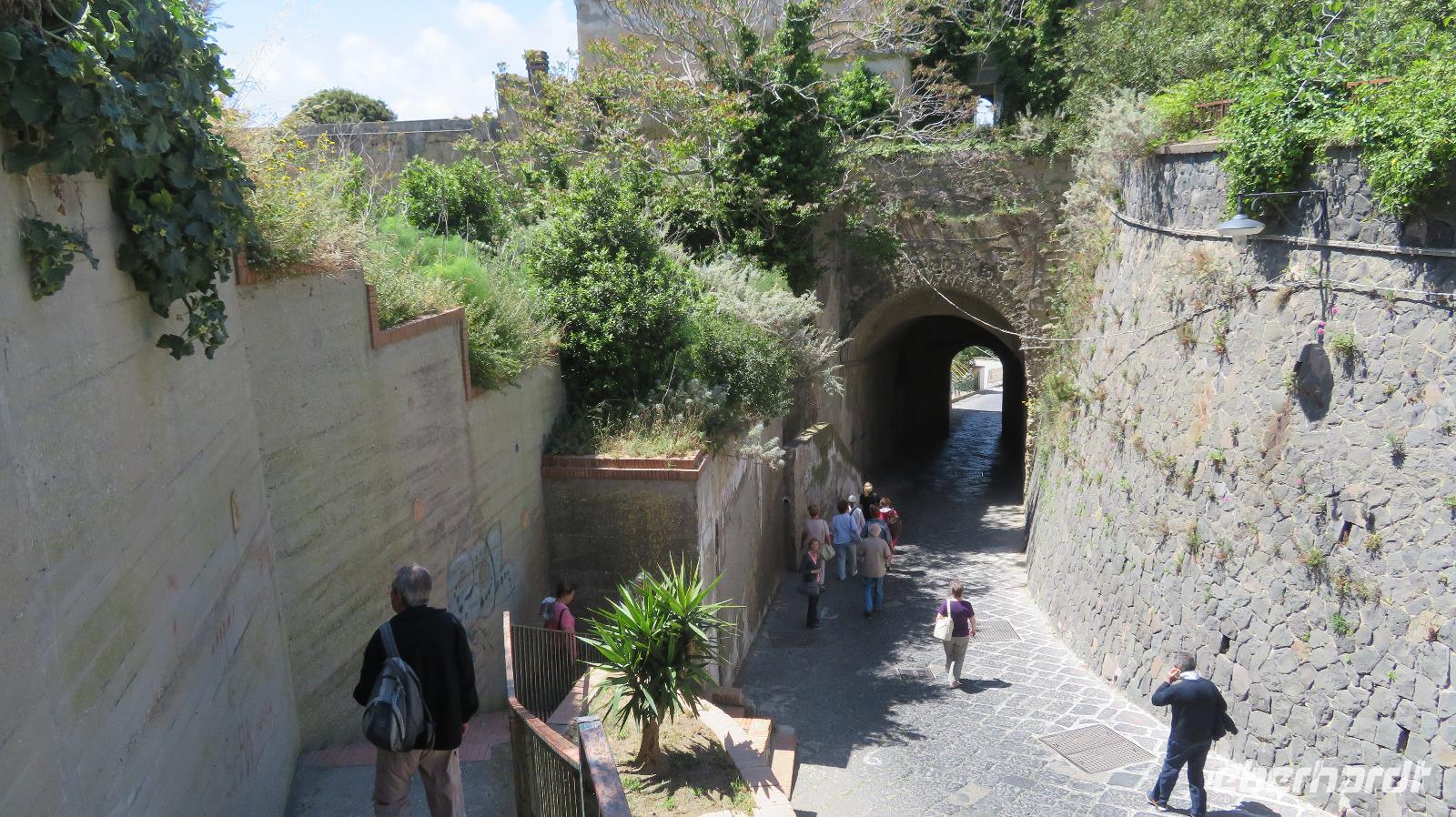 Reisebegleitung Petra hat den Gästen einen Ausflug zum Castello Aragonese in Ischia Ponte angeboten und sechs Gäste kommen mit. Mit öffentlichen Bussen fahren wir bis zur Brücke, die uns über 220 m zum Felsen mit der beeindruckenden Burg bringt. Glücklicherweise gibt es den Lift, doch den Abgang durch den imposanten Tunnel sollte man besser zu Fuß gehen, und man kann noch einen Blick in das Folterkabinett werfen.