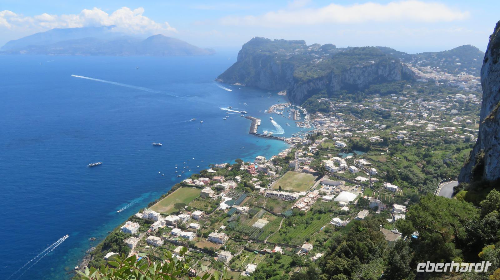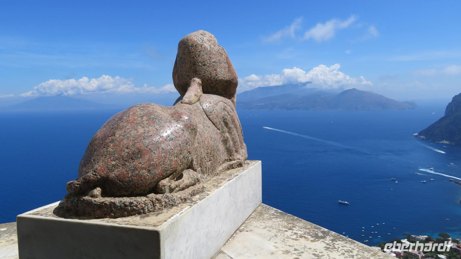 Einige Gäste fahren mit dem Sessellift auf den Monte Solaro, wo die Aussicht noch spektakulärer ist. Sie haben mit dem Wetter Glück und Capri liegt ihnen zu Füßen!