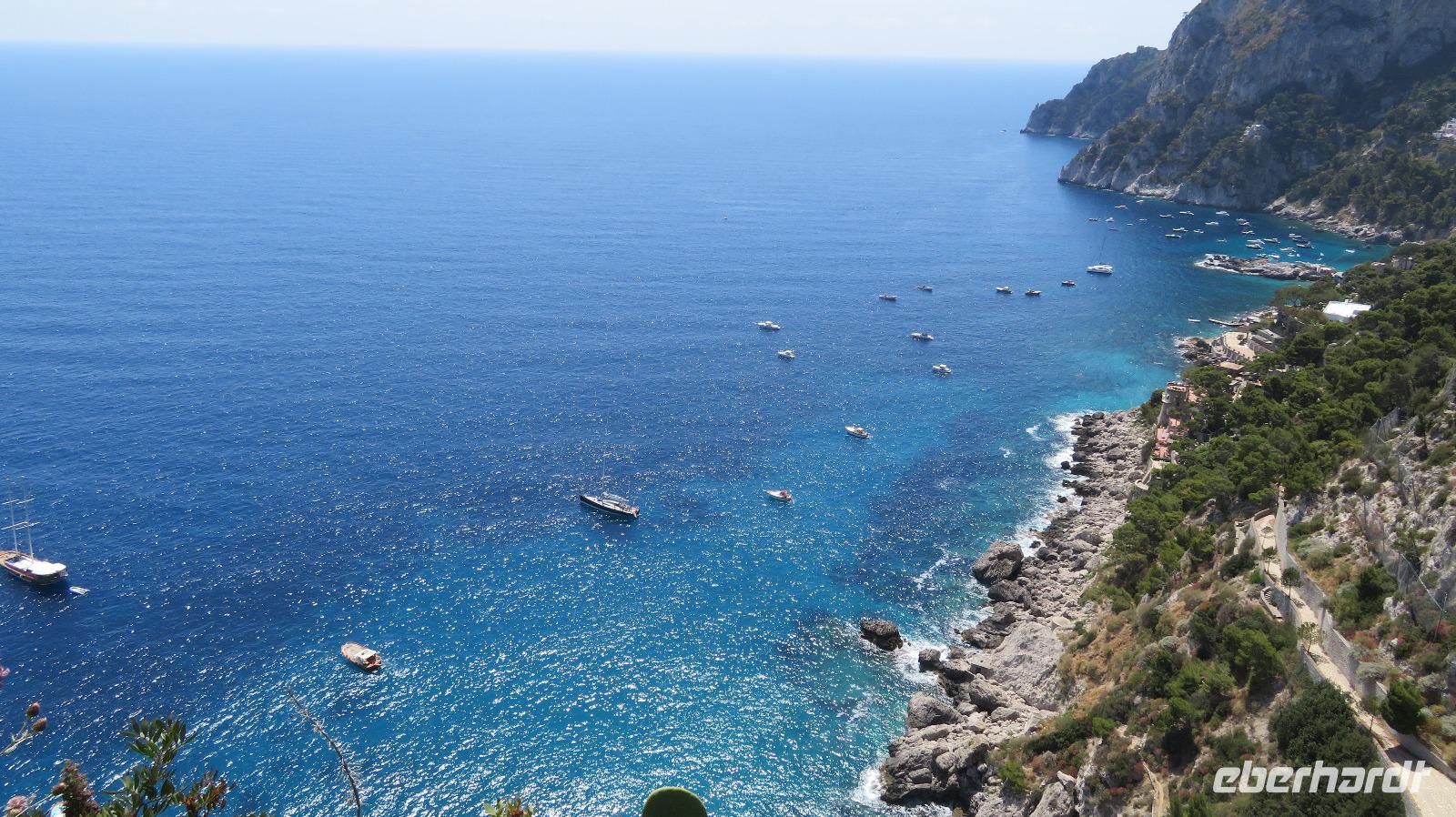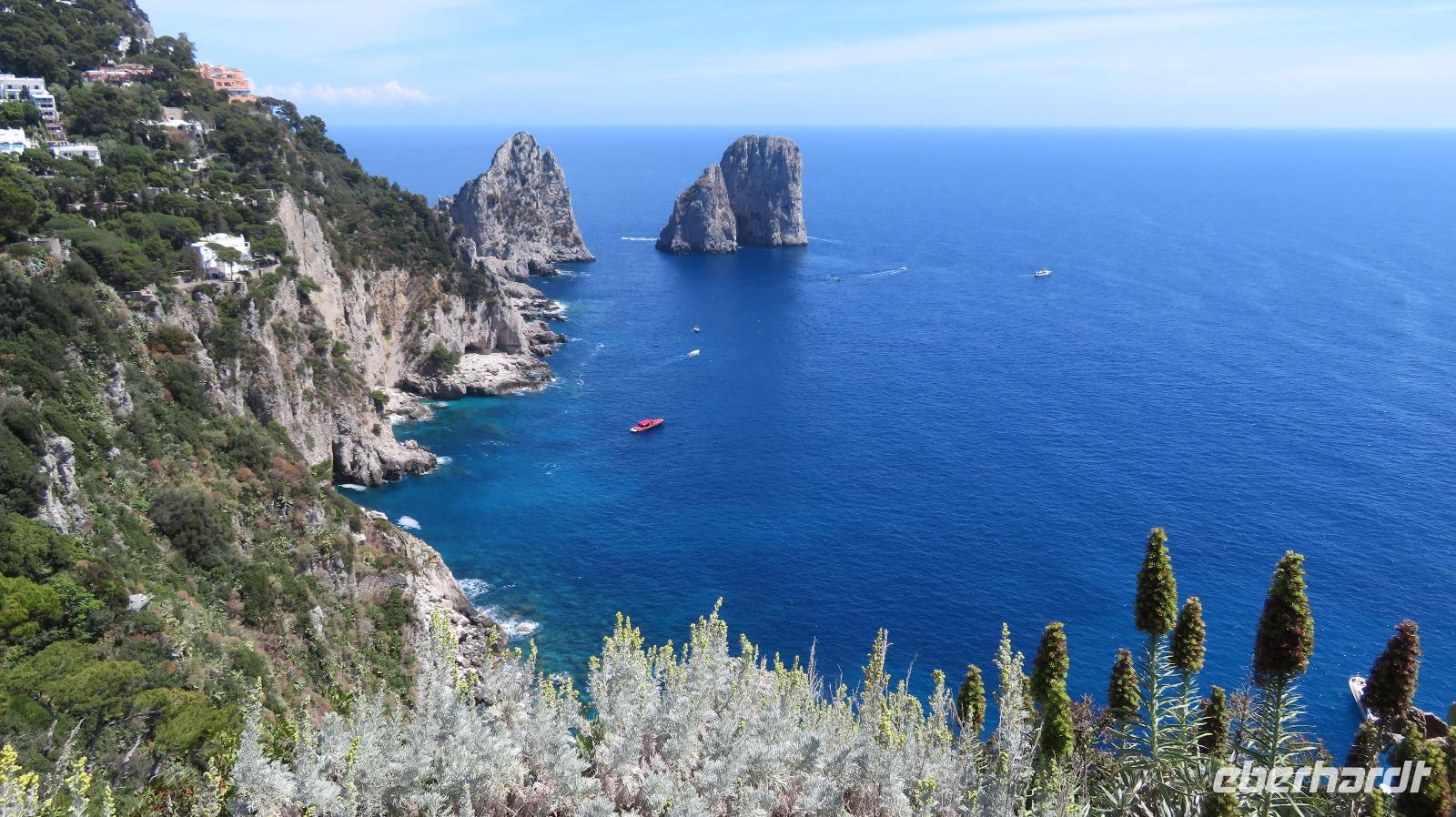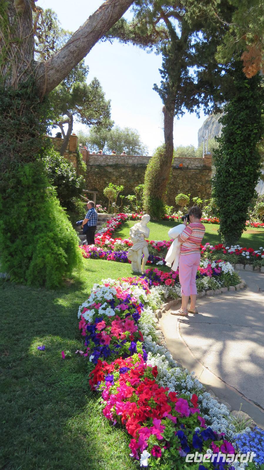 Mit dem Bus geht es hinab zum berühmten Hauptort Capri, heute fast hoffnungslos mit Touristen überfüllt! Floriana bringt uns zu den Augustusgärten, die wir mit Petra besuchen. Wir haben hier einen herrlichen Blick zu den Faraglioni-Inseln und übers Meer.