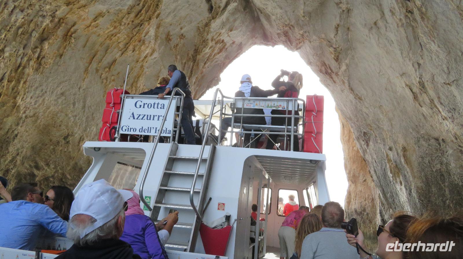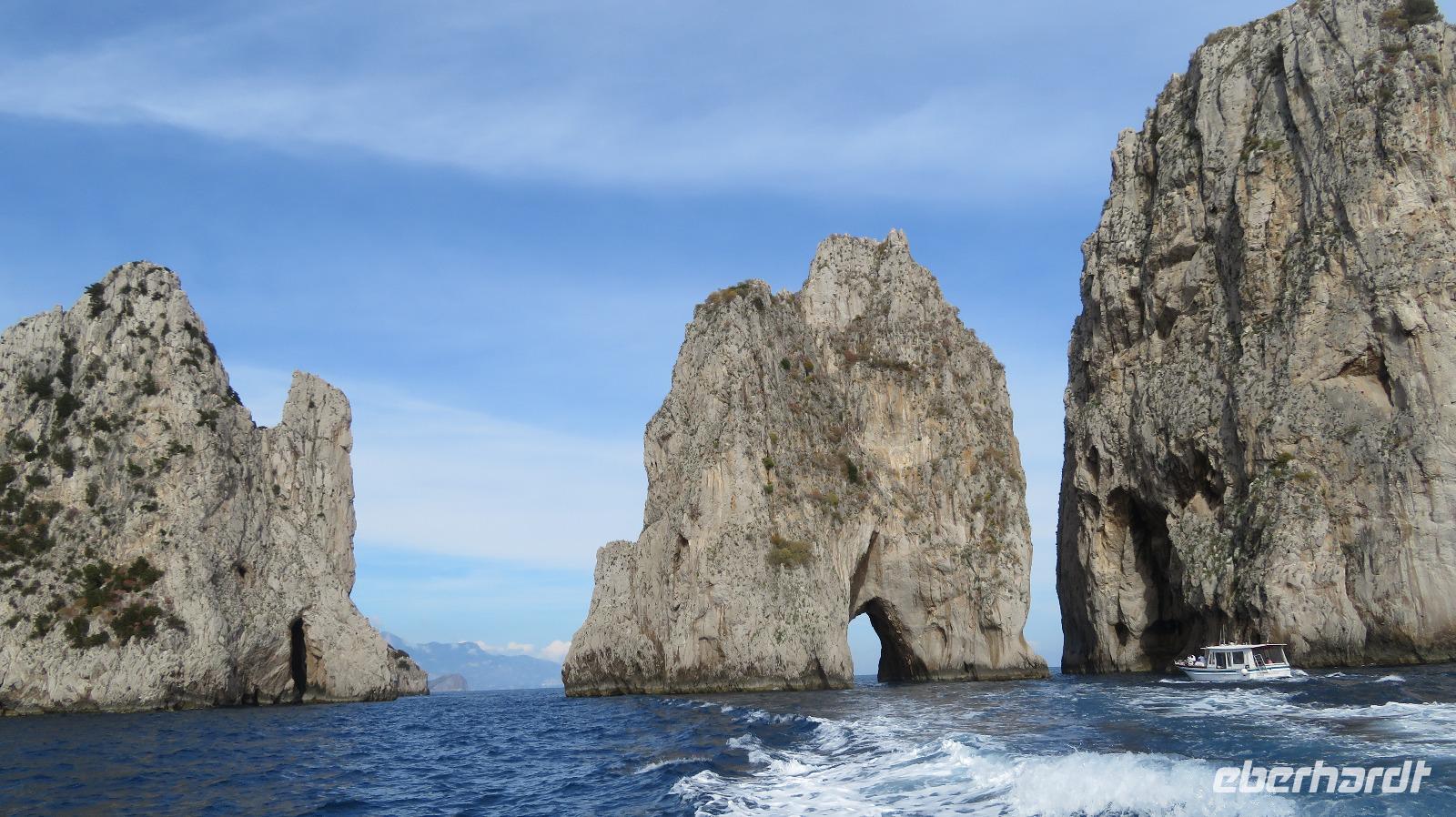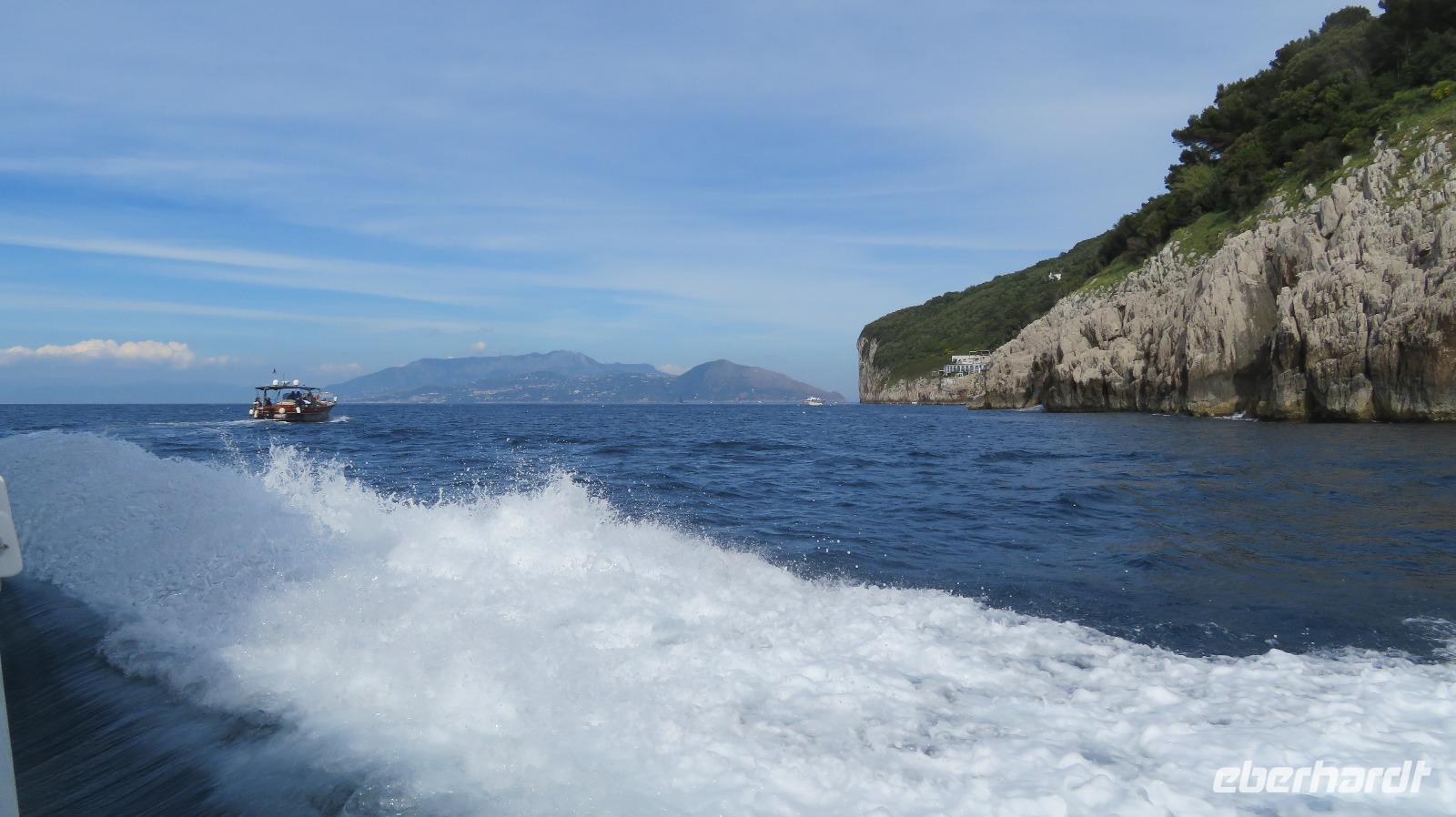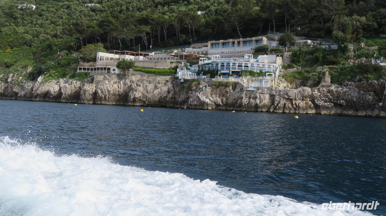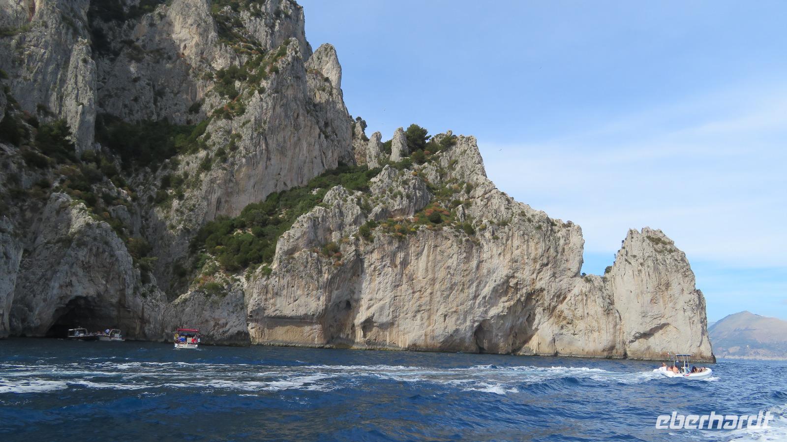 Uns erwartet aber noch ein besonderes Erlebnis, eine Bootstour um die Insel. Vom Meer aus kann man erst so richtig die Schönheit von Capri entdecken, die Kalksteinfelsen, die Grotten mit ihren orangefarbenen „Korallen". Wir bewundern die verschiedenfarbigen Blautöne des Meeres. Nur die Blaue Grotte ist geschlossen. Aber die Zeit hätte sowieso nicht gereicht, um uns dort hinein schiffen zu lassen!