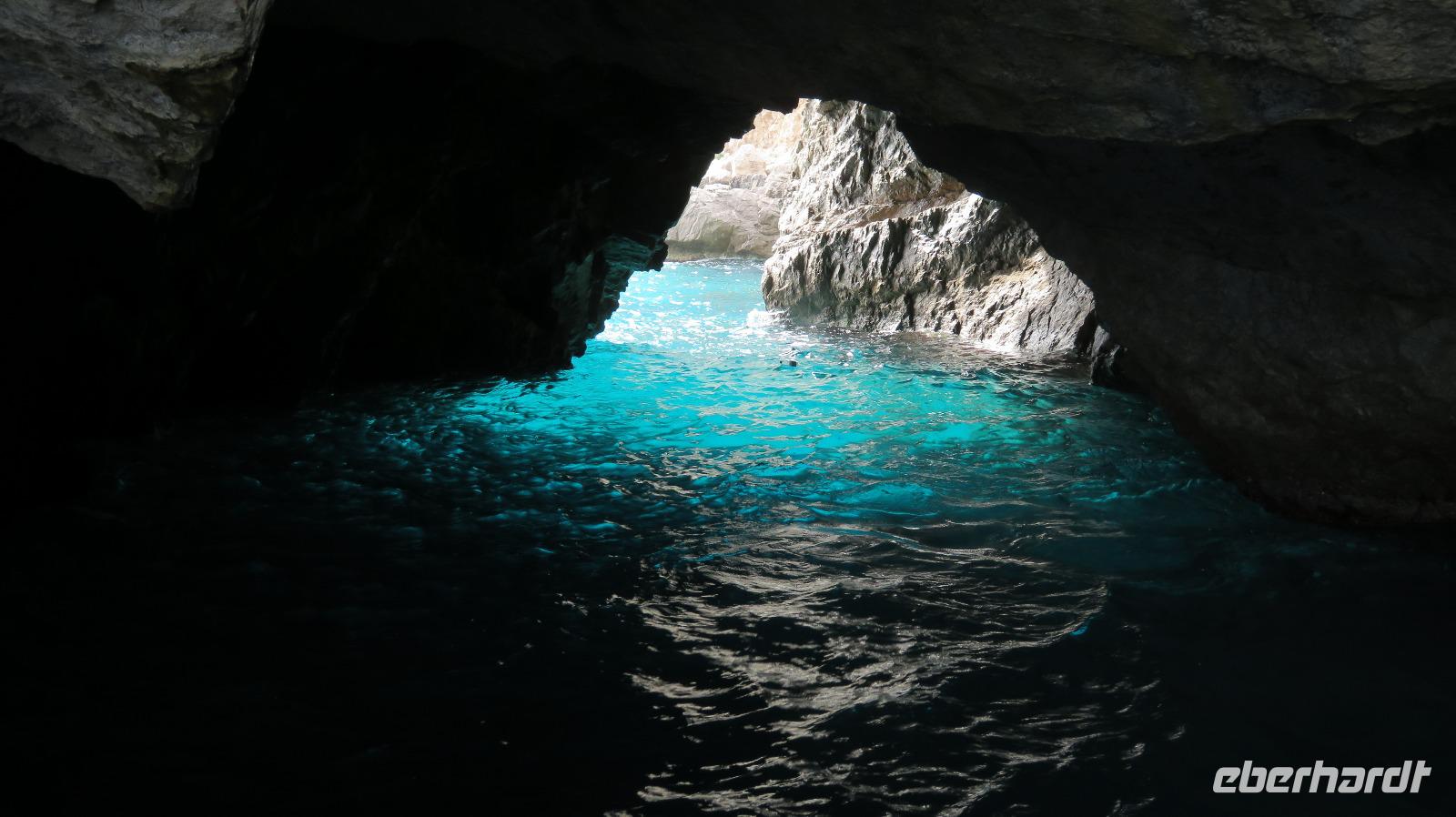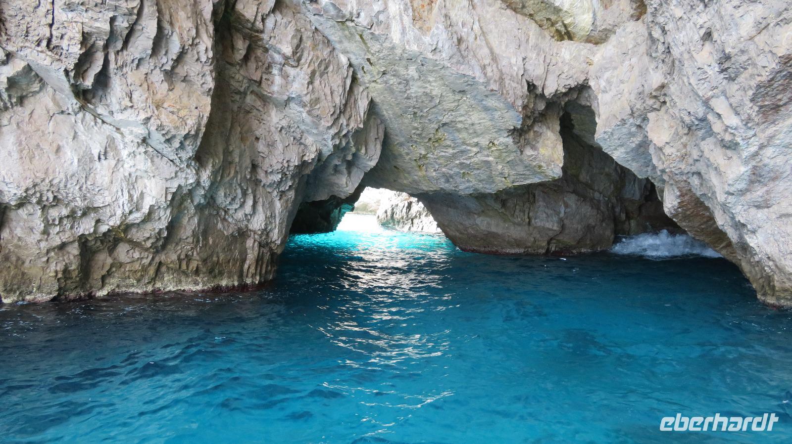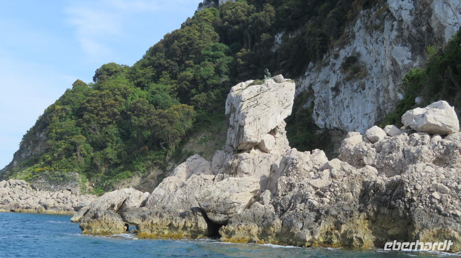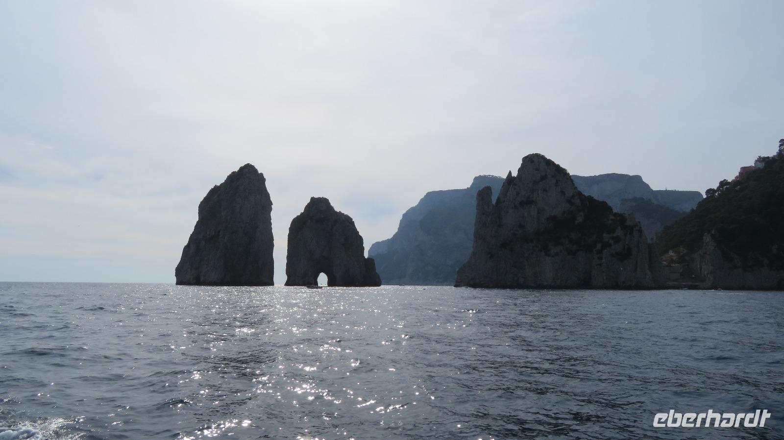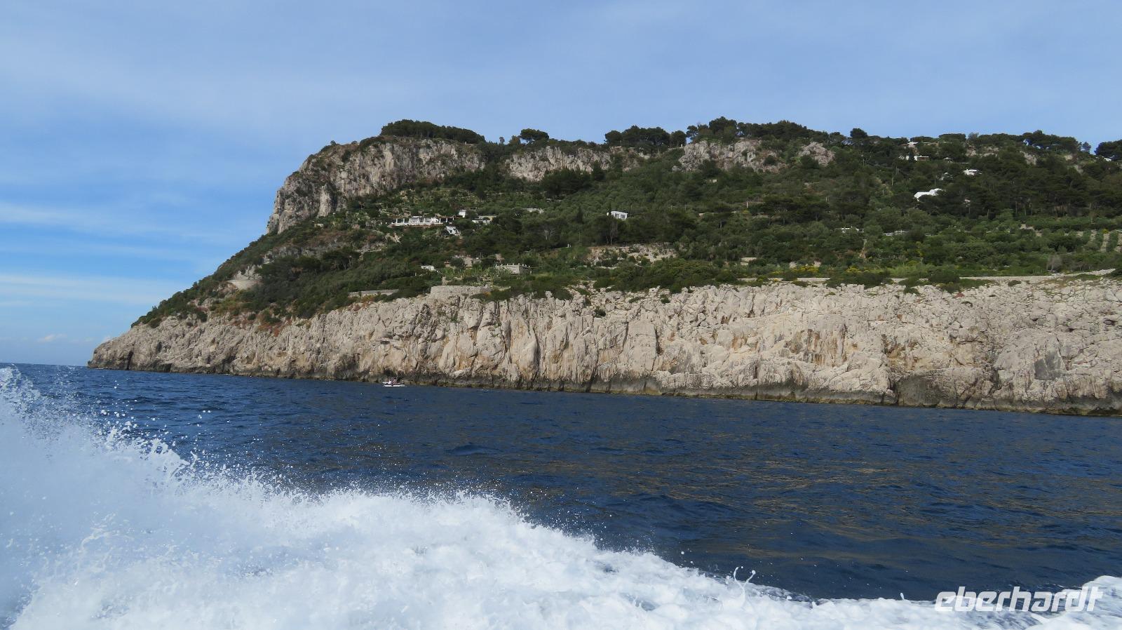 Uns erwartet aber noch ein besonderes Erlebnis, eine Bootstour um die Insel. Vom Meer aus kann man erst so richtig die Schönheit von Capri entdecken, die Kalksteinfelsen, die Grotten mit ihren orangefarbenen „Korallen". Wir bewundern die verschiedenfarbigen Blautöne des Meeres. Nur die Blaue Grotte ist geschlossen. Aber die Zeit hätte sowieso nicht gereicht, um uns dort hinein schiffen zu lassen!