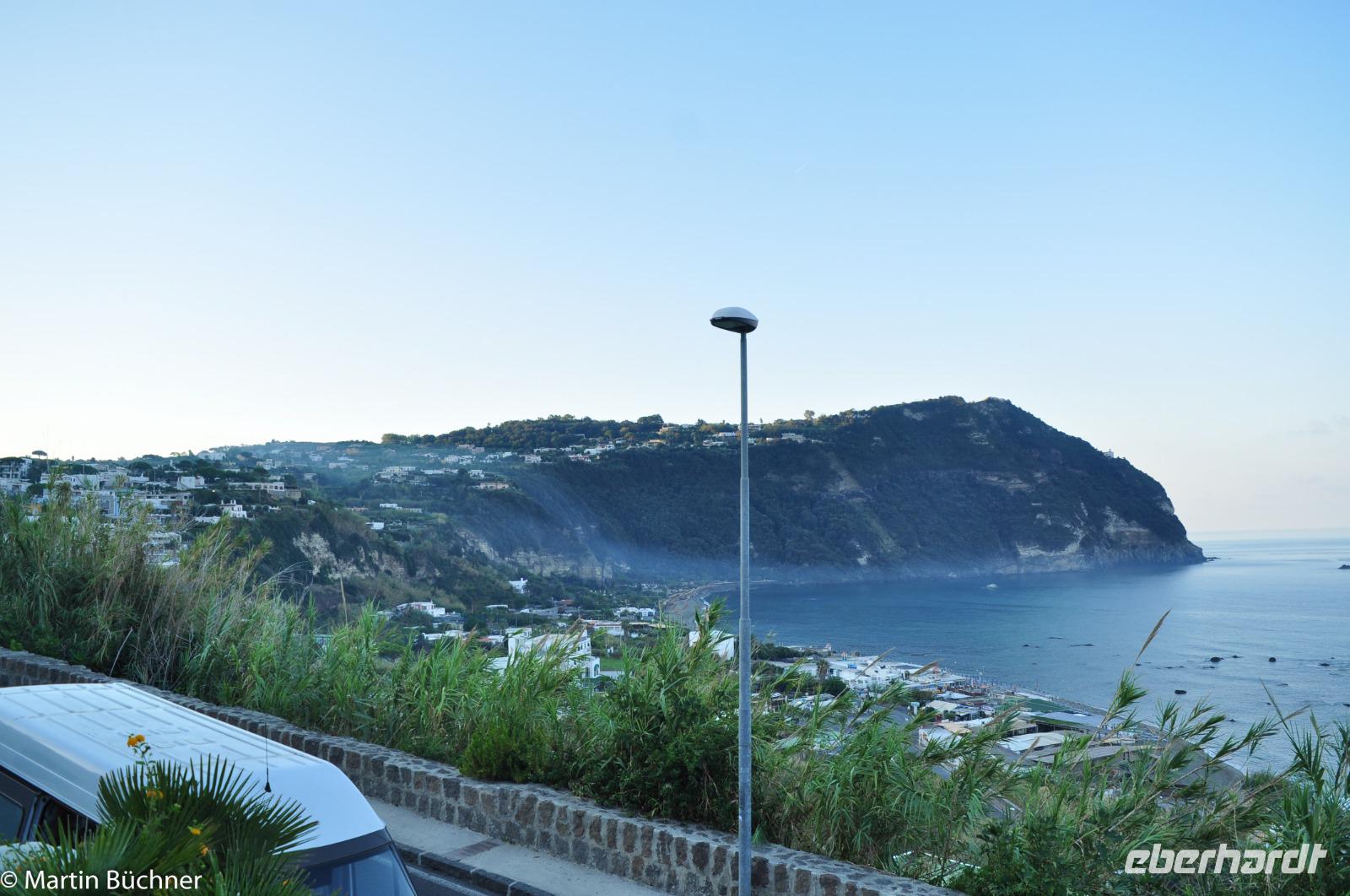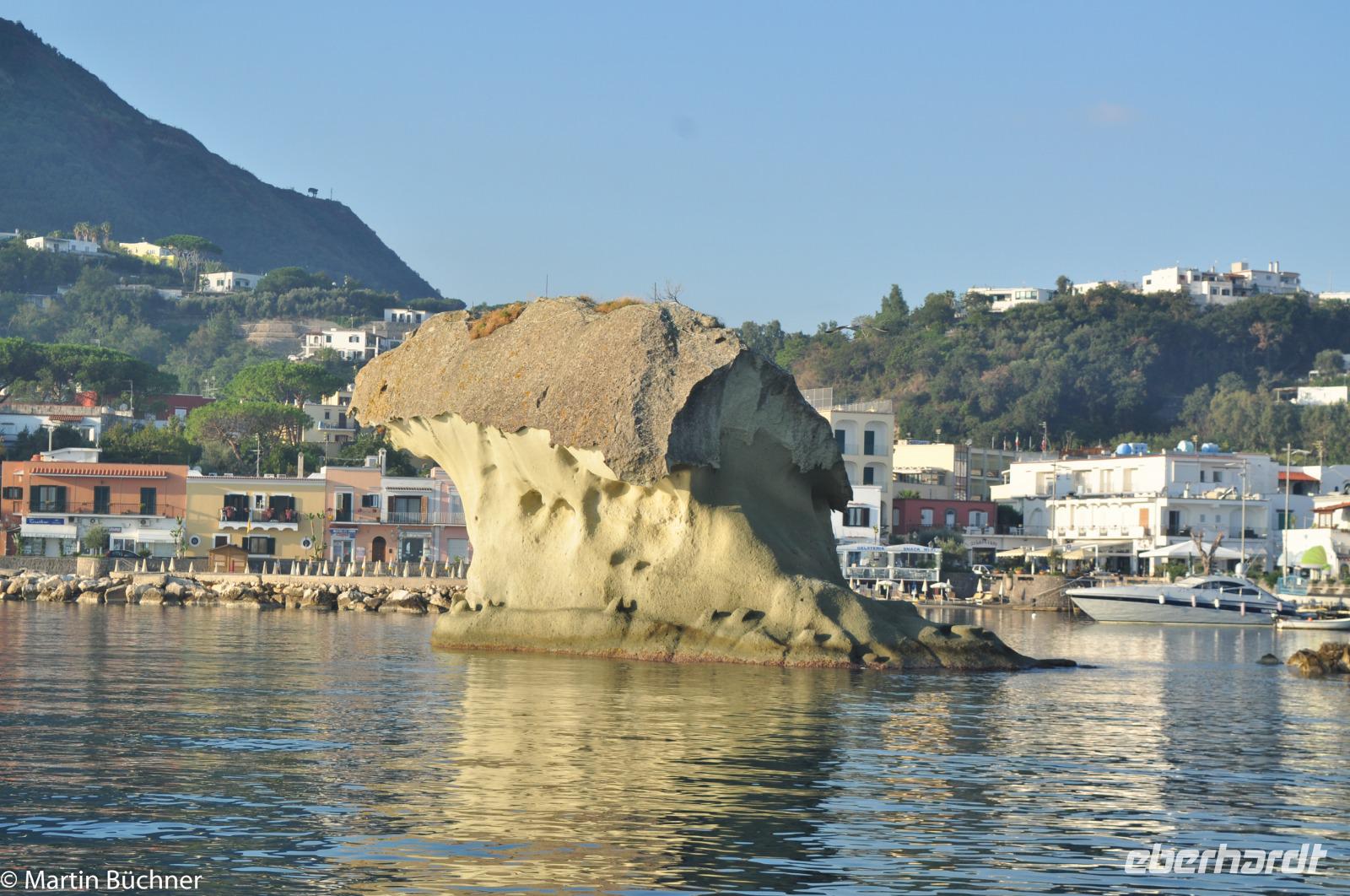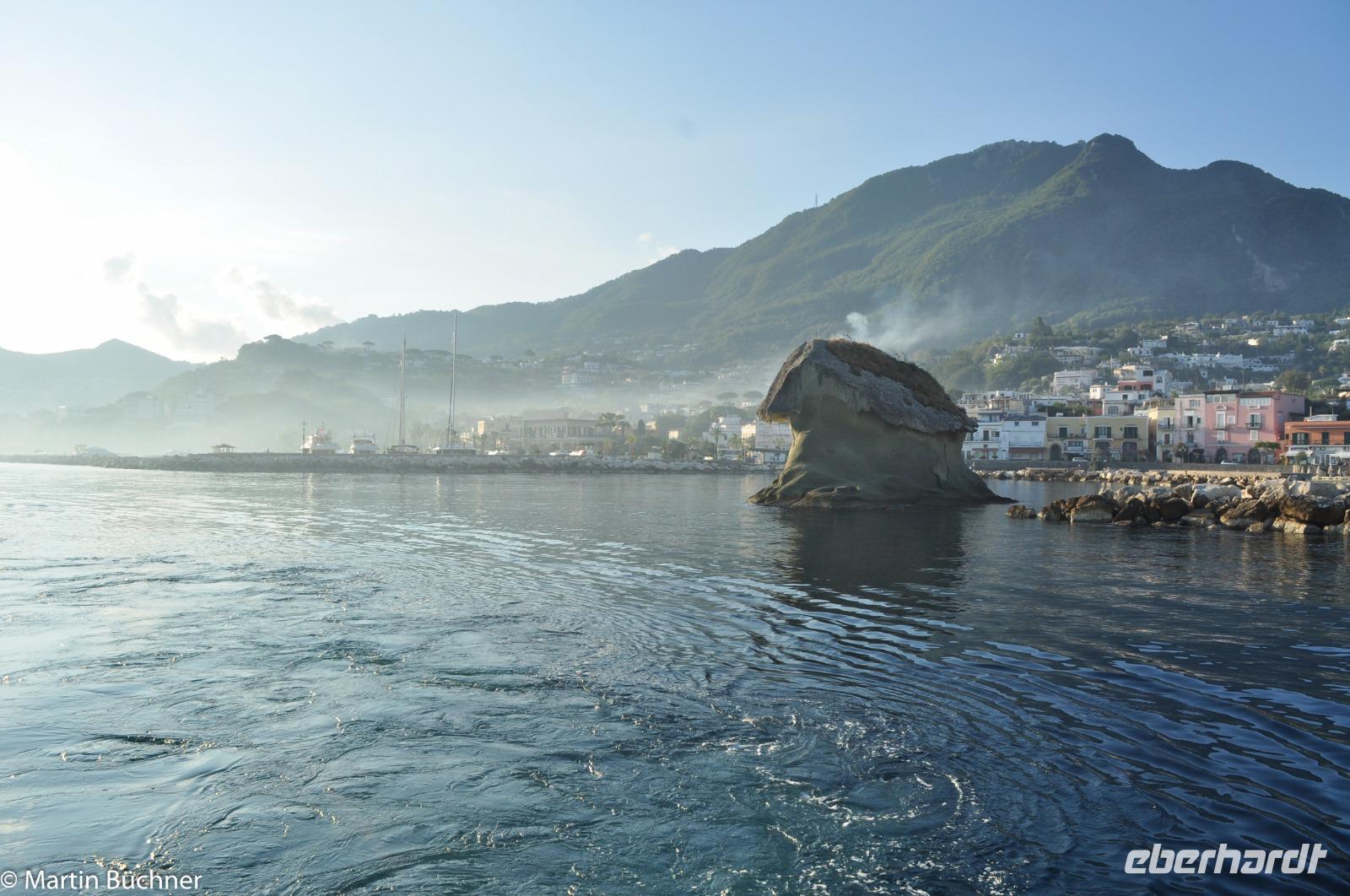 Der Tag beginnt mit flüssigem Sonnenschein. Sogar ein Nebelfluss wabert über die Felsklippen. Später setzt heftiger Regen ein, an schöne Fotostopps ist kaum zu denken. Immerhin reicht es für einen Fotostopp am Il Fungo, dem markanten Tuffstein-Pilz in Lacco Ameno, einem Wahrzeichen der Insel. Glücklicherweise ist das Gewitter mit Ankunft im wunderschönen Sant Angelo beendet.