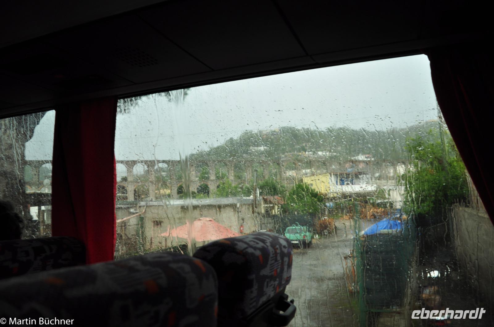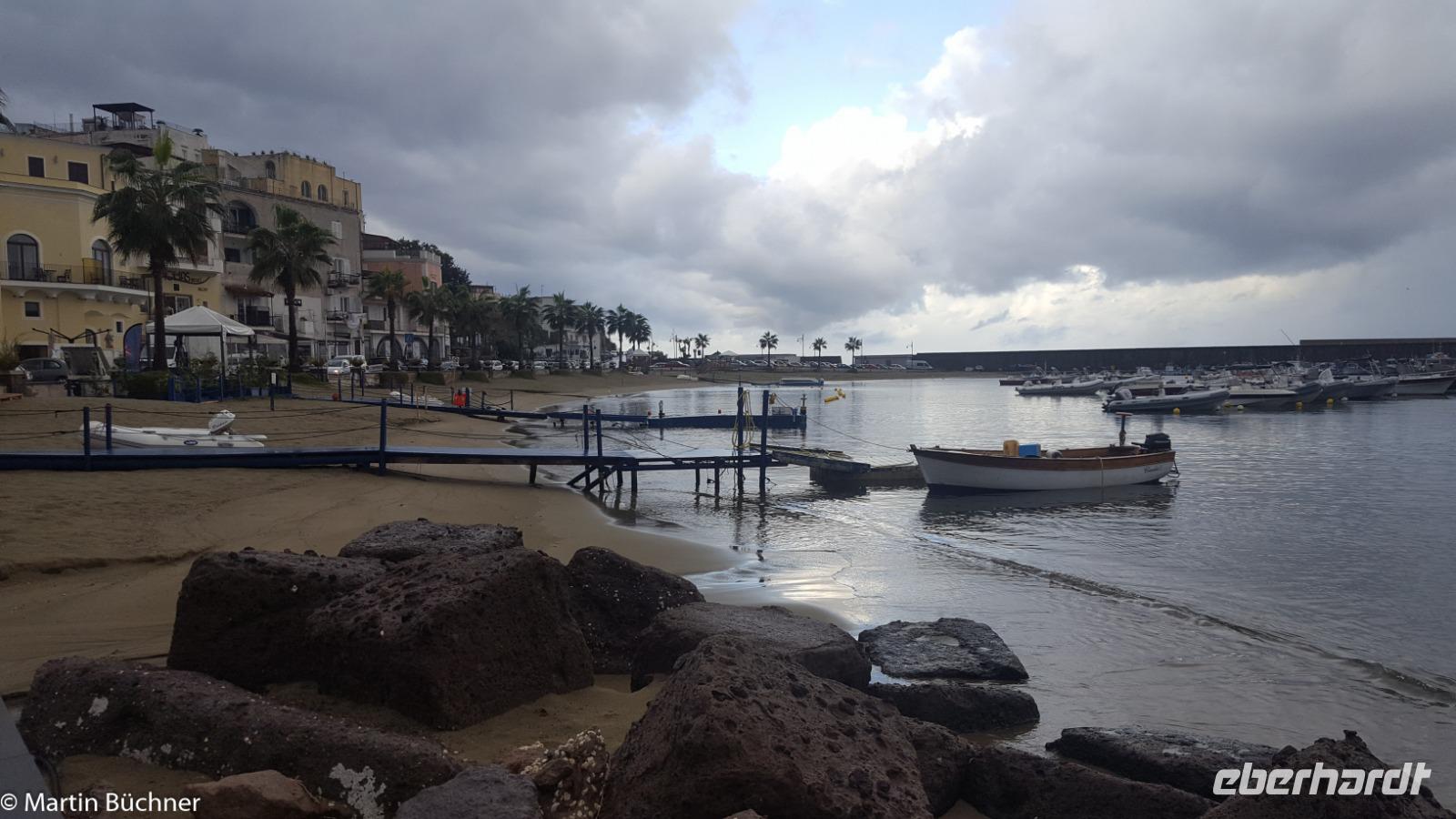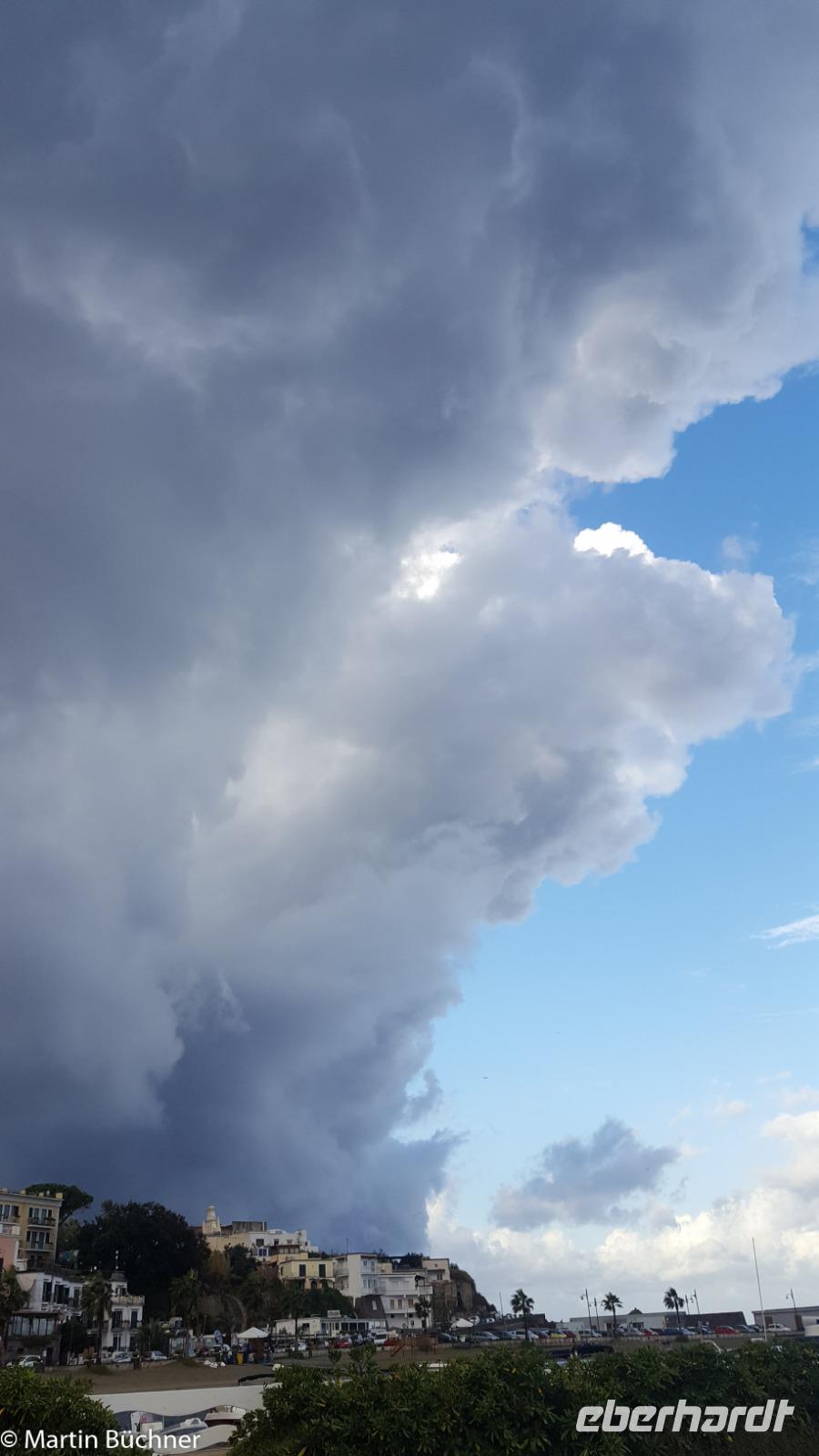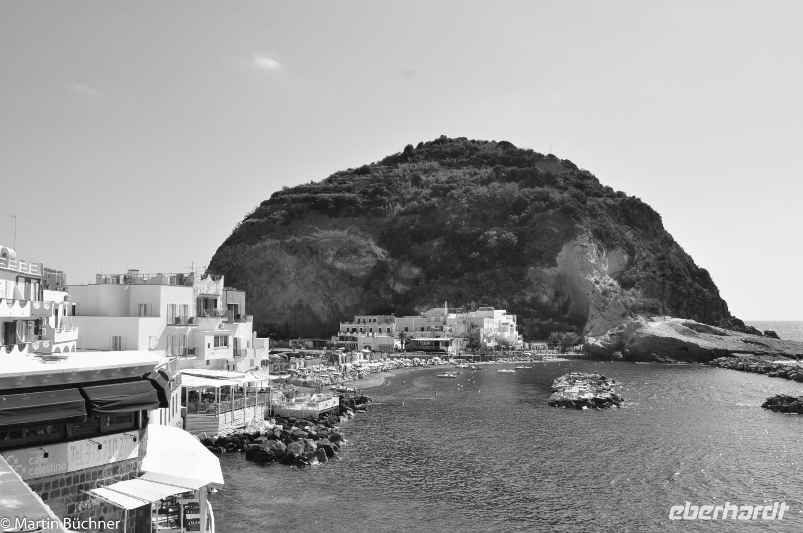 Der Tag beginnt mit flüssigem Sonnenschein. Sogar ein Nebelfluss wabert über die Felsklippen. Später setzt heftiger Regen ein, an schöne Fotostopps ist kaum zu denken. Immerhin reicht es für einen Fotostopp am Il Fungo, dem markanten Tuffstein-Pilz in Lacco Ameno, einem Wahrzeichen der Insel. Glücklicherweise ist das Gewitter mit Ankunft im wunderschönen Sant Angelo beendet.