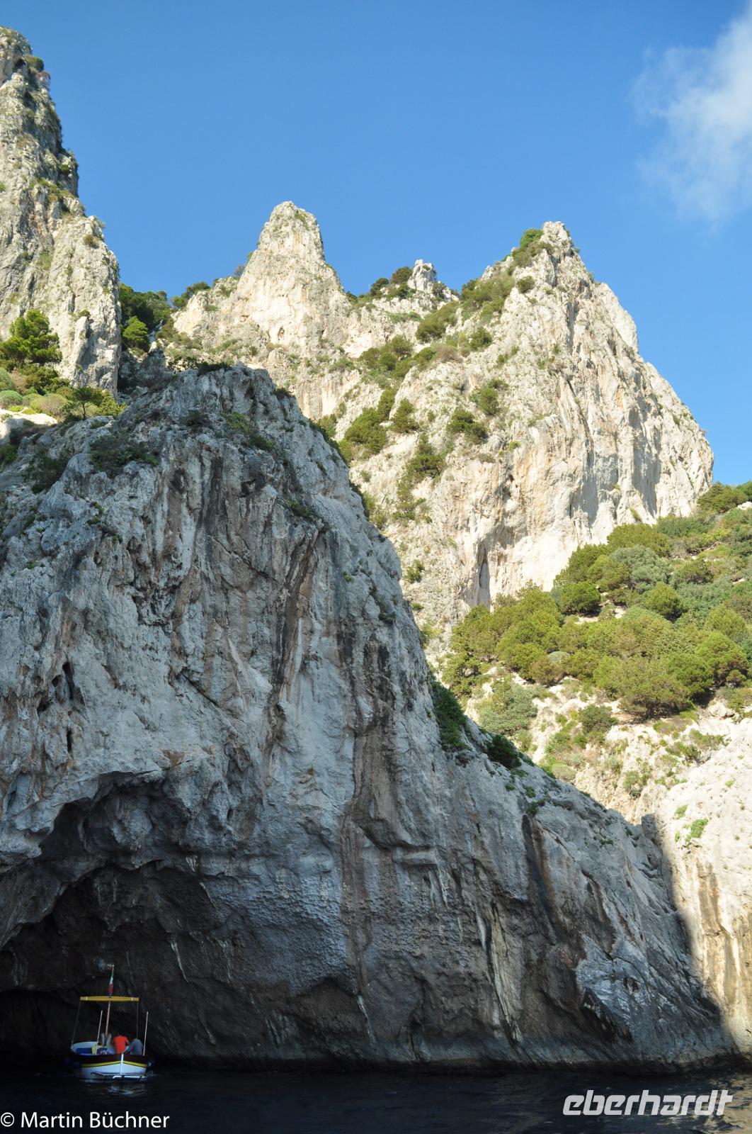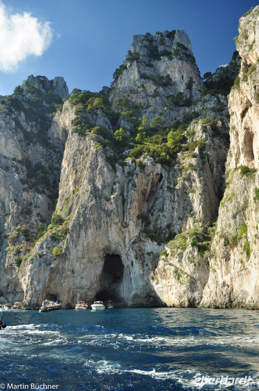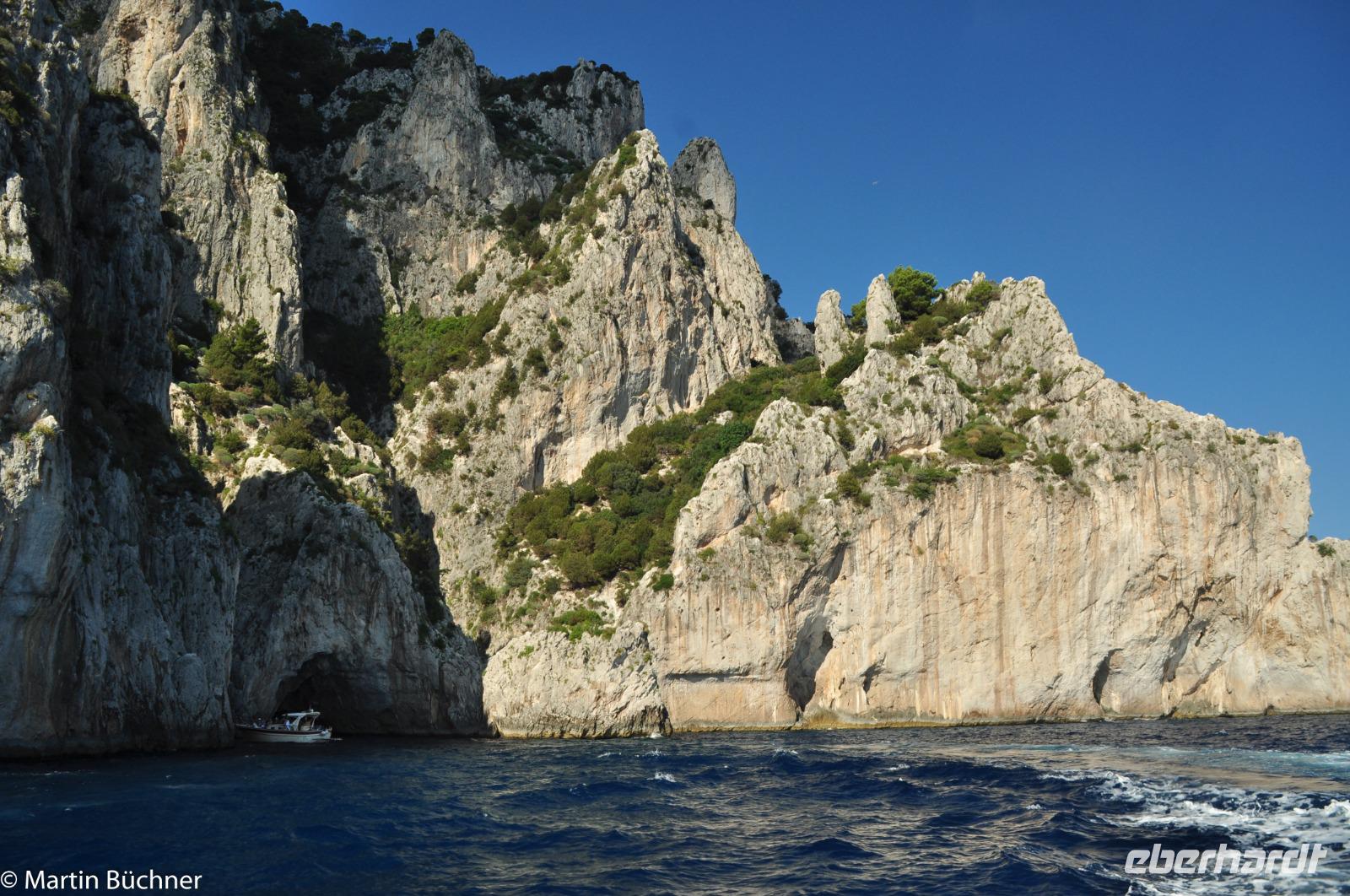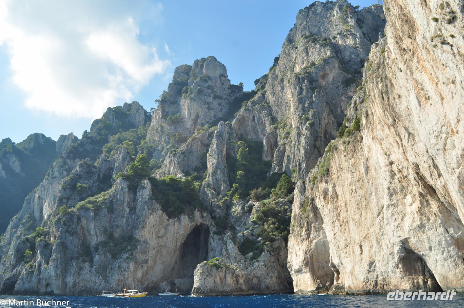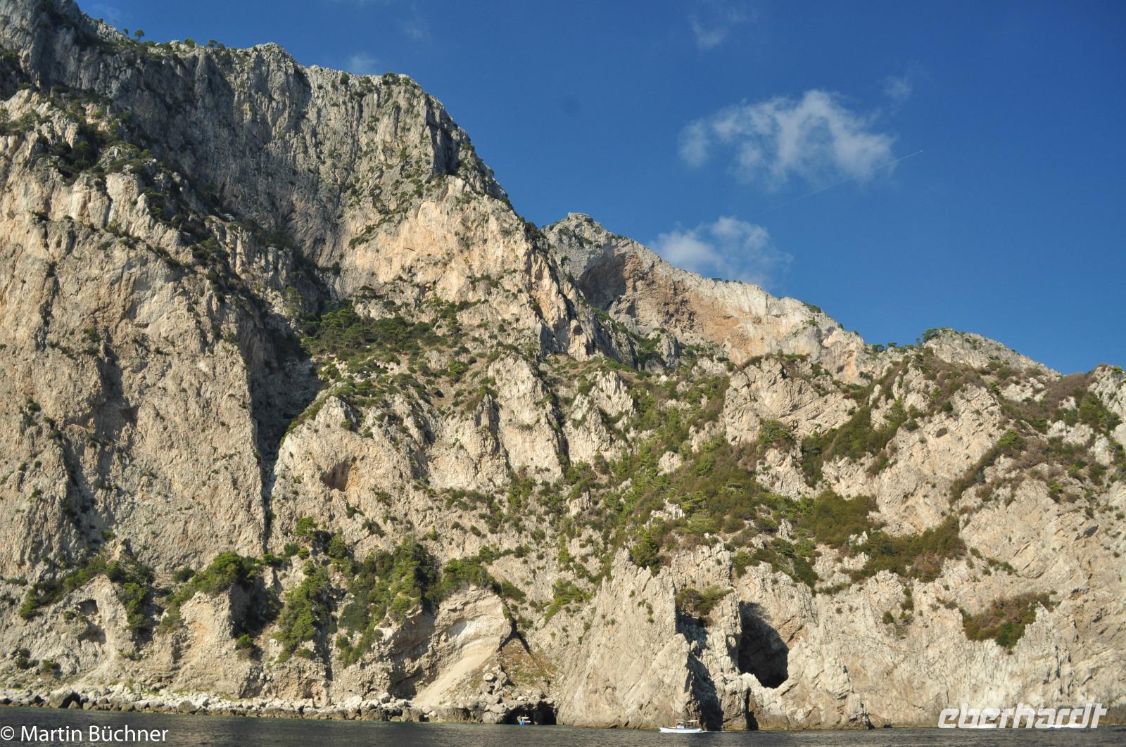 Bereits von Seeseite zeigt sich die Vielfältigkeit von Capri. Geologisch passt sie mit ihren hellen Karstfelsen so gar nicht in den Kontext des vulkanischen Golfs. Schroffe, steile stark zerklüftete Kalkfelsen mit einer Vielzahl von Grotten.