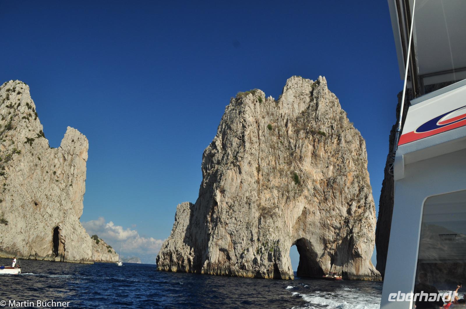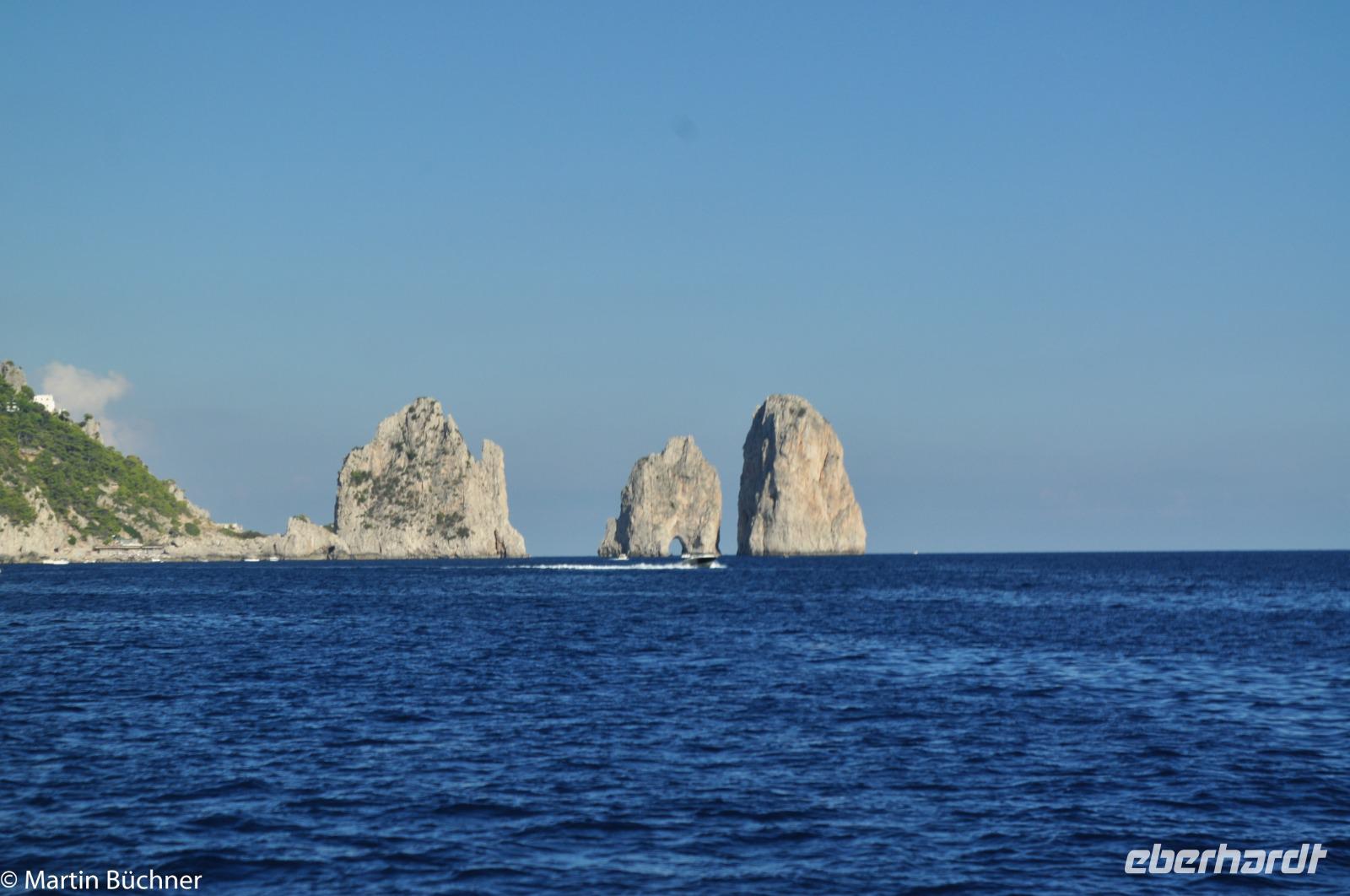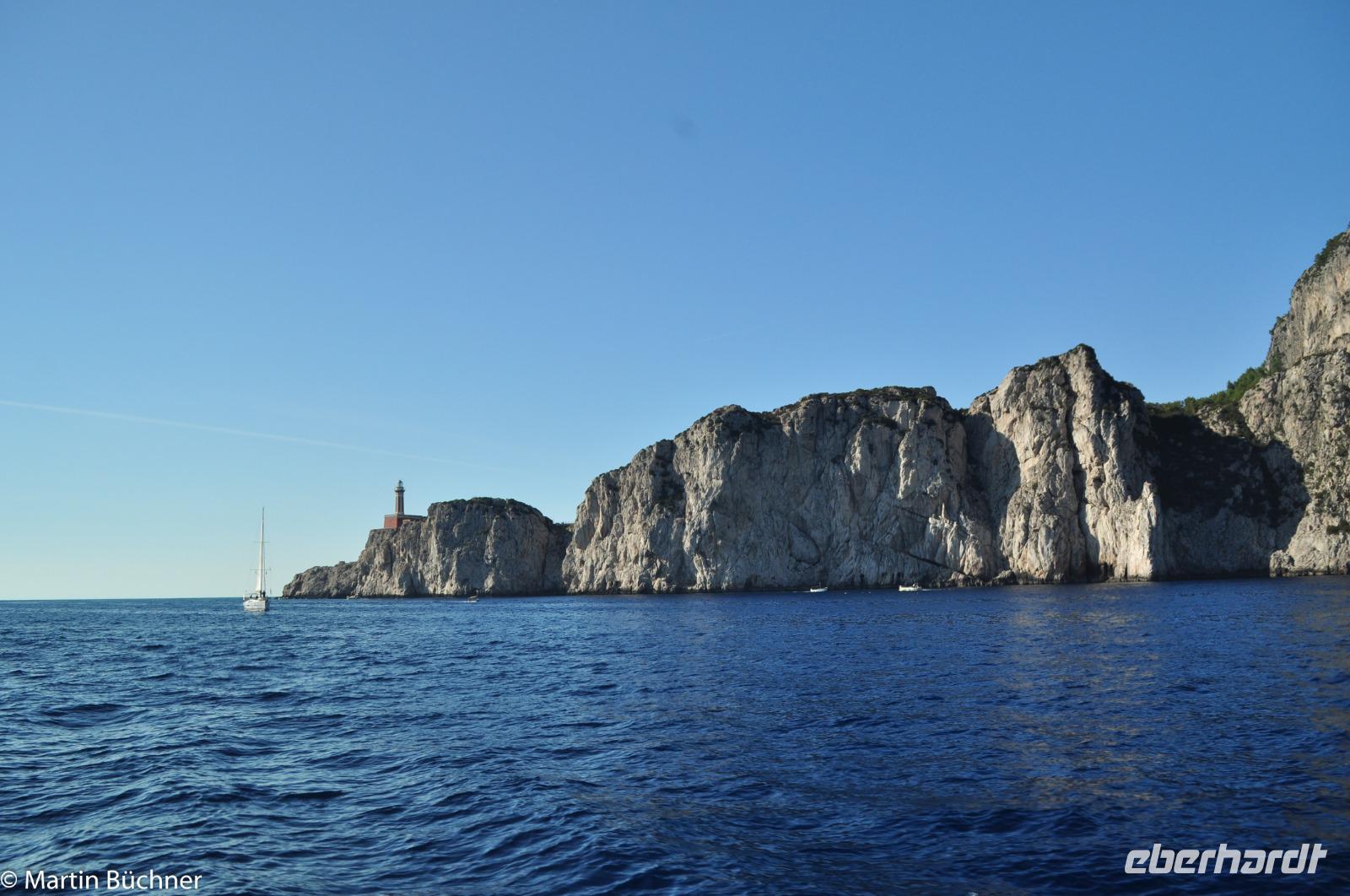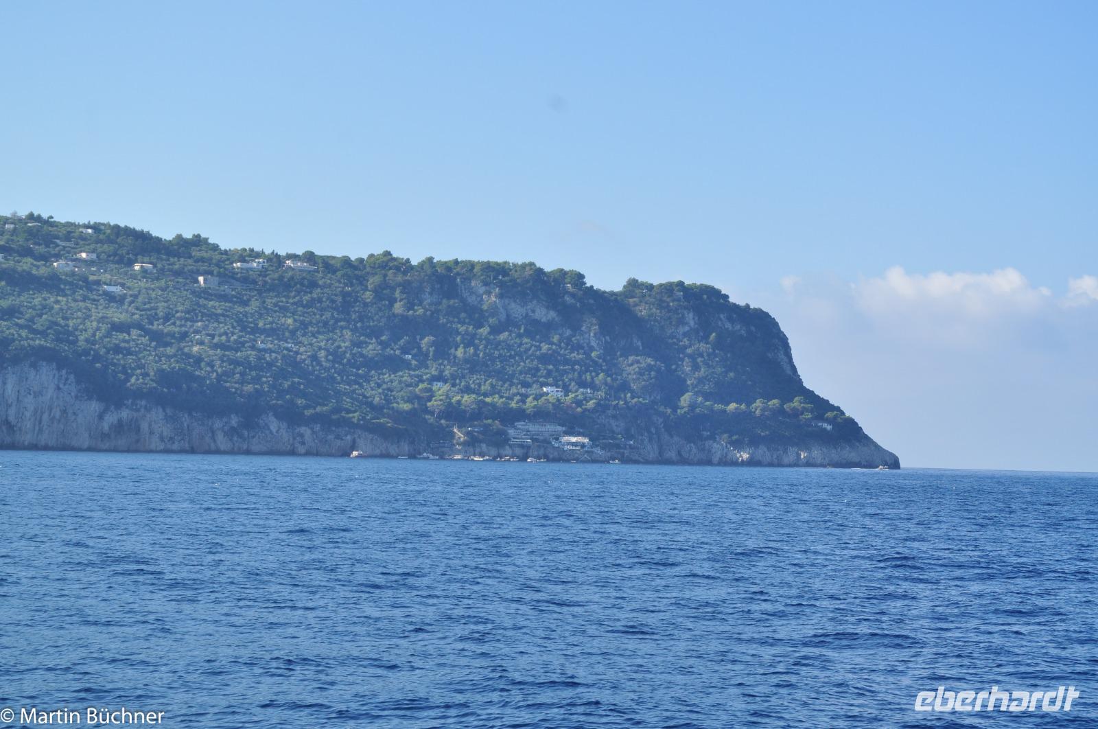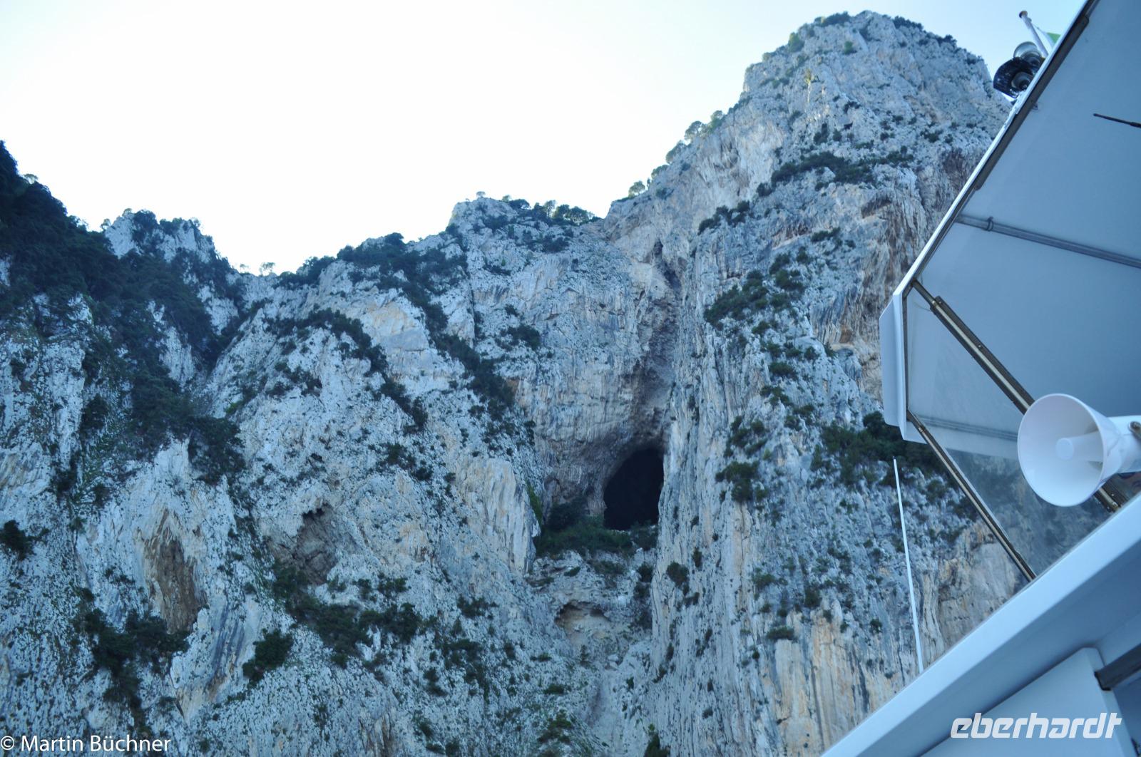 Bereits von Seeseite zeigt sich die Vielfältigkeit von Capri. Geologisch passt sie mit ihren hellen Karstfelsen so gar nicht in den Kontext des vulkanischen Golfs. Schroffe, steile stark zerklüftete Kalkfelsen mit einer Vielzahl von Grotten.