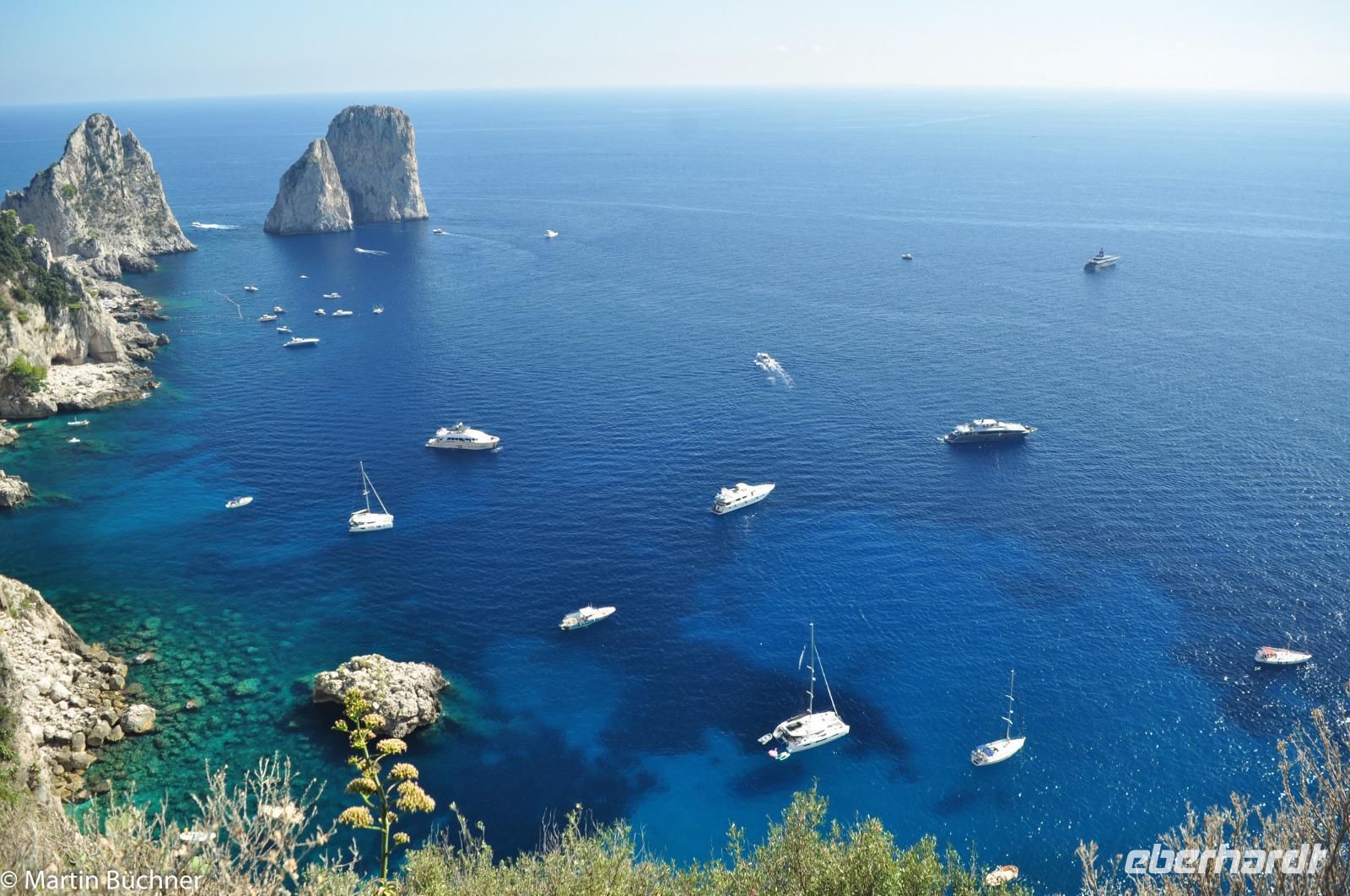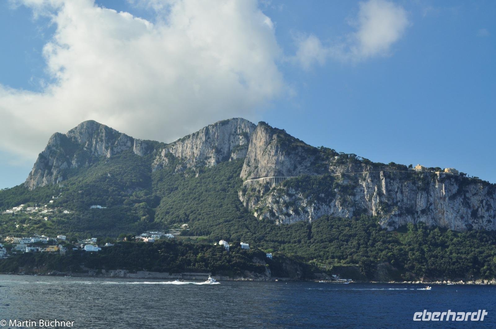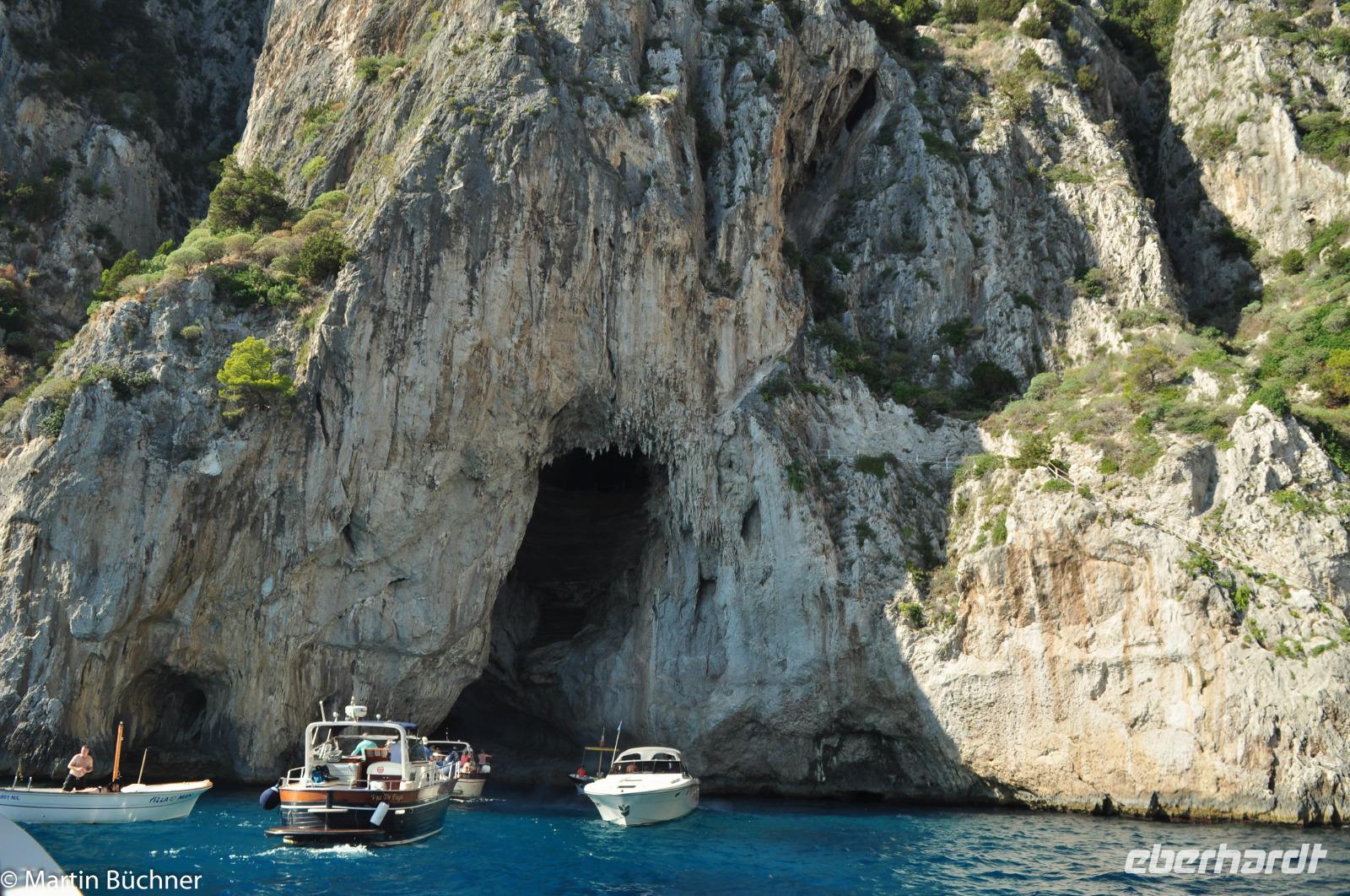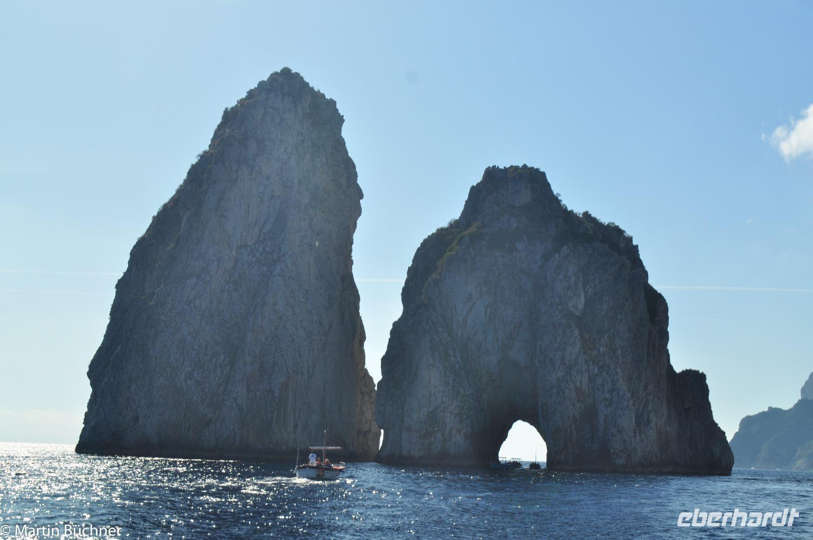 Bereits von Seeseite zeigt sich die Vielfältigkeit von Capri. Geologisch passt sie mit ihren hellen Karstfelsen so gar nicht in den Kontext des vulkanischen Golfs. Schroffe, steile stark zerklüftete Kalkfelsen mit einer Vielzahl von Grotten.