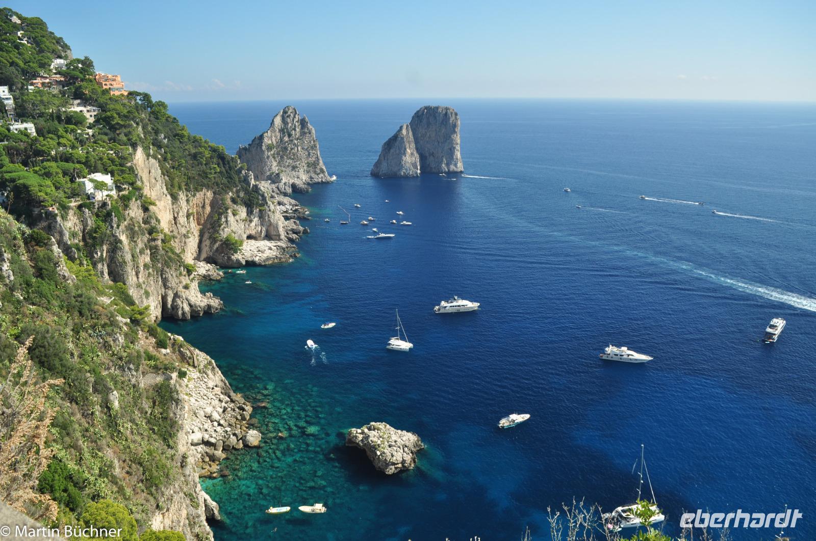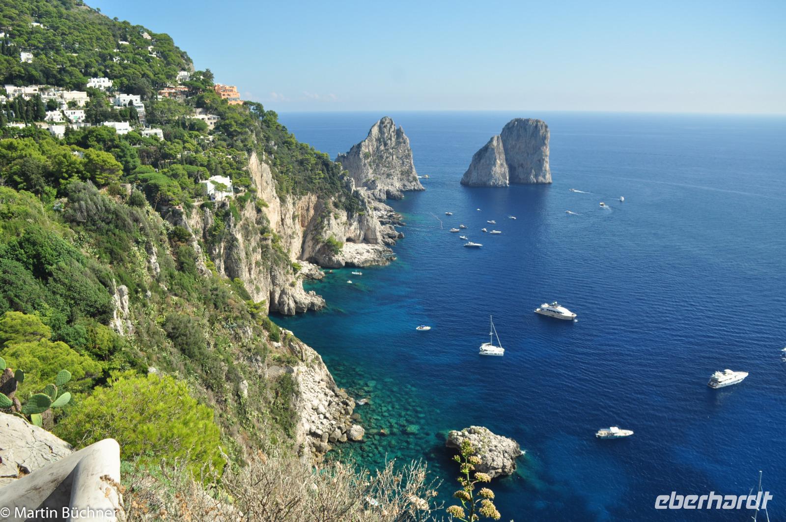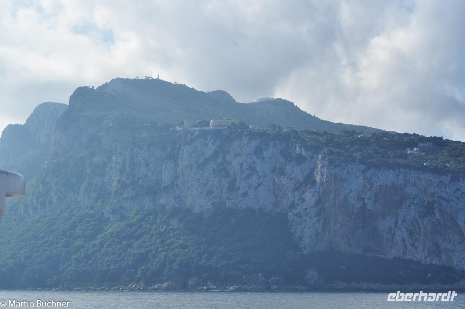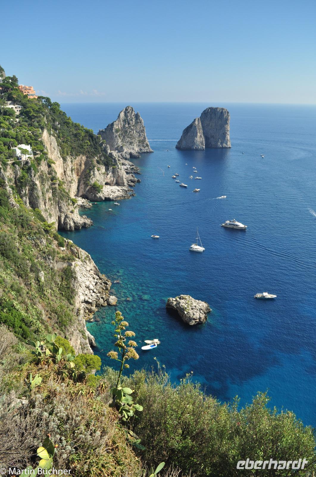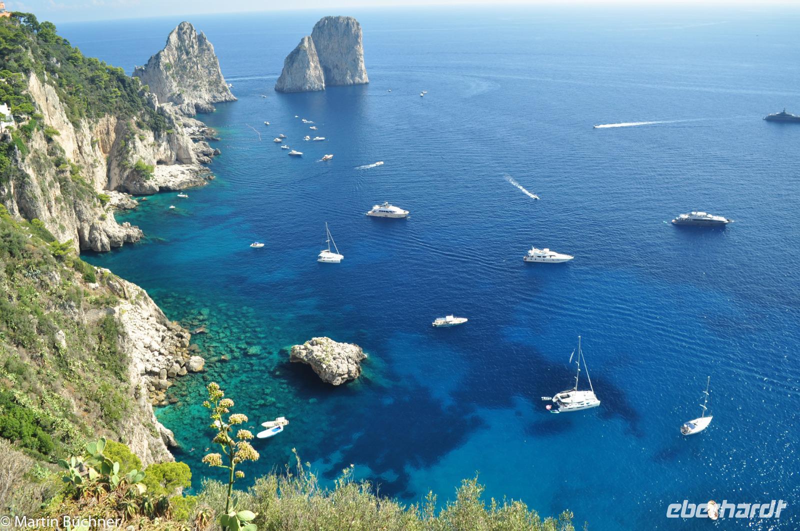 Bereits von Seeseite zeigt sich die Vielfältigkeit von Capri. Geologisch passt sie mit ihren hellen Karstfelsen so gar nicht in den Kontext des vulkanischen Golfs. Schroffe, steile stark zerklüftete Kalkfelsen mit einer Vielzahl von Grotten.
