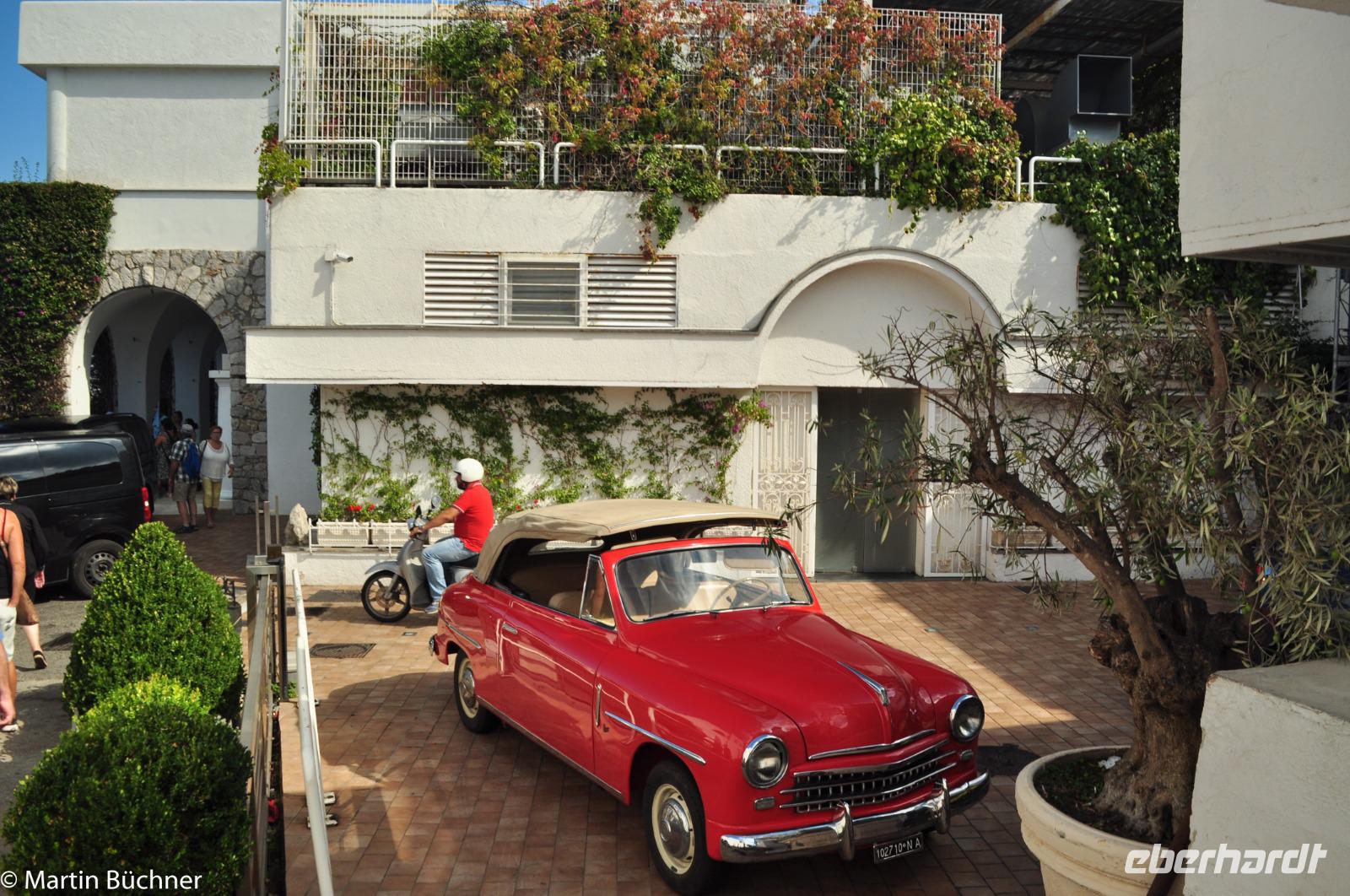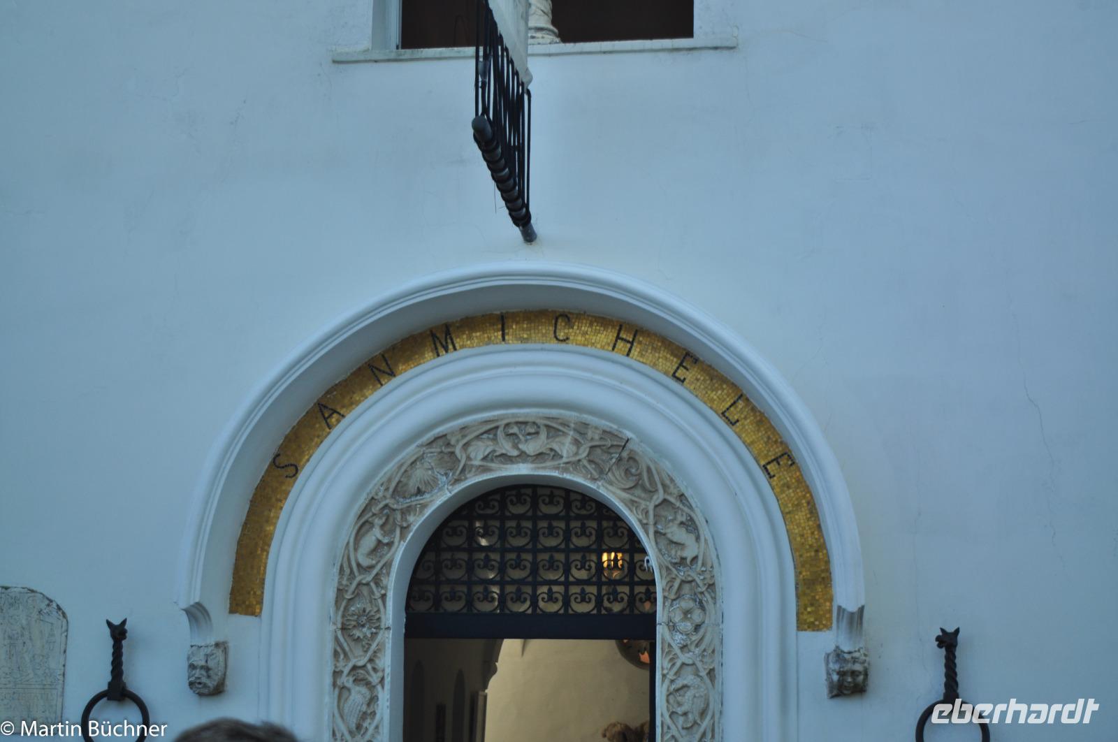 Im kleinen Hafen von Capri herrscht Hochbetrieb. Wir steigen in einen Kleinbus um, der uns durch sehr dichten Verkehr hinauf auf etwa 280 m über dem Meer in die Siedlung Anacapri bringt. Die Auffahrt über spitze Serpentinen und zahlreiche Galerien immer nah an der Felskante ist atemberaubend.