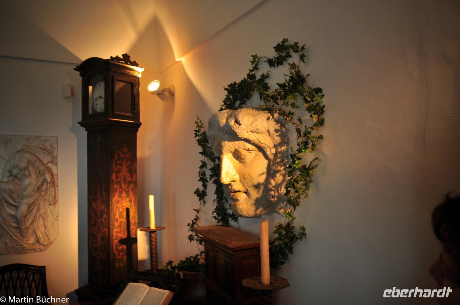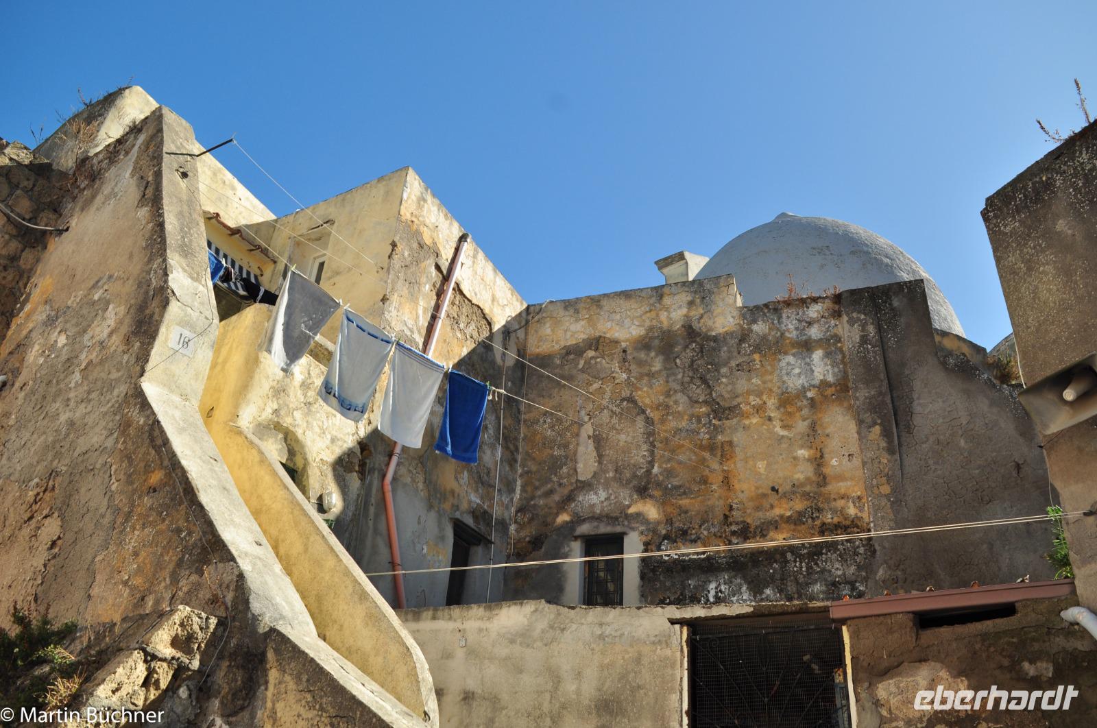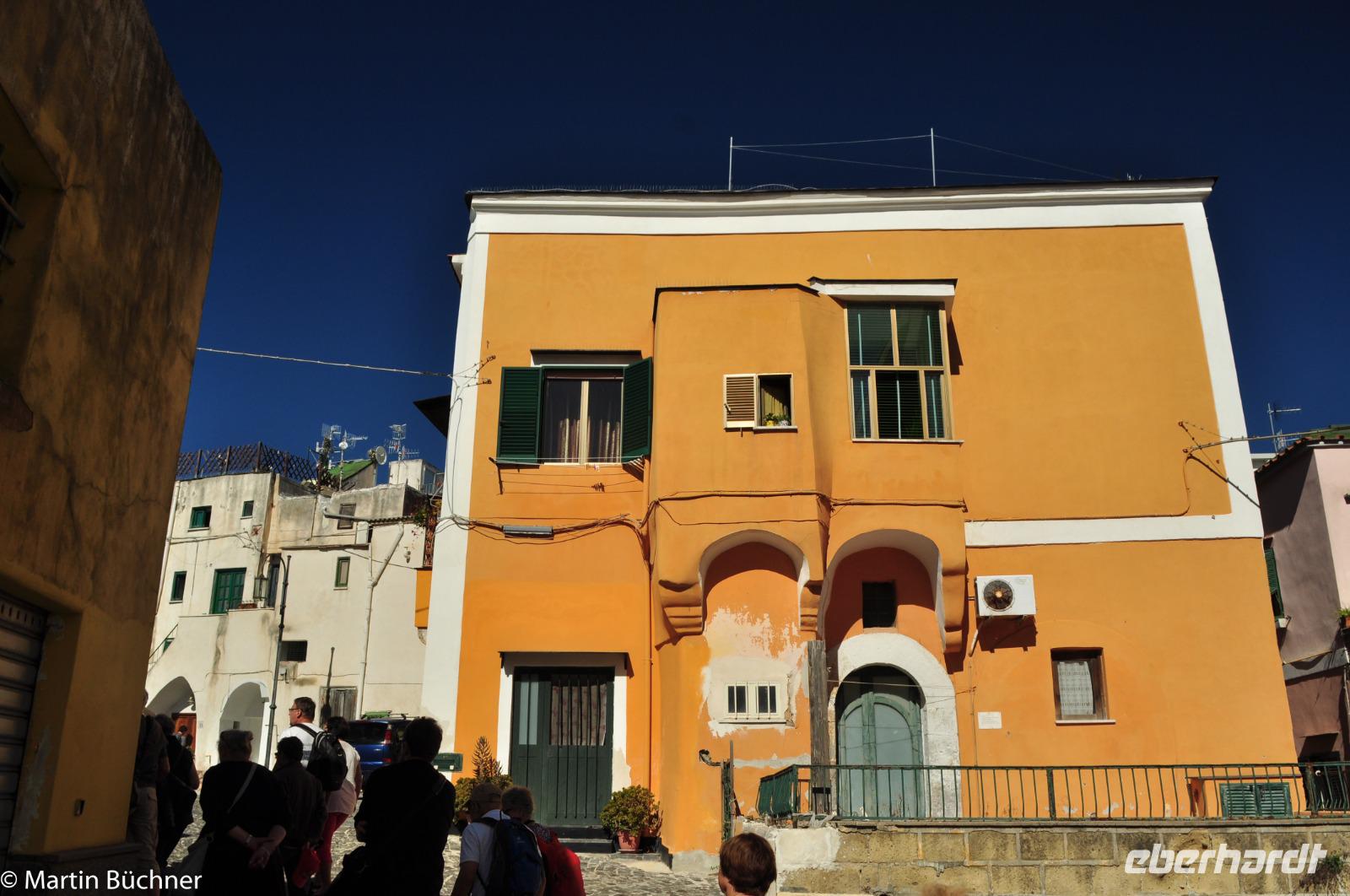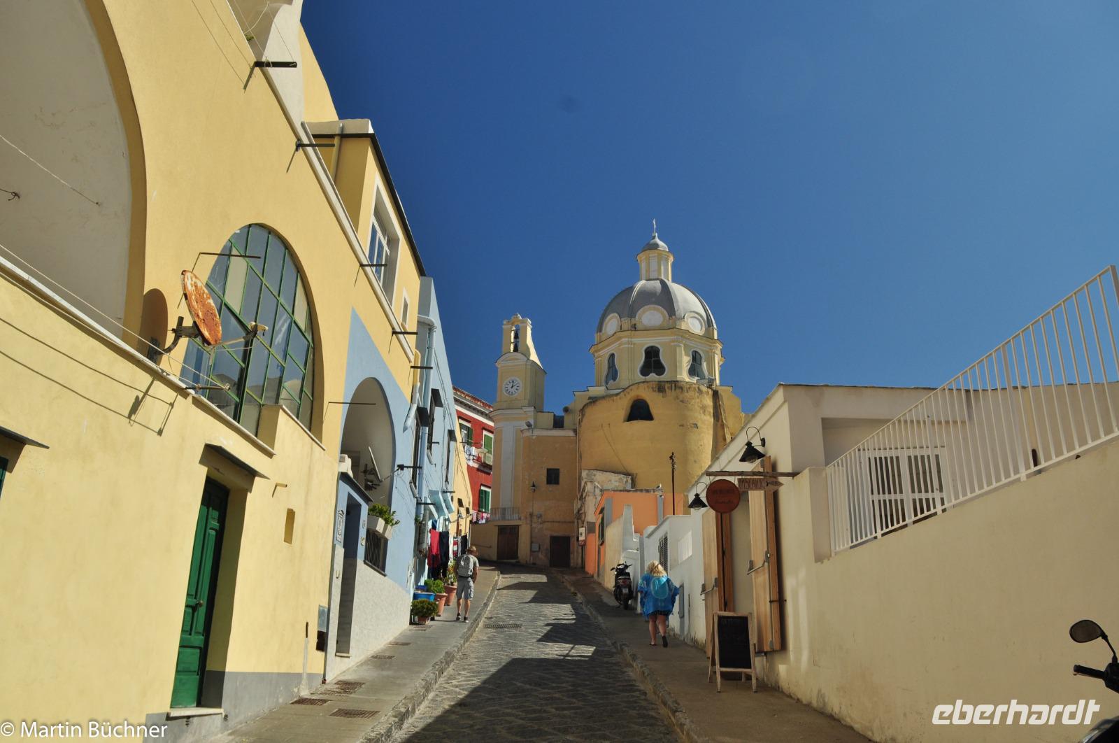 Vor der Kirche liegt der „Balkon über dem Golf von Neapel", was für eine Aussicht auf Golf und Vesuv, was für ein Kaiserwetter. Erstmalig zeigt sich sogar die Krateröffnung des Vesuvs, so gut ist die Sicht. Ein Staunen geht durch die Gruppe. In der Kirche lernen wir die wahre Bedeutung des Wortes „abhängen" kennen, der Begriff ist dem einen oder anderen vielleicht für Fleisch aus der Metzgerei bekannt. Auf Procida löst der Spruch von Touristen „lasst uns doch mal kurz abhängen" starkes befremden aus. Unter Abhängen wird ein Umgang mit Toten verstanden. Die Toten der Insel wurden in Öffnungen im Kirchenboden (!) gehängt, um zu verwesen und/oder zu mumifizieren, bevor sie später die verbliebenen Überreste in einem Beinhaus lagerten.