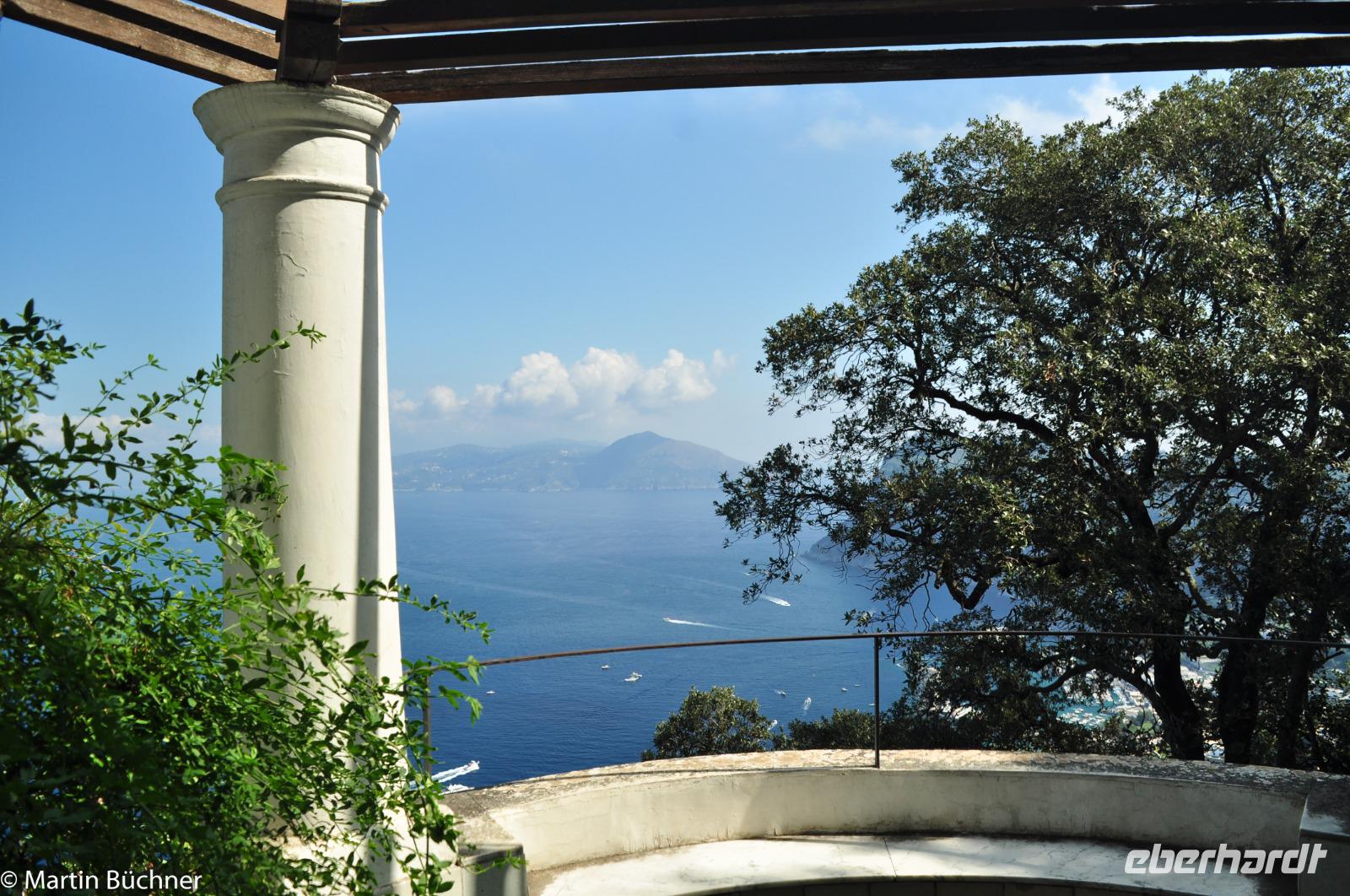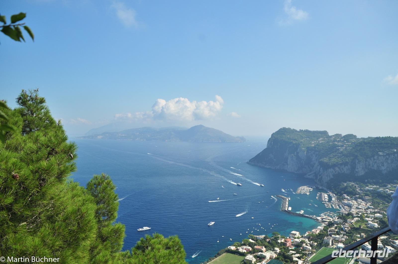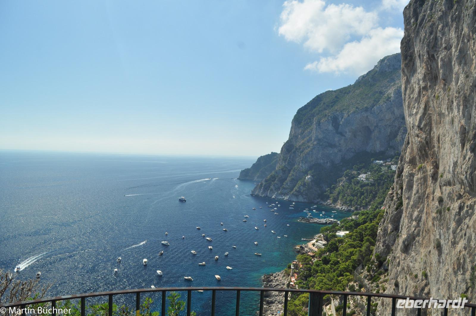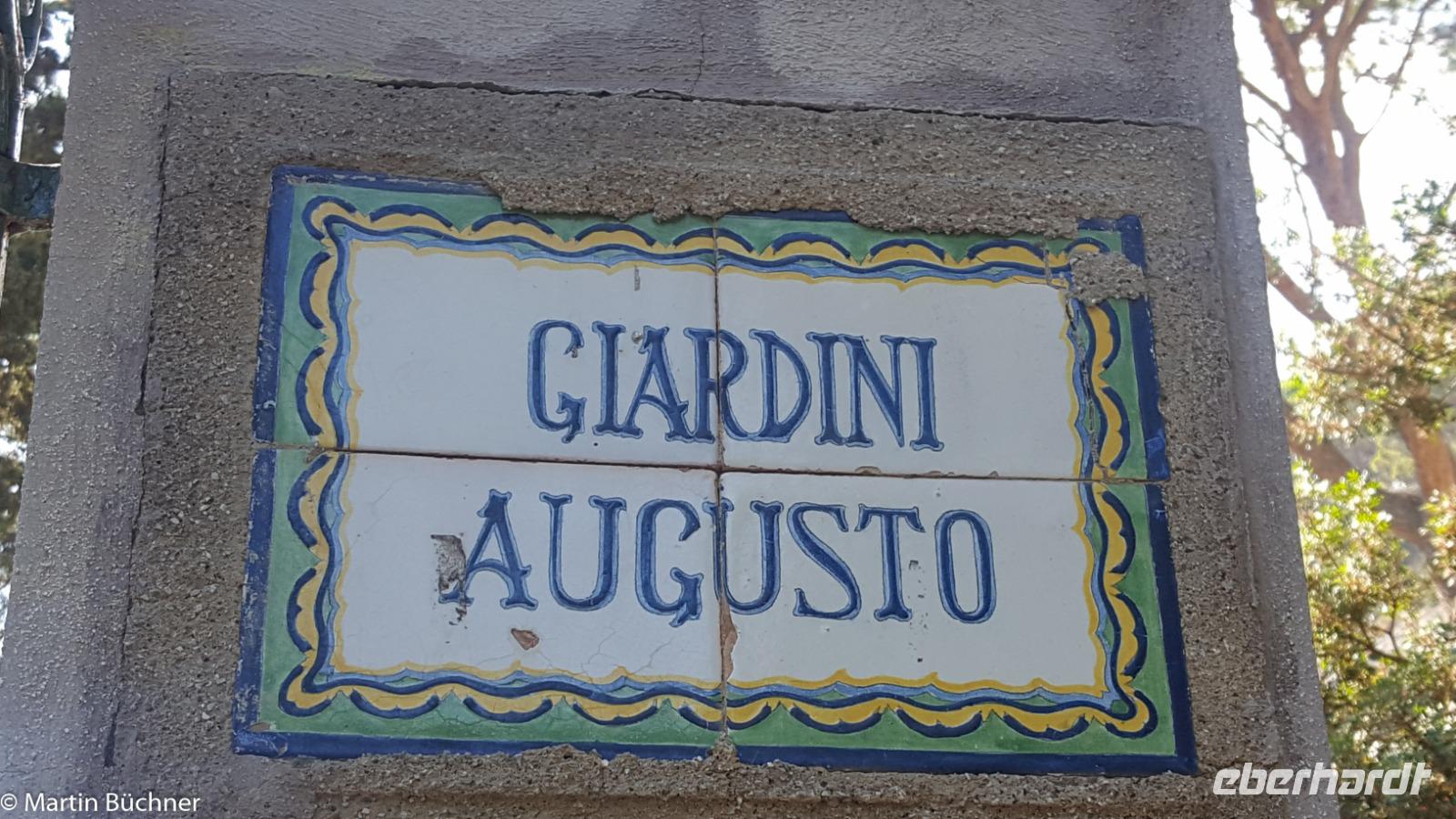 Wir besuchen die Giardini di Augusto, die Augustusgärten. Ebenfalls eine kleine idyllische Anlage in fantastischer Lage hoch über den Klippen. Unter schattigen Bäumen mit einigen Teichen lässt sich angenehm verschnaufen. Dem Besucher bieten sich weite Ausblicke in den Golf, erst recht an diesem Tag. Wer mutig genug ist nach unten zu schauen, findet türkisblaues Meer, auf dessen sanften Wellen die vielen kleinen Boote schaukeln.
