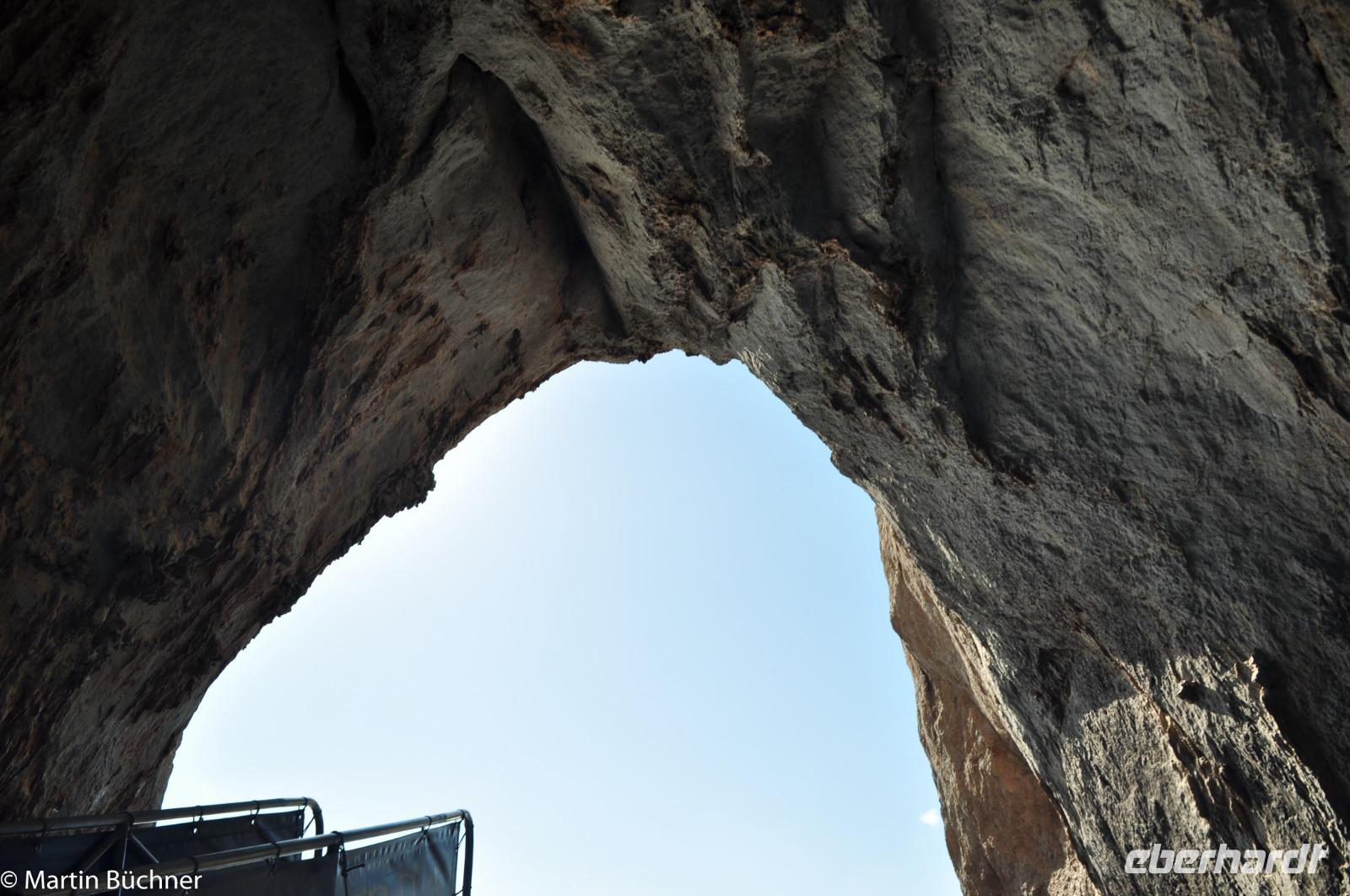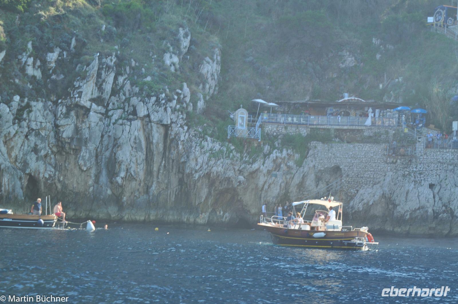 Wir passieren auch den Zugang zur legendären Grotta Azzura, die Blaue Grotte, sie ist am heutigen Tag gesperrt. Wer sie besuchen will benötigt schon ein wenig Mut, die Öffnung zur Grotte ist gerade einmal 1,5 m hoch, nicht zu vergessen die Wellen. Interessierte Besucher müssen sich in kleinen Booten hinein rudern lassen und sich flach in das Ruderboot legen, um den niedrigen Eingang zu passieren.