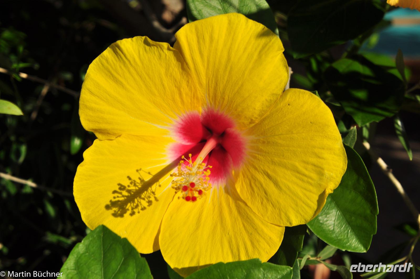 Der Bus bringt uns wieder hinunter zum Hafen. Erst jetzt fällt vielen die wunderbaren Blüten des Hibiskus auf. Wir besteigen ein Ausflugsboot, dass uns einmal um die Insel fahren wird. Hier zeigt sich erneut eine ganz andere pittoreske Schönheit, gebildet durch die Natur. Schroffe Felsklippen und Felsnadeln, Felsentore und immer wieder kleine Grotten und Höhlen. Fantastisches Wetter, fantastische Farben, fantastische Natur.