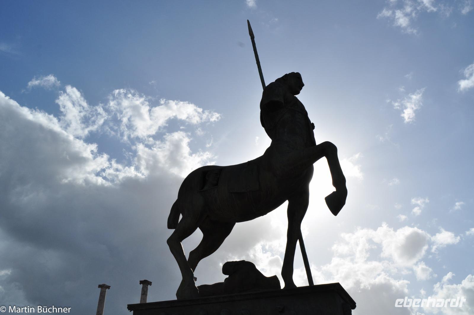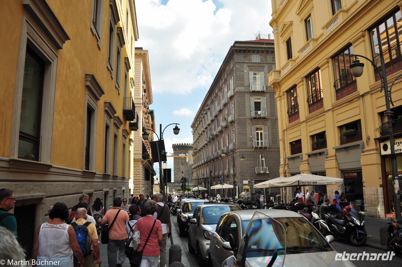 Auch heute nehmen wir wieder ein Schiff, die Fähre nach Neapel. Nach einer guten Stunde erreichen wir Neapel. Der Hafen wird von zwei mächtigen Kastellen beschützt, zum einen das Castel dell'Ovo auf einer kleinen Halbinsel gelegen. In der heutigen Form wurde es zwischen dem 1. Jahrhundert v. Chr. und dem 16 Jahrhundert errichtet. Die Legende besagt, dass an dieser Stelle die Sirene Parthenope tot an Land gespült wurde, nachdem es ihr nicht gelang Odysseus mit ihrem betörenden Gesang ins Unglück zu ziehen. Sie beging Selbstmord, in dem sie sich wie die anderen Sirenen ins Meer stürzte. Der Ort wurde in der Antike ein ritueller Pilgerort. Noch Napoleon I. berief sich auf diese Legende in dem er 1799 die „Parthenopäische Republik" gründete.