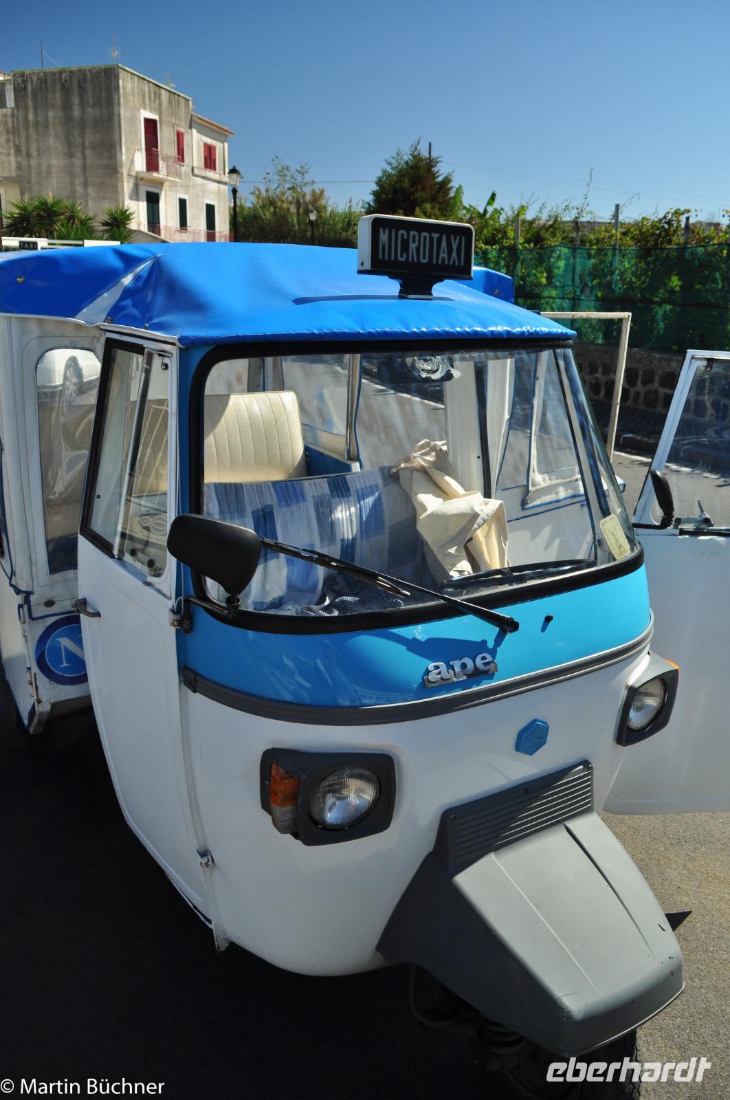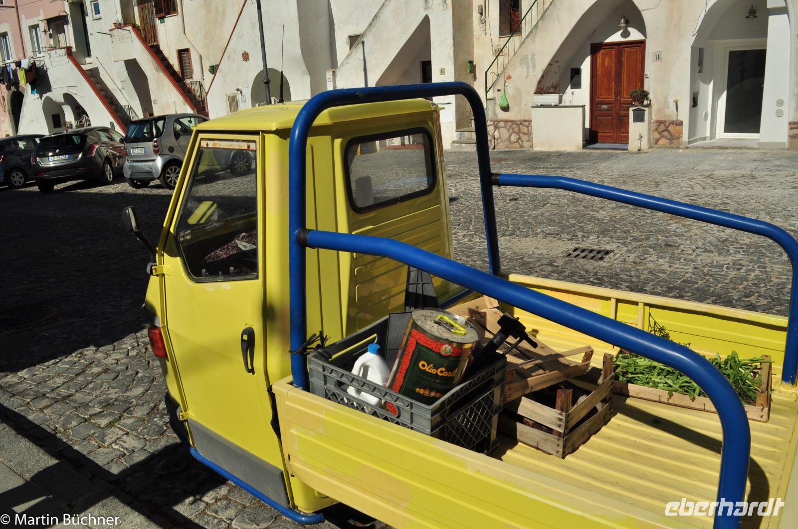 Mit kleinen Microtaxis geht es hinauf in die Altstadt. Eines der Microtaxis ist eine Ape, eines der typisch italienischen Dreiräder, Lastenesel für alles was transportiert werden muss, egal ob Passagiere, Zitronen, Olivenöl oder dringend benötigte Gasflaschen.