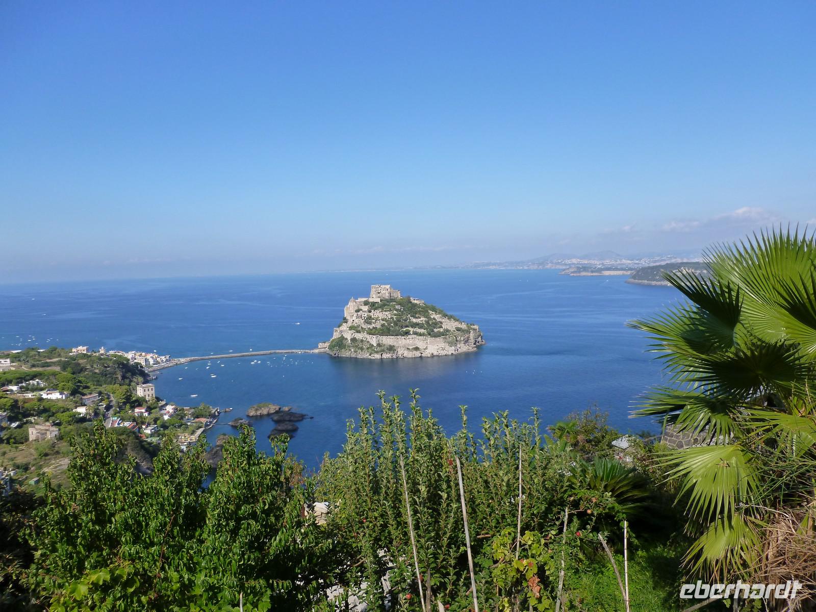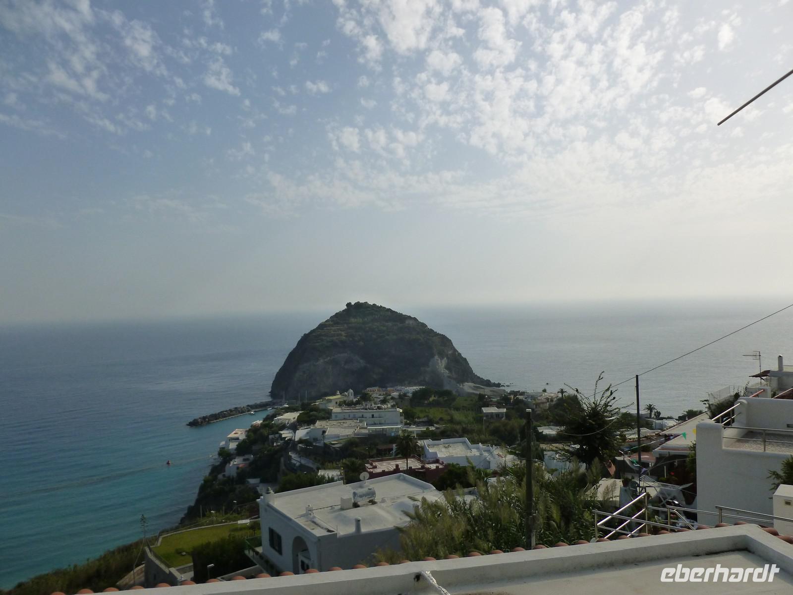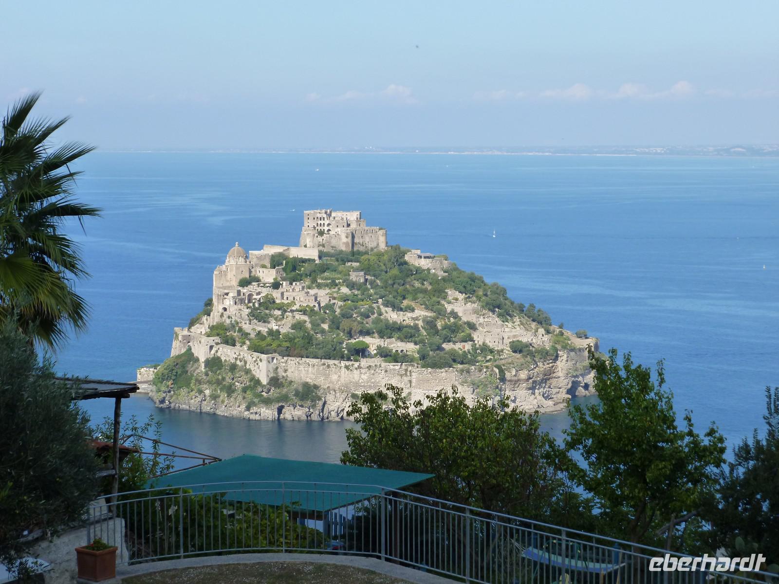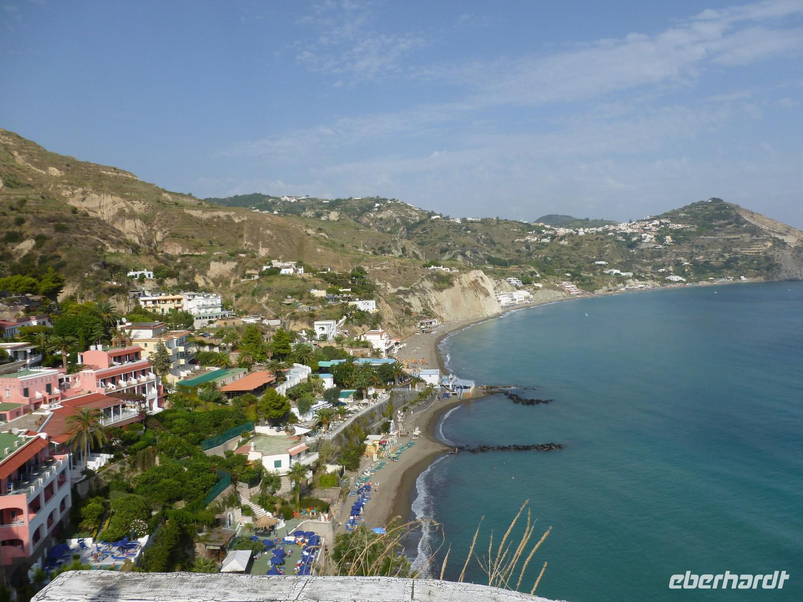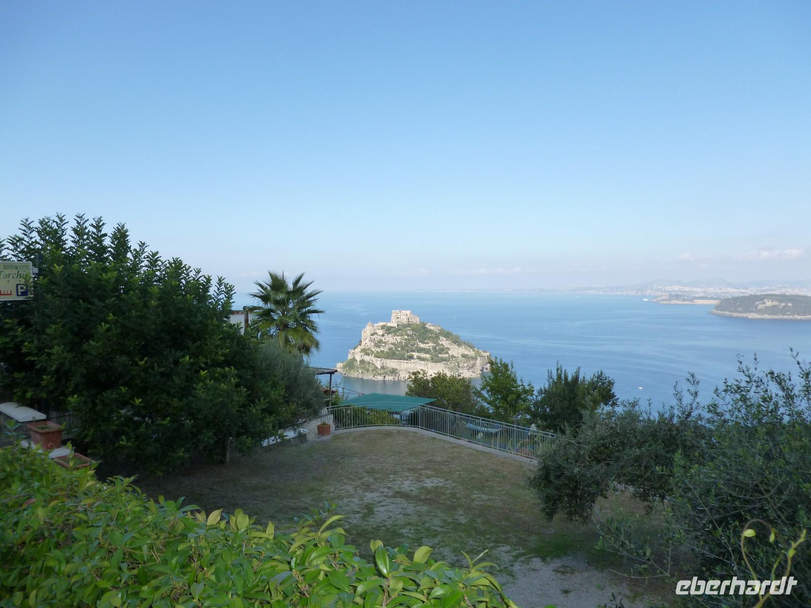 Mittags kamen wir in Neapel an. Hier war es sehr warm, 30°C. Der örtliche Reiseleiter Alberto begrüßte uns und wir vertrauten seinen Leuten unsere Koffer an. Diese bekamen einen Extratransfer nach Ischia mit einem Lieferwagen. Alberto führte uns zum Bus, der uns bis zum Hafen von Neapel brachte. Hier warteten wir bis die Fähre nach Ischia zum Einsteigen bereitstand. Nach 90 Minuten Überfahrt kamen wir am Nachmittag in Ischia Porto an und konnten bereits die „grüne Wand" aus Bäumen bestaunen, obwohl der Sommer heiß und trocken war, wie Alberto betonte. Nun fuhren wir zum Hotel „Punta Imperatore" in Forio-Citara und bezogen unsere Zimmer. Wir nutzten die Zeit für einen ersten Spaziergang zum Strand, bis dann auch die Koffer zu uns gebracht wurden. Die drei Gäste aus der Leipzig-Maschine kamen gerade zum Abendessen an. Es gab ein reichhaltiges Antipasti-Buffet. Serviert wurden uns die zwei üblichen Hauptgerichte, Primo (Pasta, Reis, Gnocchi oder Suppe) und Secondo (Fleisch-, Fisch- oder Eierspeisen) und ein Dessert. Danach gab es noch einen Begrüßungsdrink und wir versanken in den Betten.