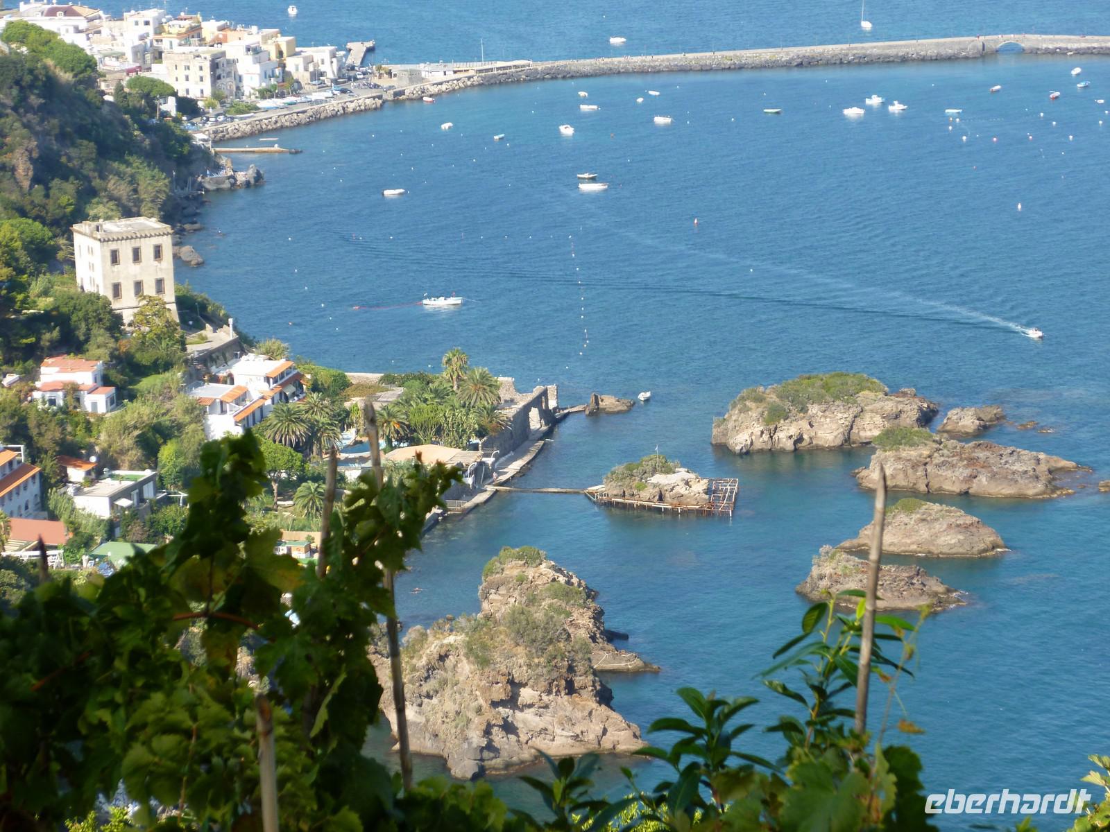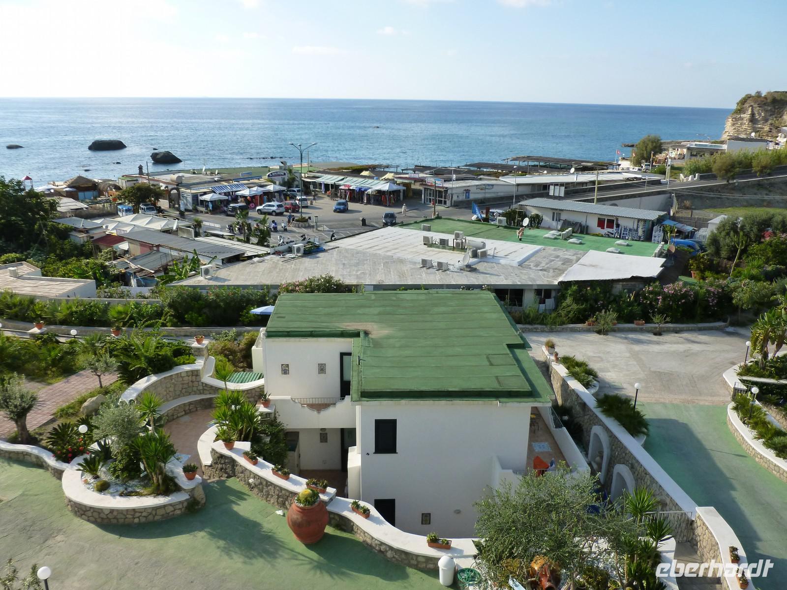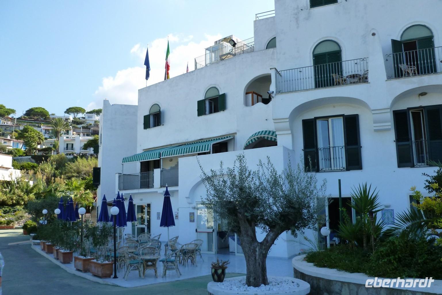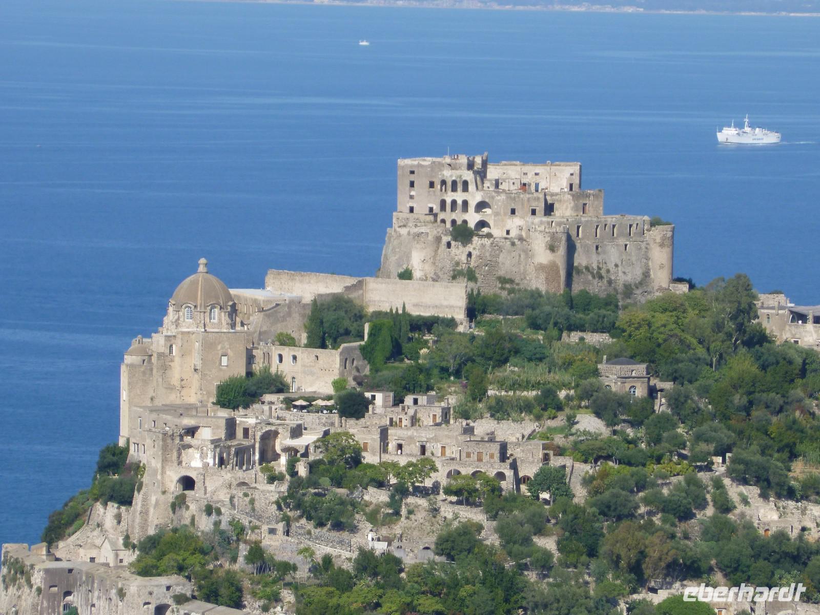 Mittags kamen wir in Neapel an. Hier war es sehr warm, 30°C. Der örtliche Reiseleiter Alberto begrüßte uns und wir vertrauten seinen Leuten unsere Koffer an. Diese bekamen einen Extratransfer nach Ischia mit einem Lieferwagen. Alberto führte uns zum Bus, der uns bis zum Hafen von Neapel brachte. Hier warteten wir bis die Fähre nach Ischia zum Einsteigen bereitstand. Nach 90 Minuten Überfahrt kamen wir am Nachmittag in Ischia Porto an und konnten bereits die „grüne Wand" aus Bäumen bestaunen, obwohl der Sommer heiß und trocken war, wie Alberto betonte. Nun fuhren wir zum Hotel „Punta Imperatore" in Forio-Citara und bezogen unsere Zimmer. Wir nutzten die Zeit für einen ersten Spaziergang zum Strand, bis dann auch die Koffer zu uns gebracht wurden. Die drei Gäste aus der Leipzig-Maschine kamen gerade zum Abendessen an. Es gab ein reichhaltiges Antipasti-Buffet. Serviert wurden uns die zwei üblichen Hauptgerichte, Primo (Pasta, Reis, Gnocchi oder Suppe) und Secondo (Fleisch-, Fisch- oder Eierspeisen) und ein Dessert. Danach gab es noch einen Begrüßungsdrink und wir versanken in den Betten.