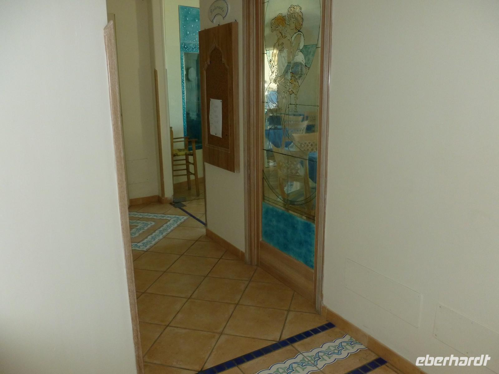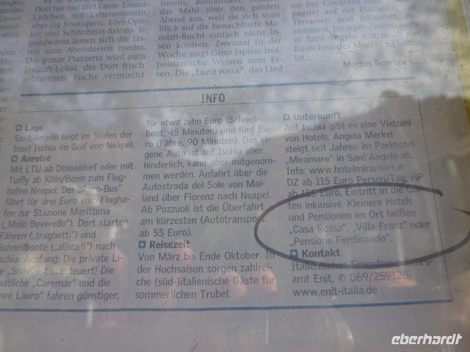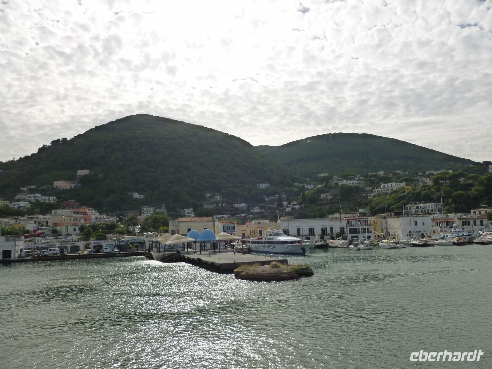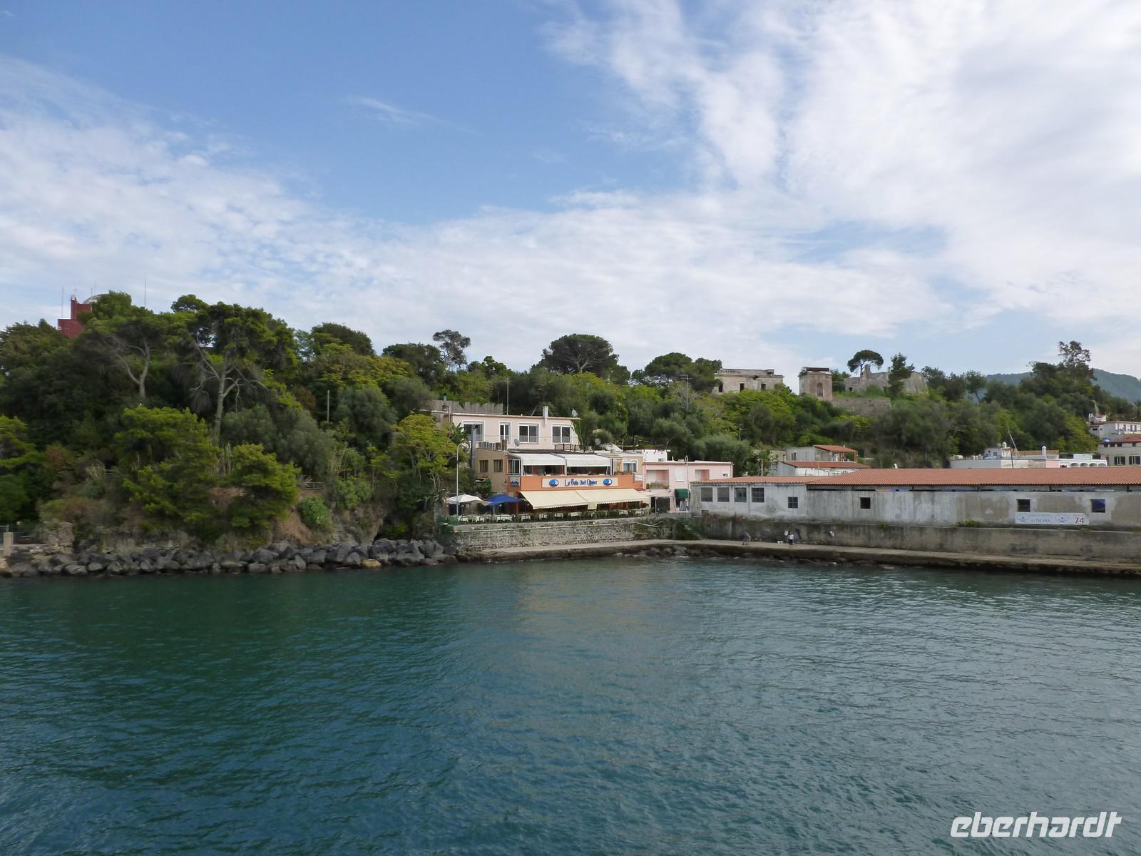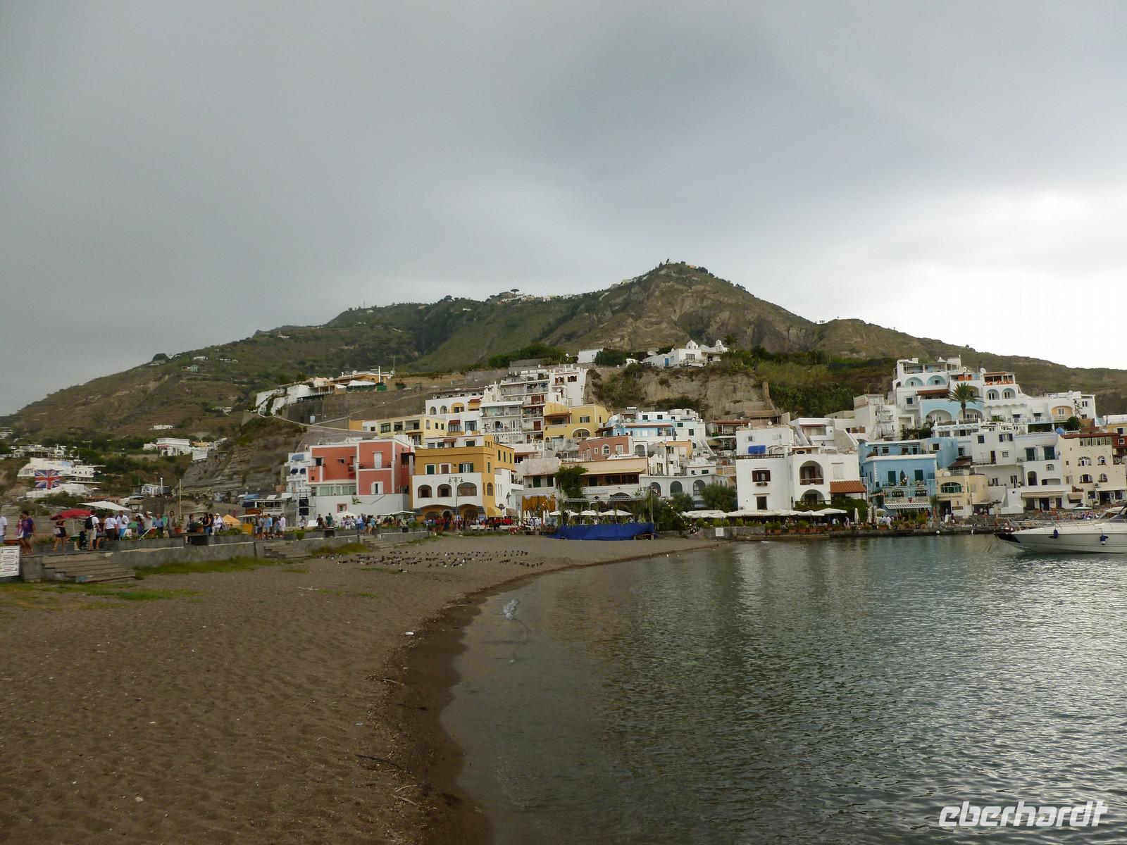 Mittags kamen wir in Neapel an. Hier war es sehr warm, 30°C. Der örtliche Reiseleiter Alberto begrüßte uns und wir vertrauten seinen Leuten unsere Koffer an. Diese bekamen einen Extratransfer nach Ischia mit einem Lieferwagen. Alberto führte uns zum Bus, der uns bis zum Hafen von Neapel brachte. Hier warteten wir bis die Fähre nach Ischia zum Einsteigen bereitstand. Nach 90 Minuten Überfahrt kamen wir am Nachmittag in Ischia Porto an und konnten bereits die „grüne Wand" aus Bäumen bestaunen, obwohl der Sommer heiß und trocken war, wie Alberto betonte. Nun fuhren wir zum Hotel „Punta Imperatore" in Forio-Citara und bezogen unsere Zimmer. Wir nutzten die Zeit für einen ersten Spaziergang zum Strand, bis dann auch die Koffer zu uns gebracht wurden. Die drei Gäste aus der Leipzig-Maschine kamen gerade zum Abendessen an. Es gab ein reichhaltiges Antipasti-Buffet. Serviert wurden uns die zwei üblichen Hauptgerichte, Primo (Pasta, Reis, Gnocchi oder Suppe) und Secondo (Fleisch-, Fisch- oder Eierspeisen) und ein Dessert. Danach gab es noch einen Begrüßungsdrink und wir versanken in den Betten.