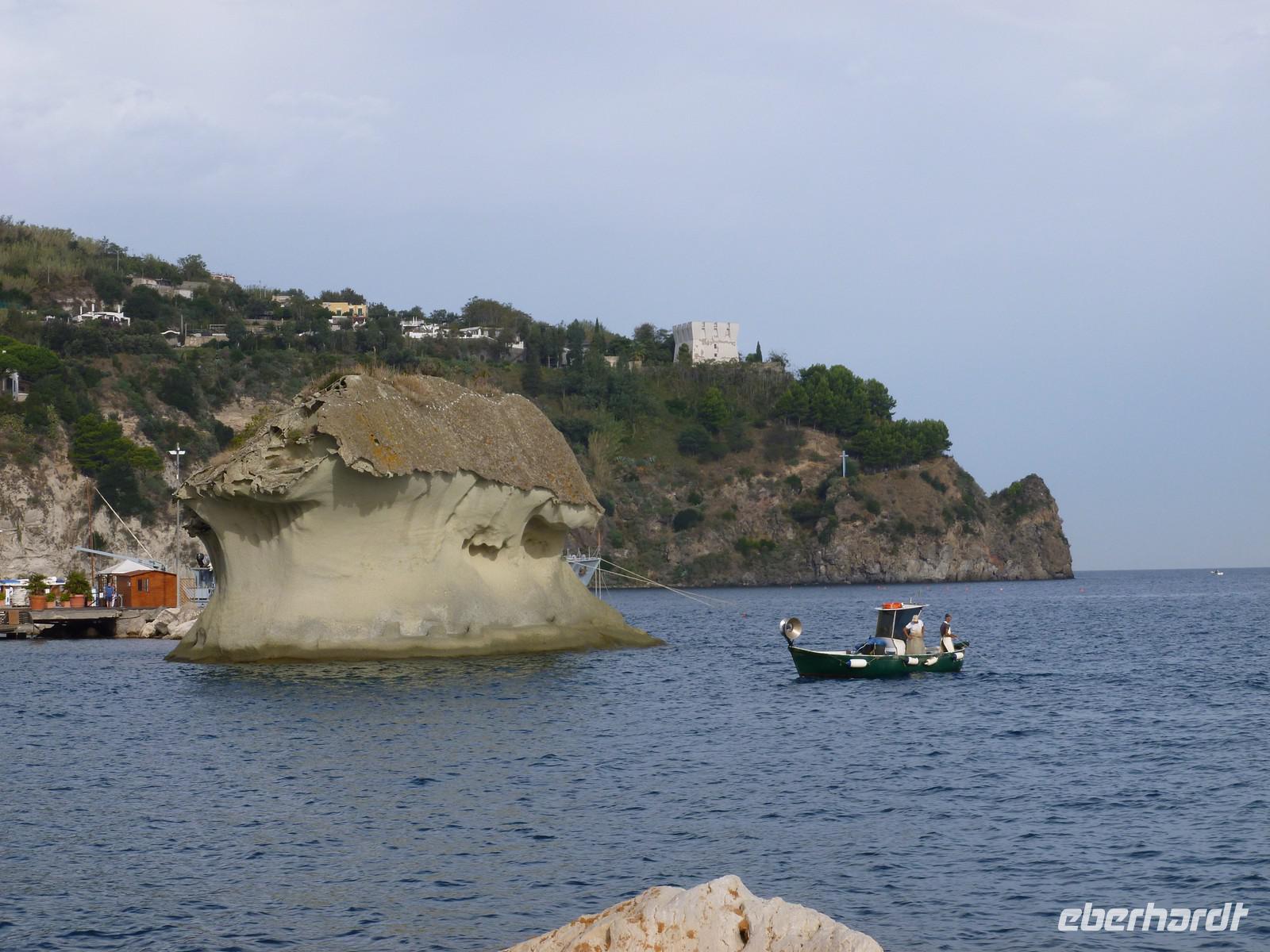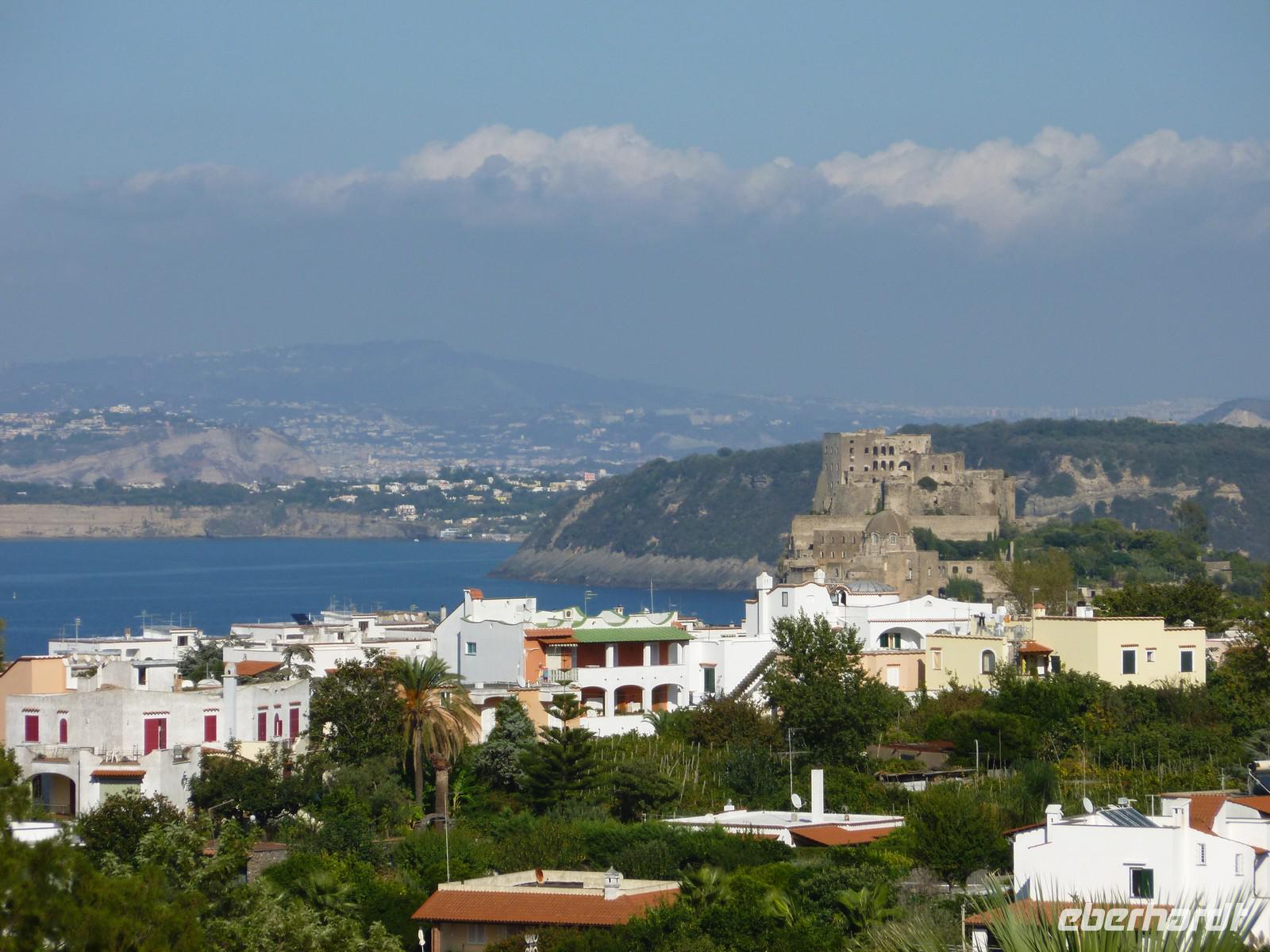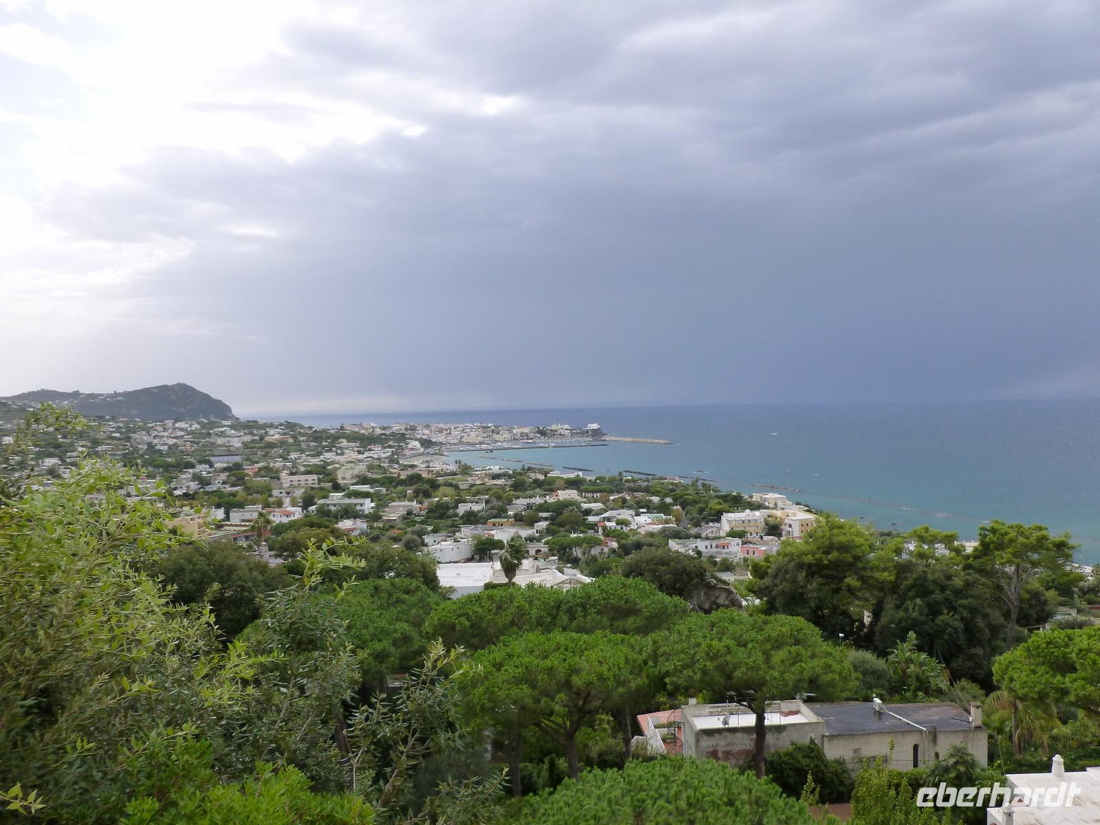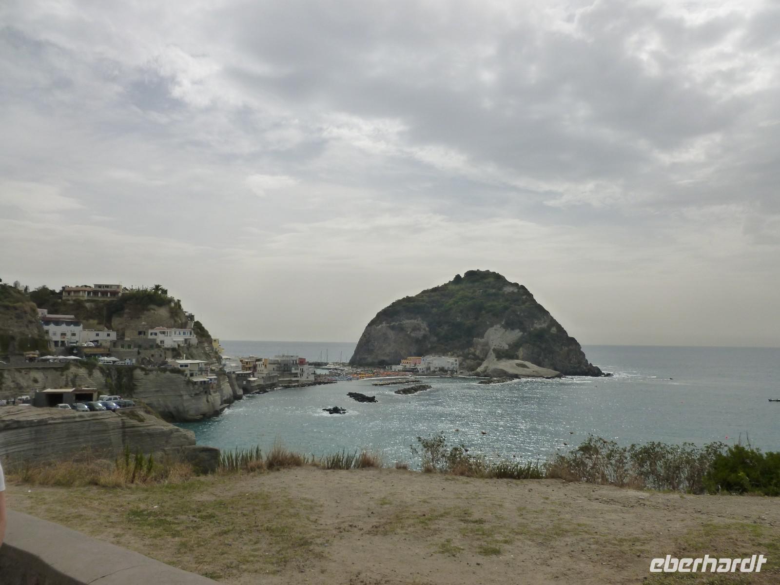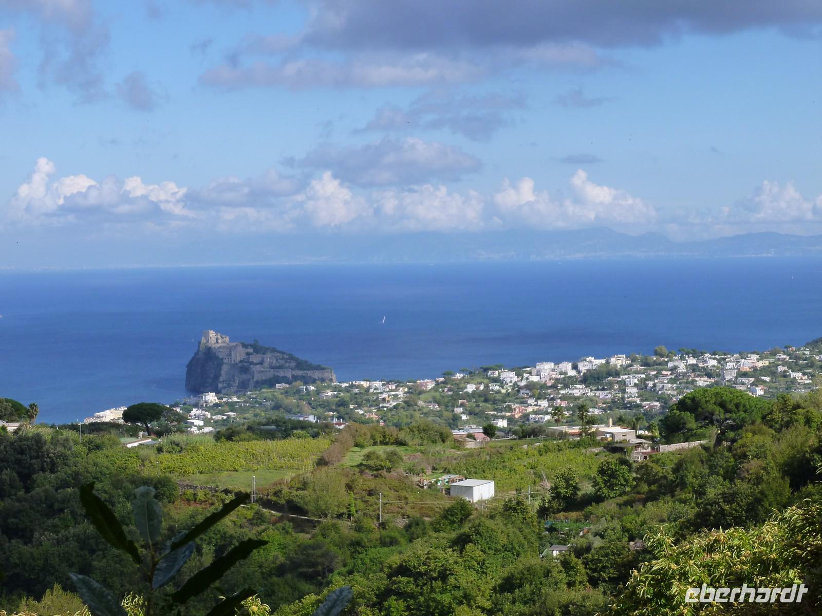 Nach einem ausgiebigen Frühstück holte uns Alberto am Hotel zur Inselrundfahrt ab. Mit dem Bus fuhren wir im Uhrzeigersinn einmal rund um die Insel: Von Forio ging es Richtung Norden nach Lacco Ameno, wo wir einen Fotostopp am Il Fungo, dem Felsmassiv in Form eines Pilzes einlegten. Danach ging es östlich nach Casamicciola Terme und Ischia Porto. Dann erblickten wir schon das Wahrzeichen Ischias, das Castello Aragonese. Nun ging es südlich weiter, an den Pilastri, dem Äquadukt, vorbei nach Barano und durch Buonopane. Hier sahen wir auch schon den Weg zur Nitrodiquelle. Auf dem Weg nach Westen mussten wir durch die Berge mit steilen und engen Kurven. In Fontana, Ischias höchstgelegenem Ort, gab es eine kleine Kaffee- oder besser Cappuccino-Pause und eine Kostprobe vom Limoncello, dem Likör aus Zitronenschalen. Weiter ging es über Serrara nach Sant Angelo. Es wurde hier gerade das Fest des Heiligen Michael mit Prozession und Feuerwerk gefeiert, als ein Gewitter niederging.