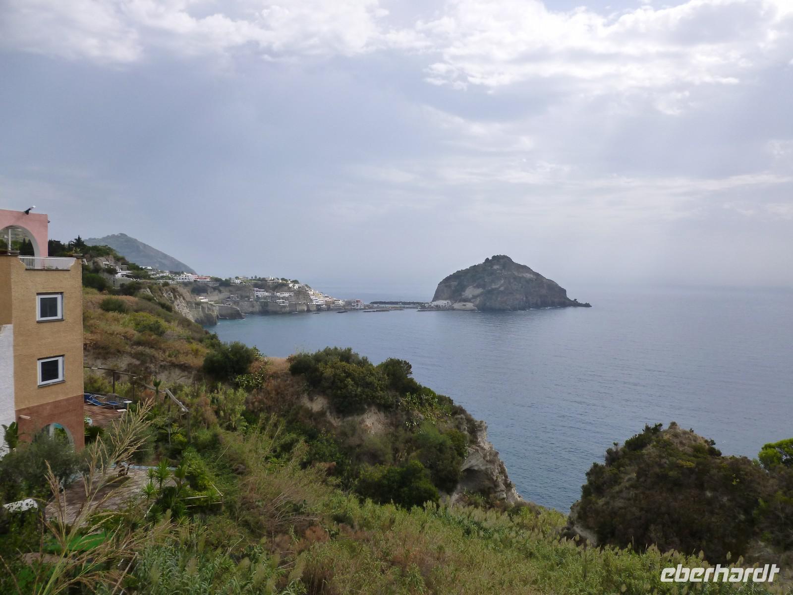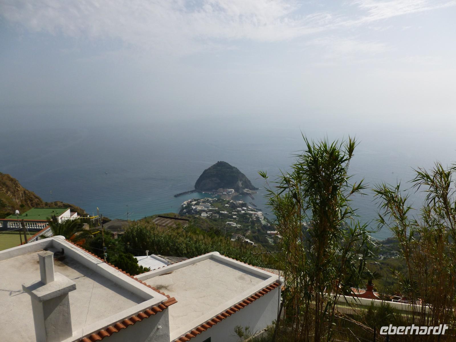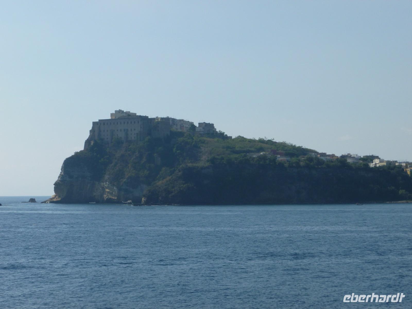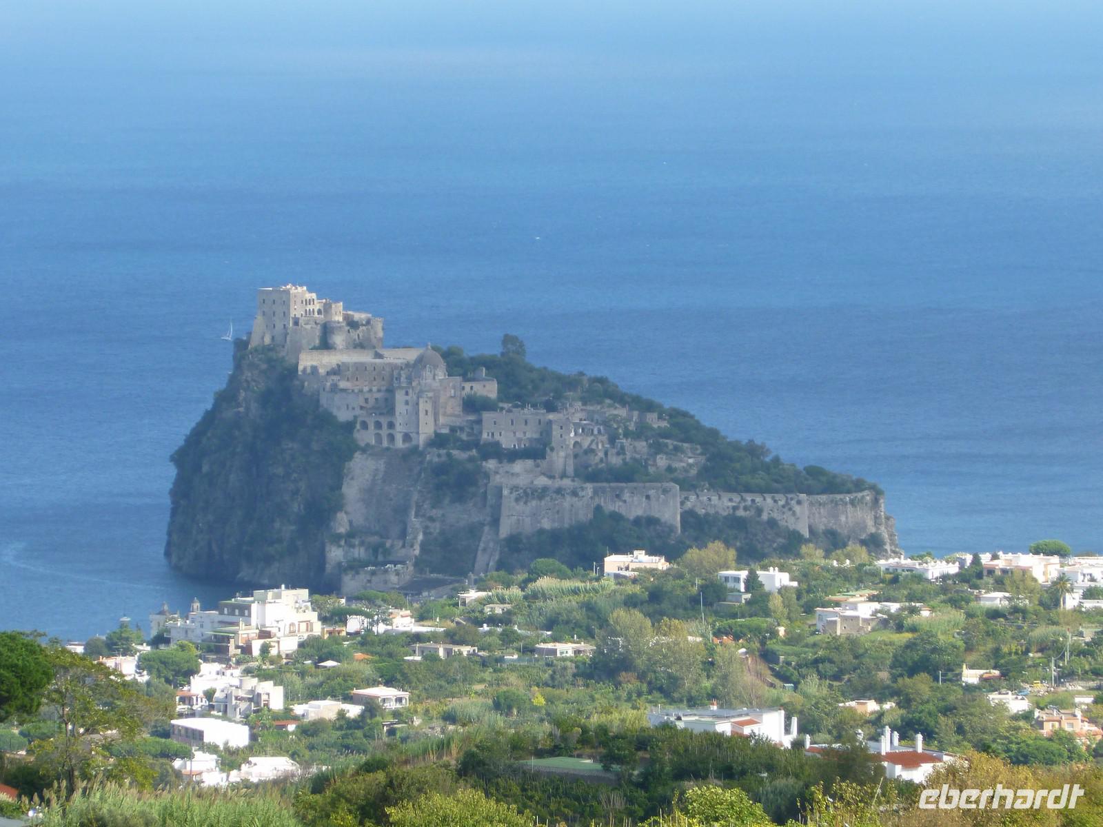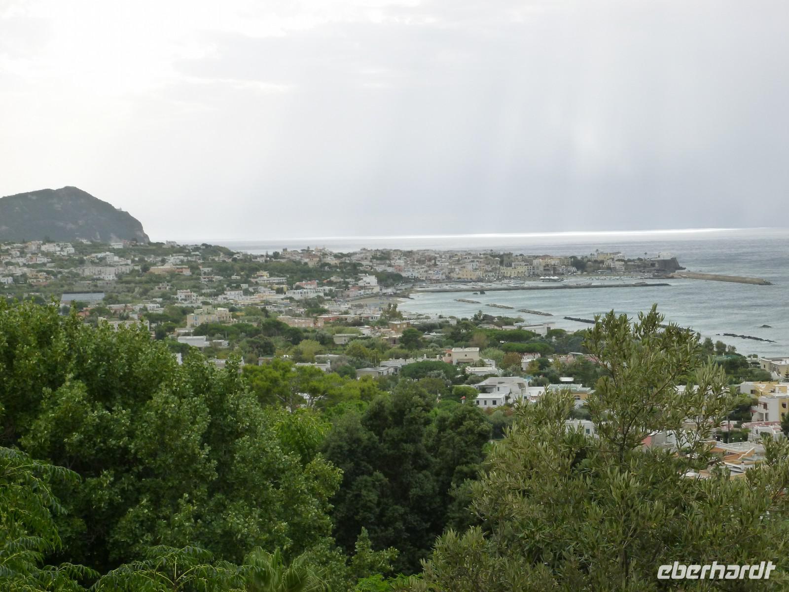 Nach einem ausgiebigen Frühstück holte uns Alberto am Hotel zur Inselrundfahrt ab. Mit dem Bus fuhren wir im Uhrzeigersinn einmal rund um die Insel: Von Forio ging es Richtung Norden nach Lacco Ameno, wo wir einen Fotostopp am Il Fungo, dem Felsmassiv in Form eines Pilzes einlegten. Danach ging es östlich nach Casamicciola Terme und Ischia Porto. Dann erblickten wir schon das Wahrzeichen Ischias, das Castello Aragonese. Nun ging es südlich weiter, an den Pilastri, dem Äquadukt, vorbei nach Barano und durch Buonopane. Hier sahen wir auch schon den Weg zur Nitrodiquelle. Auf dem Weg nach Westen mussten wir durch die Berge mit steilen und engen Kurven. In Fontana, Ischias höchstgelegenem Ort, gab es eine kleine Kaffee- oder besser Cappuccino-Pause und eine Kostprobe vom Limoncello, dem Likör aus Zitronenschalen. Weiter ging es über Serrara nach Sant Angelo. Es wurde hier gerade das Fest des Heiligen Michael mit Prozession und Feuerwerk gefeiert, als ein Gewitter niederging.