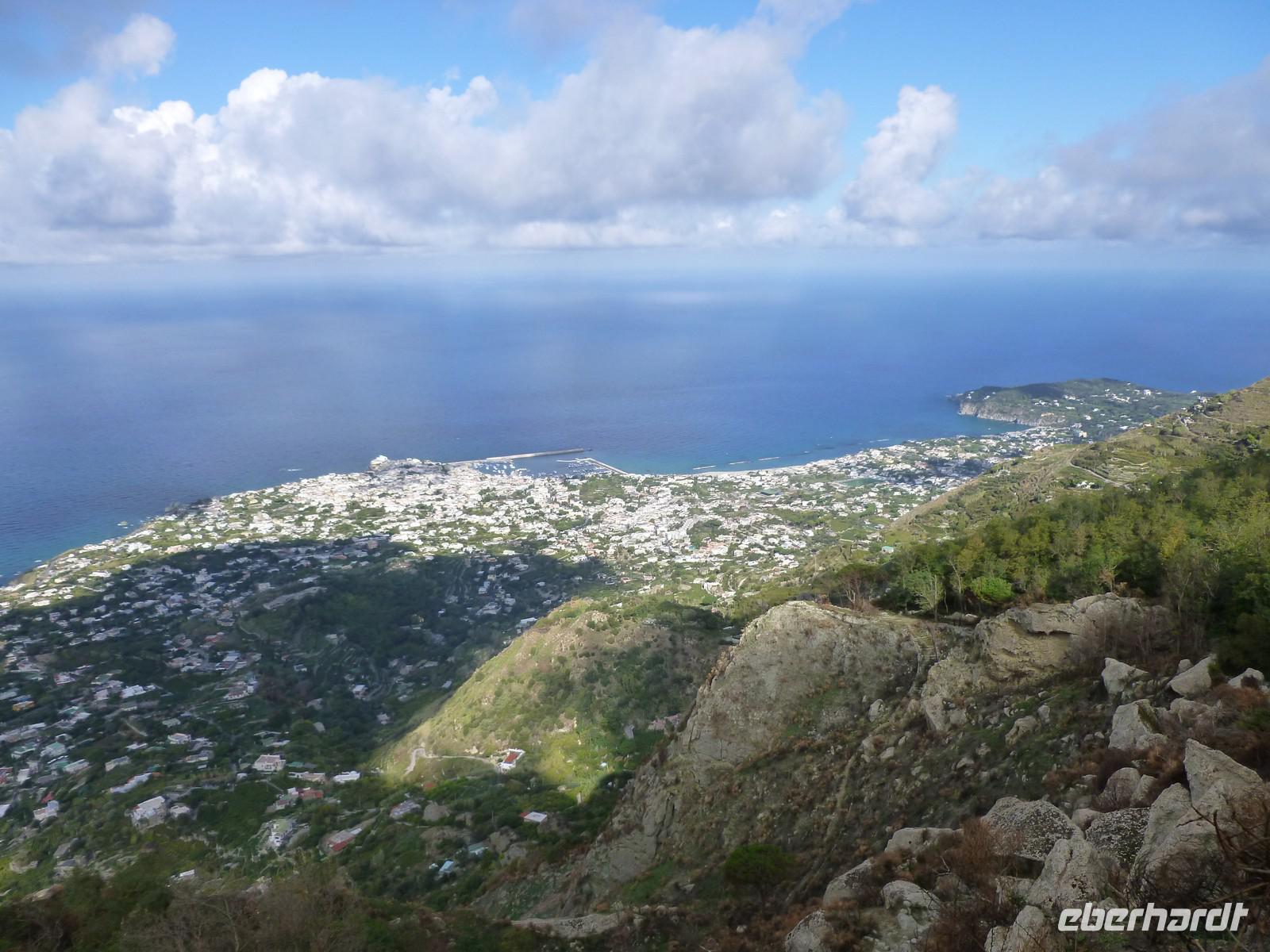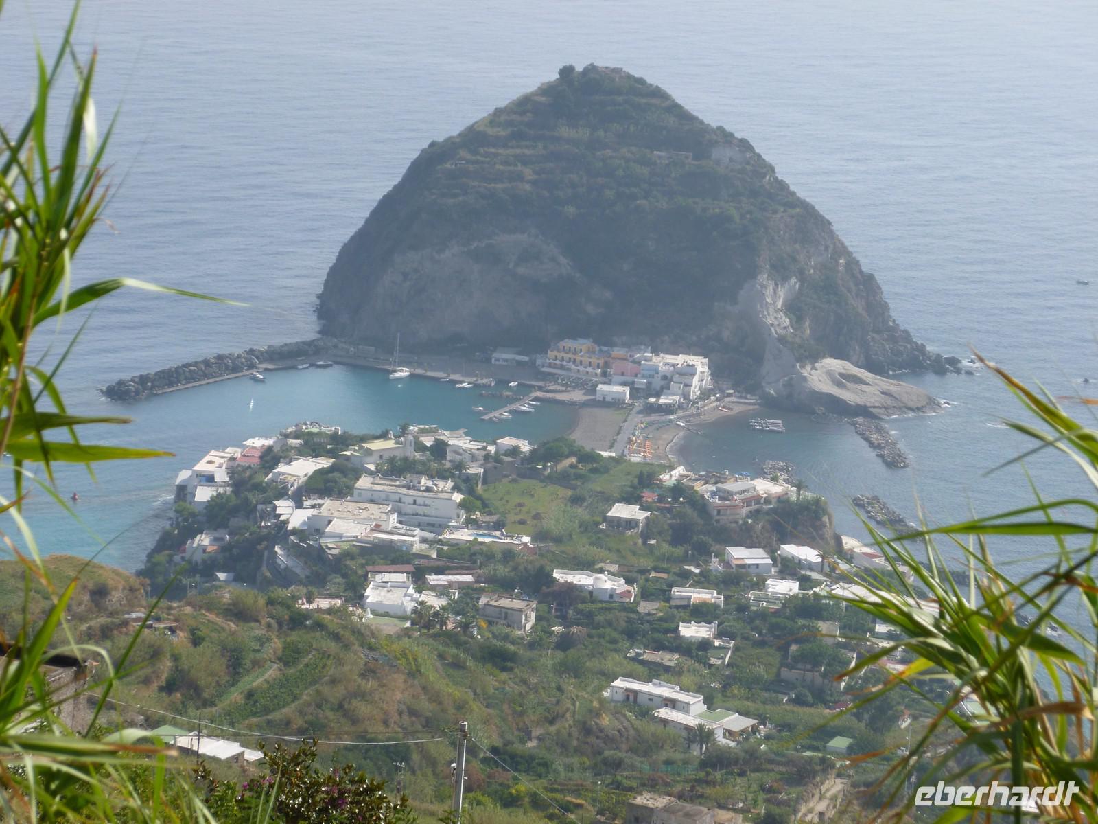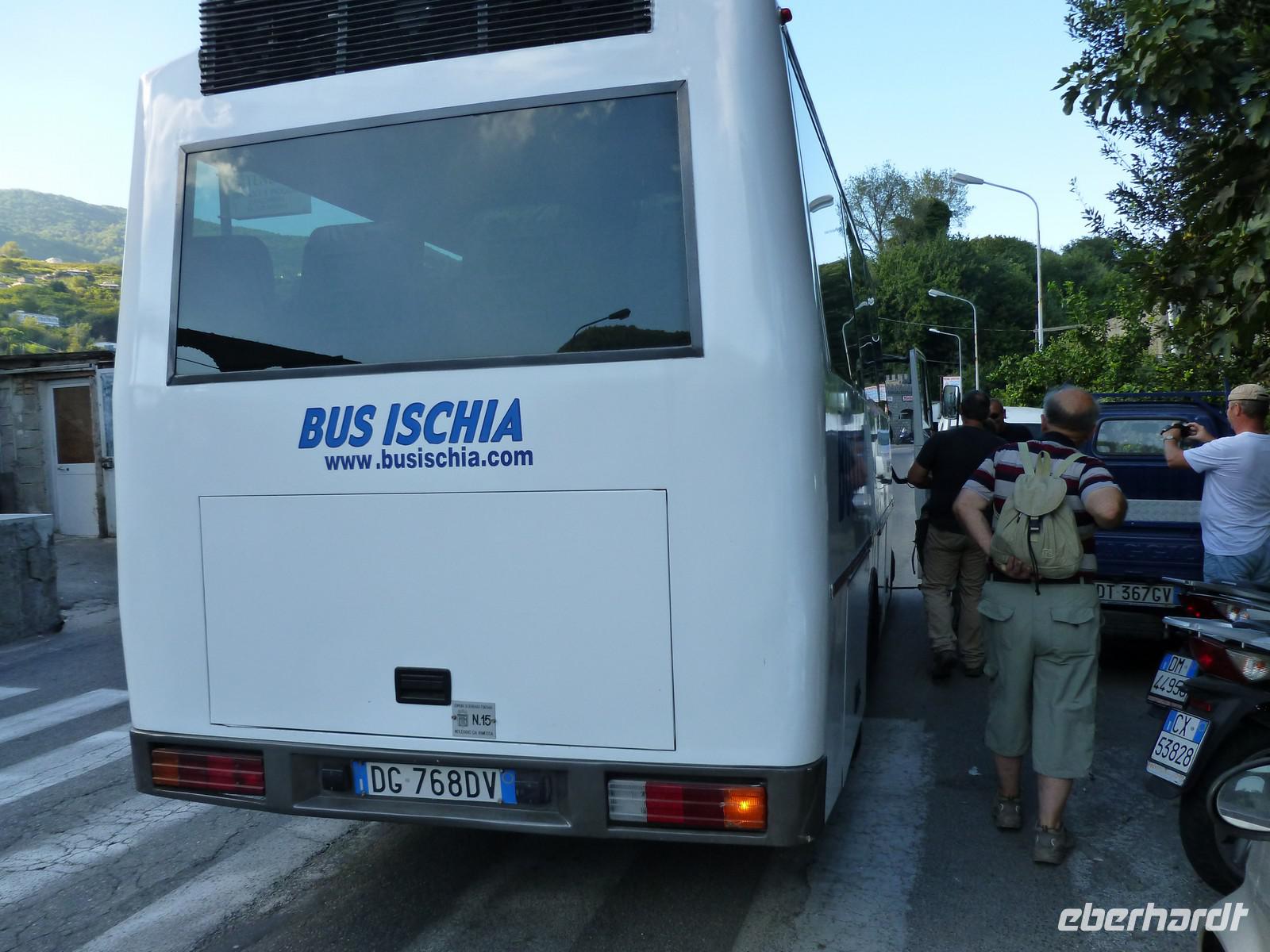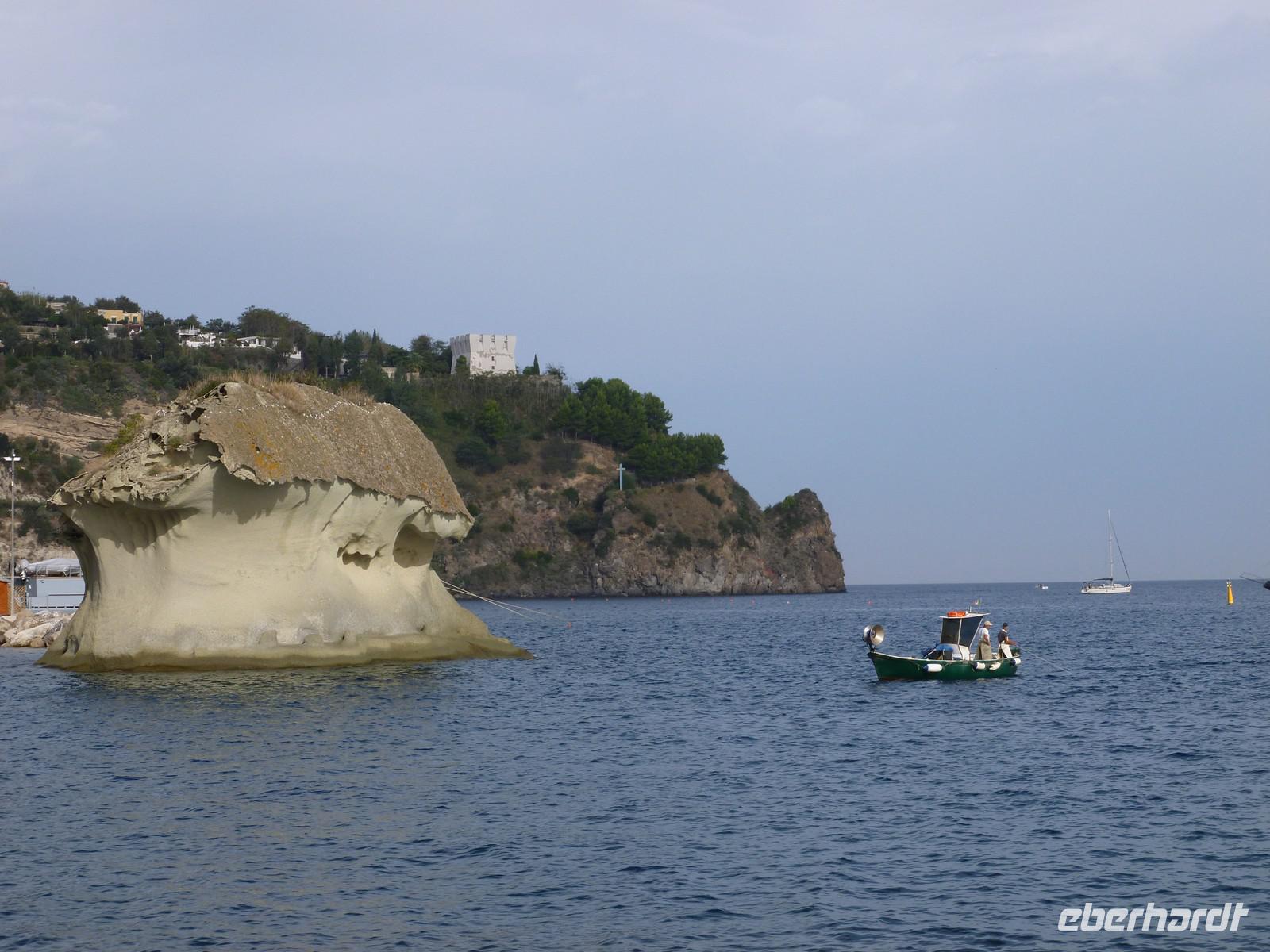 Nach einem ausgiebigen Frühstück holte uns Alberto am Hotel zur Inselrundfahrt ab. Mit dem Bus fuhren wir im Uhrzeigersinn einmal rund um die Insel: Von Forio ging es Richtung Norden nach Lacco Ameno, wo wir einen Fotostopp am Il Fungo, dem Felsmassiv in Form eines Pilzes einlegten. Danach ging es östlich nach Casamicciola Terme und Ischia Porto. Dann erblickten wir schon das Wahrzeichen Ischias, das Castello Aragonese. Nun ging es südlich weiter, an den Pilastri, dem Äquadukt, vorbei nach Barano und durch Buonopane. Hier sahen wir auch schon den Weg zur Nitrodiquelle. Auf dem Weg nach Westen mussten wir durch die Berge mit steilen und engen Kurven. In Fontana, Ischias höchstgelegenem Ort, gab es eine kleine Kaffee- oder besser Cappuccino-Pause und eine Kostprobe vom Limoncello, dem Likör aus Zitronenschalen. Weiter ging es über Serrara nach Sant Angelo. Es wurde hier gerade das Fest des Heiligen Michael mit Prozession und Feuerwerk gefeiert, als ein Gewitter niederging.